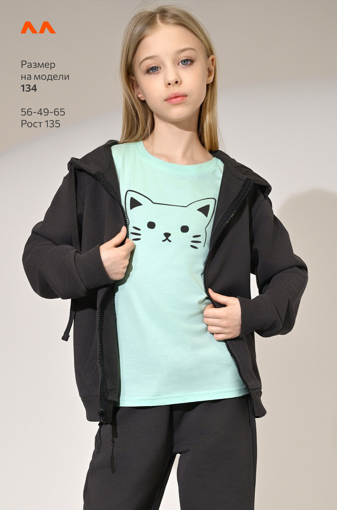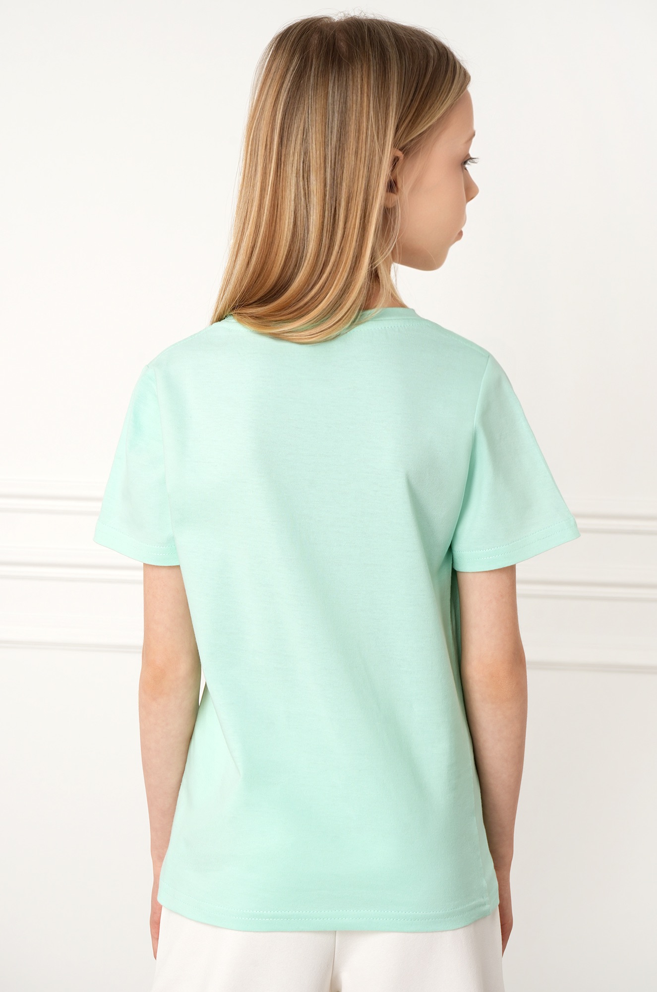 Детская футболка для девочки и девочки-подростка выполнена из 100% хлопка и представлена в нежном ментоловом цвете. Летняя модель украшена милым рисунком.