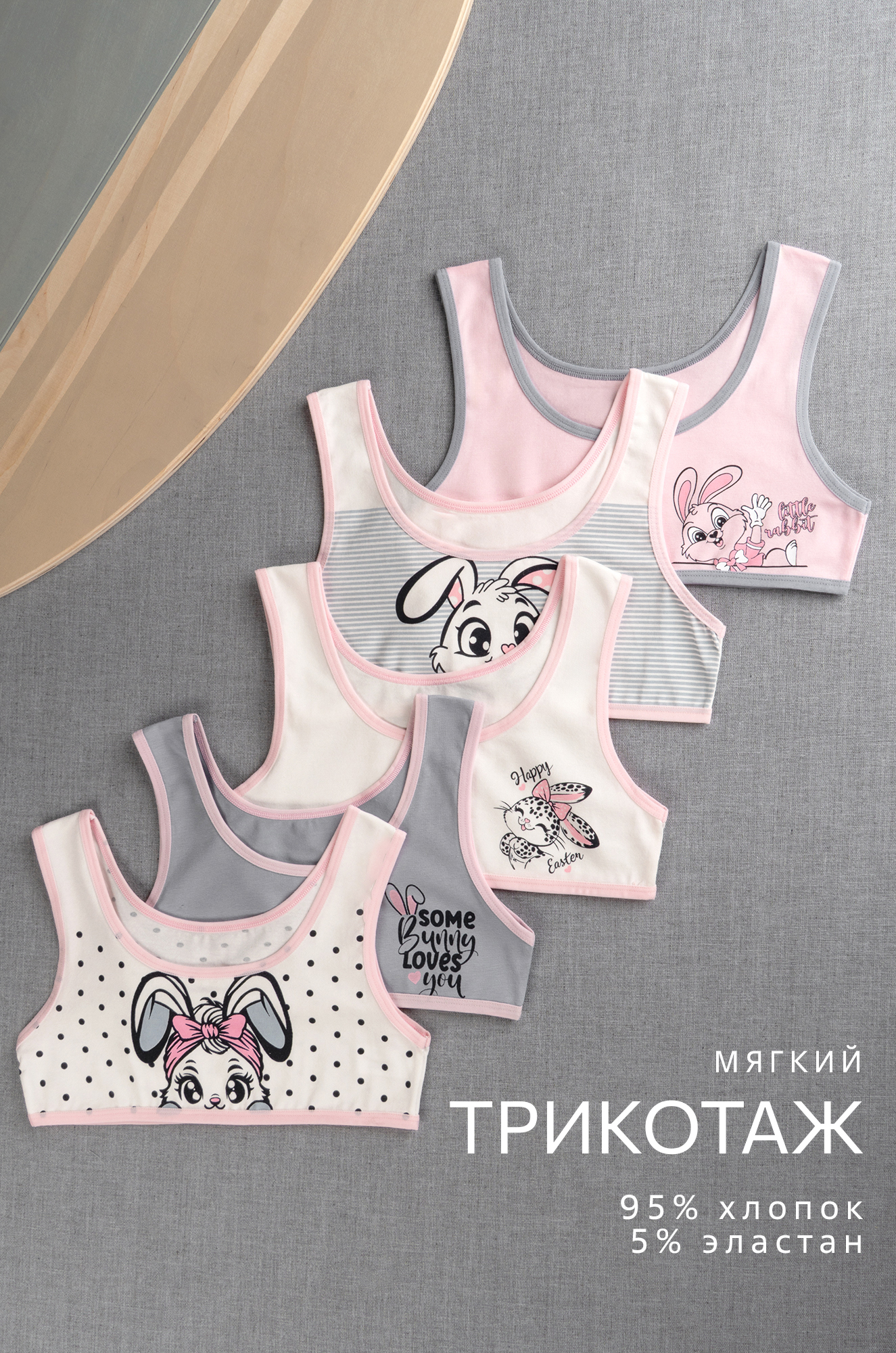 Погрузитесь в мир нежности и комфорта с набором детских топов! Милые топики с принтом Зайчик для девочки и девочки-подростка выполнены из мягкого хлопкового трикотажа, в наборе 5 шт. разных вариантов.
