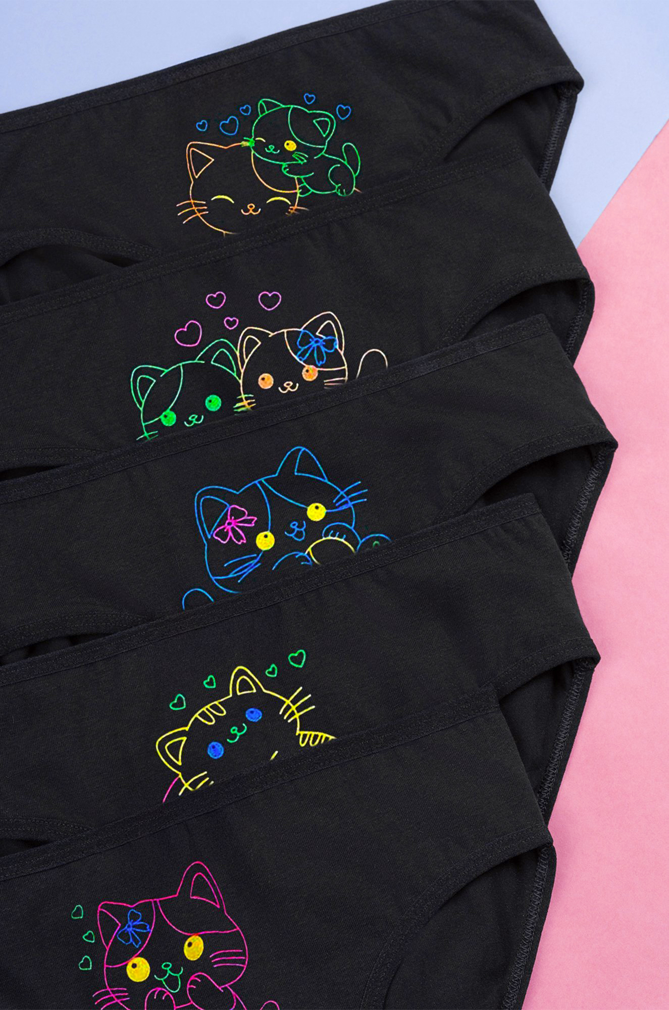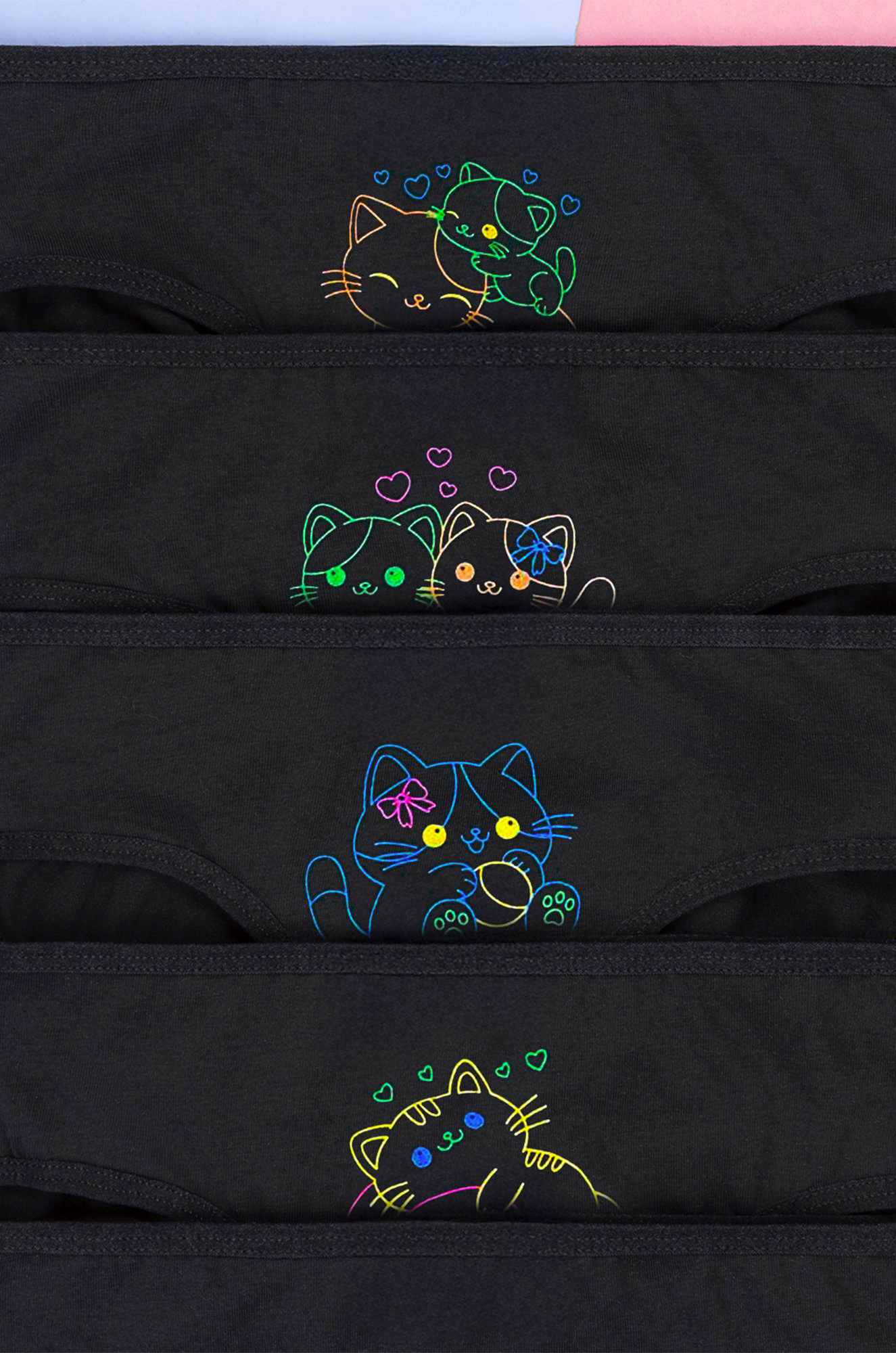 Набор детских трусов слипов 5 шт. для девочки выполнен из мягкого дышащего хлопка – отличный выбор на каждый день! Базовые трусики для детей представлены в черном цвете и украшены принтом Котята.