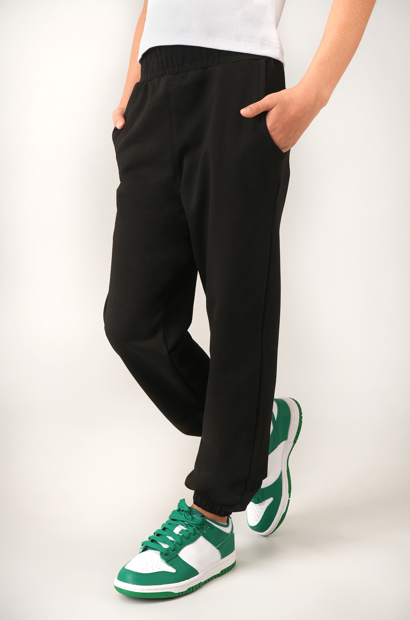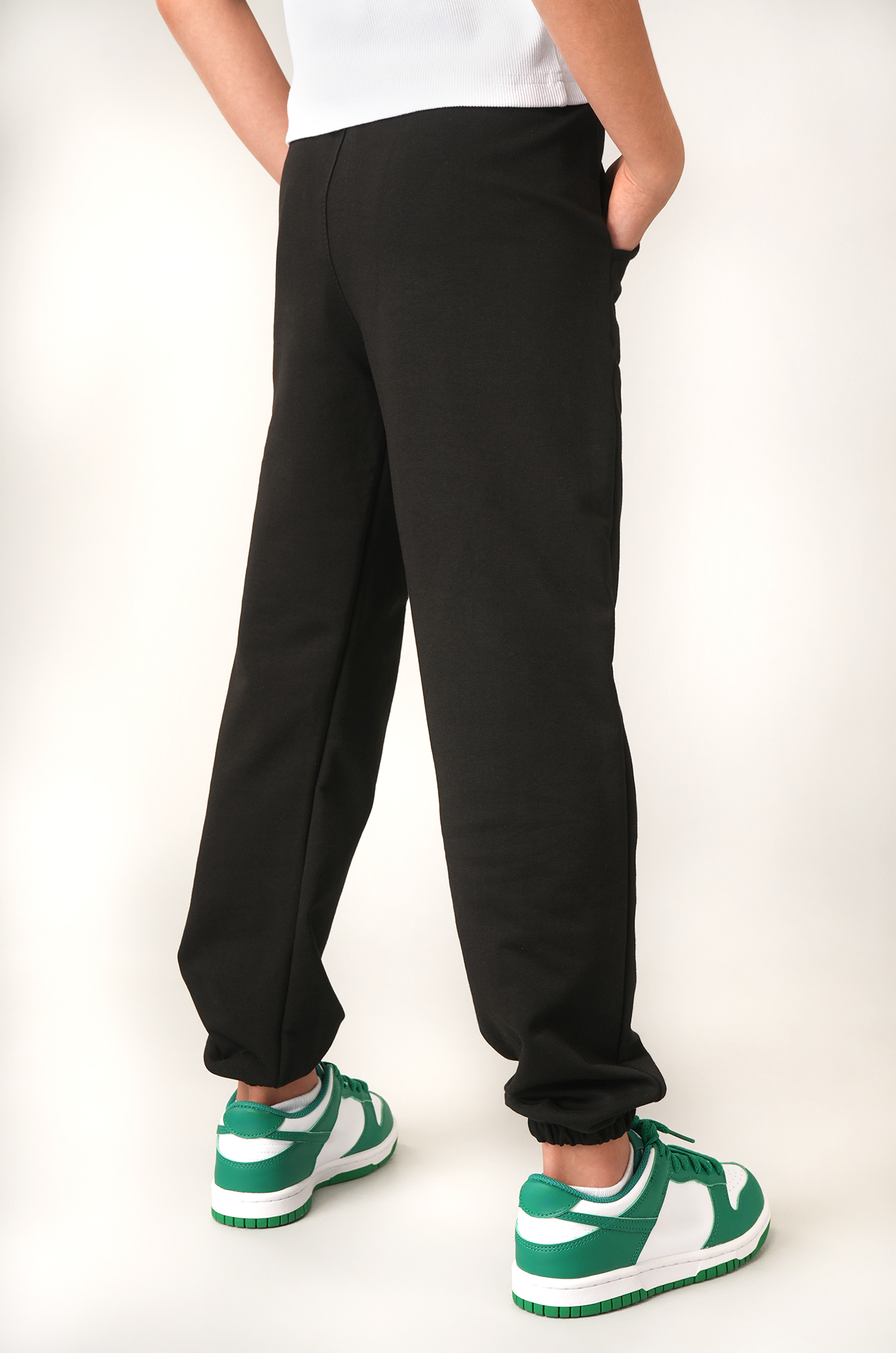 Черные брюки джоггеры для девочки и девочки подростка выполнены из мягкого и приятного к телу хлопкового трикотажа футера. Благодаря свободному крою и эластичному поясу спортивные штаны не стесняют движения. По бокам расположены удобные карманы, по низу штанины собраны на резинку. Однотонные брюки с высокой посадкой подчеркнут фигуру.