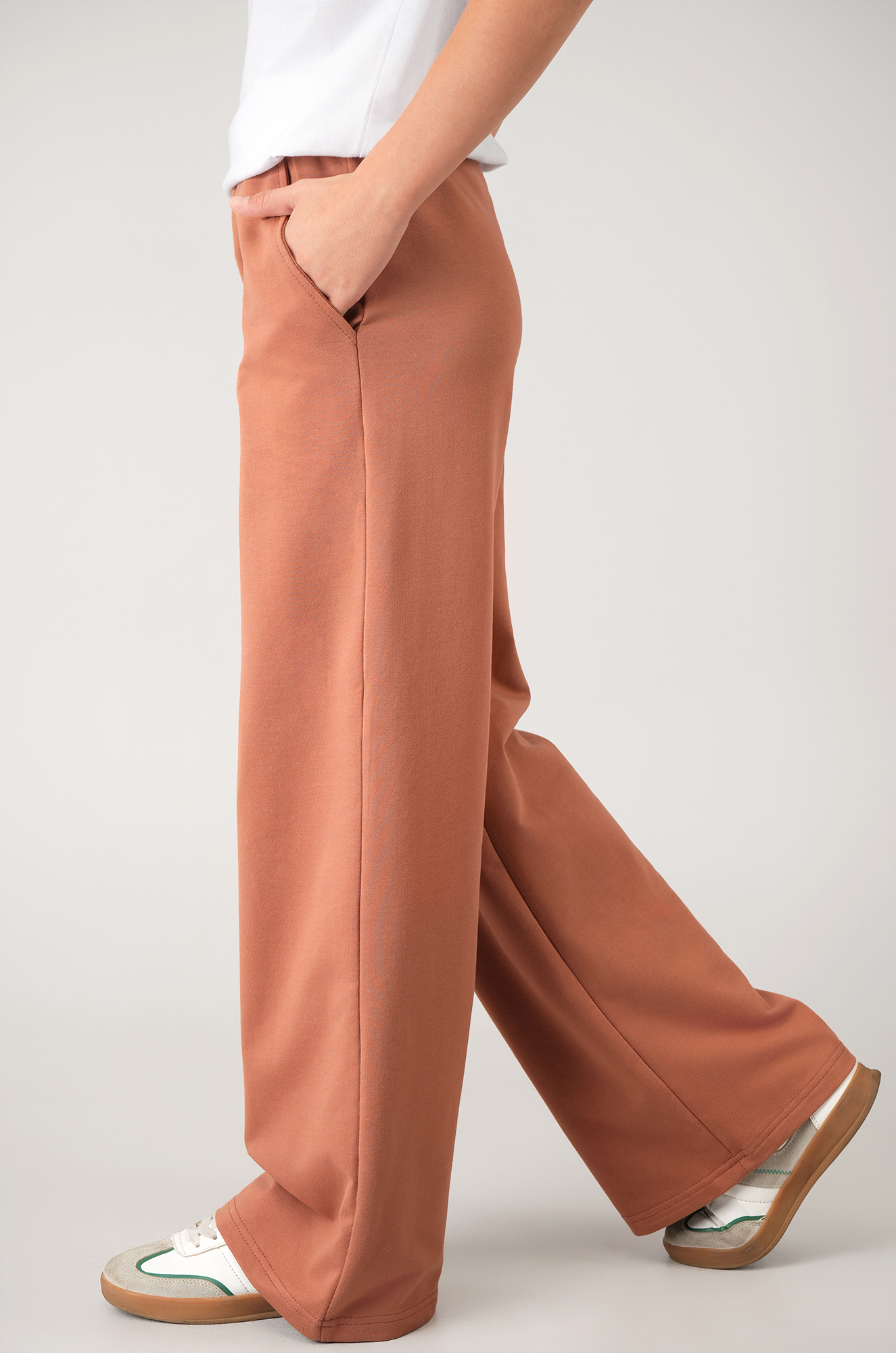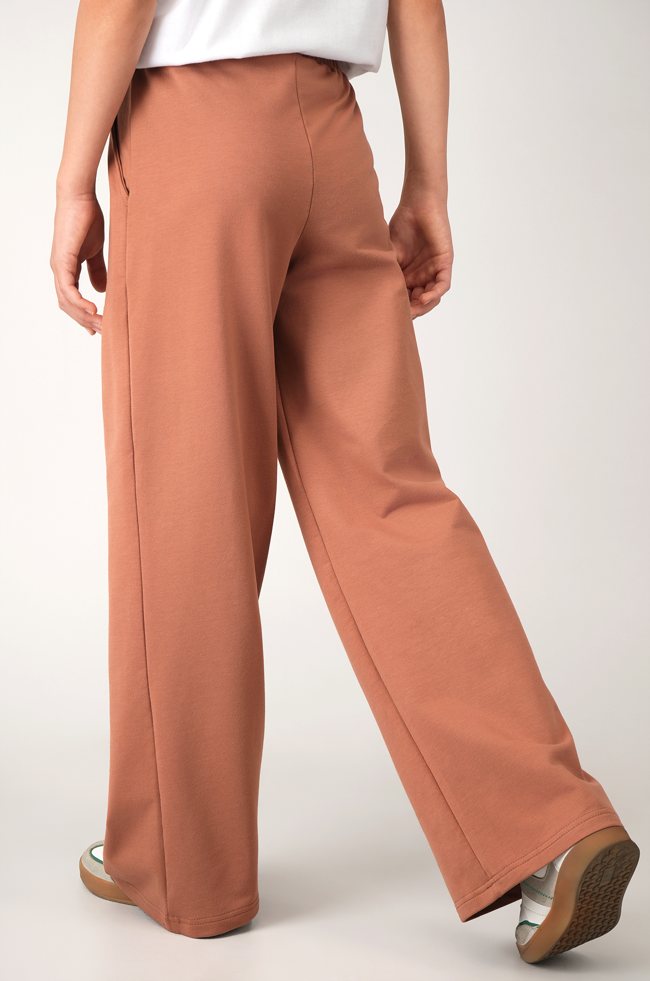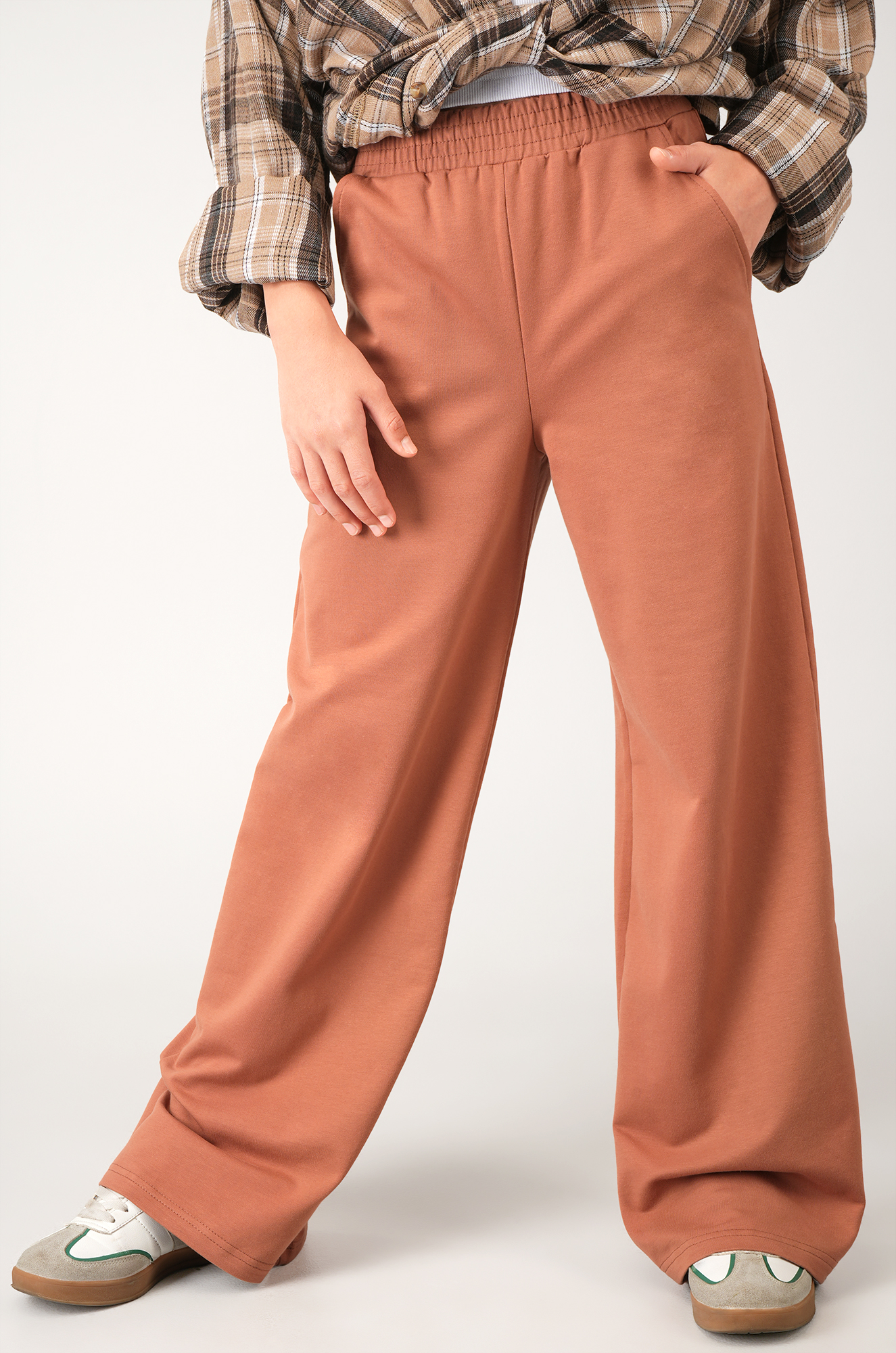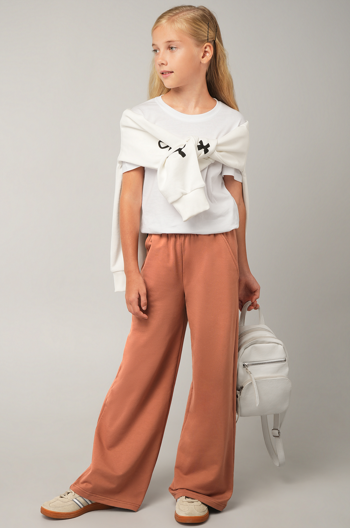 Широкие штаны палаццо цвета мокко подойдут как на каждый день, так и для дома, создавая аккуратный и стильный образ. Лаконичный фасон базовых детских брюк всегда остается удобным и современным.