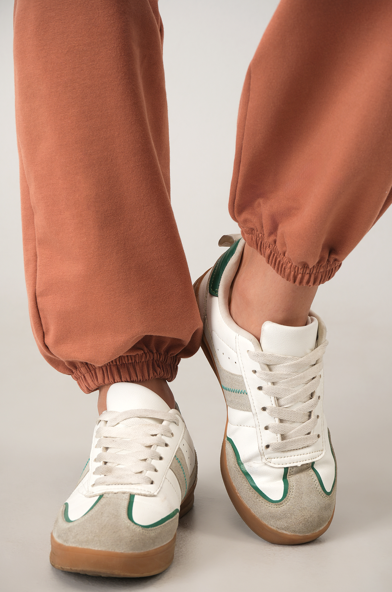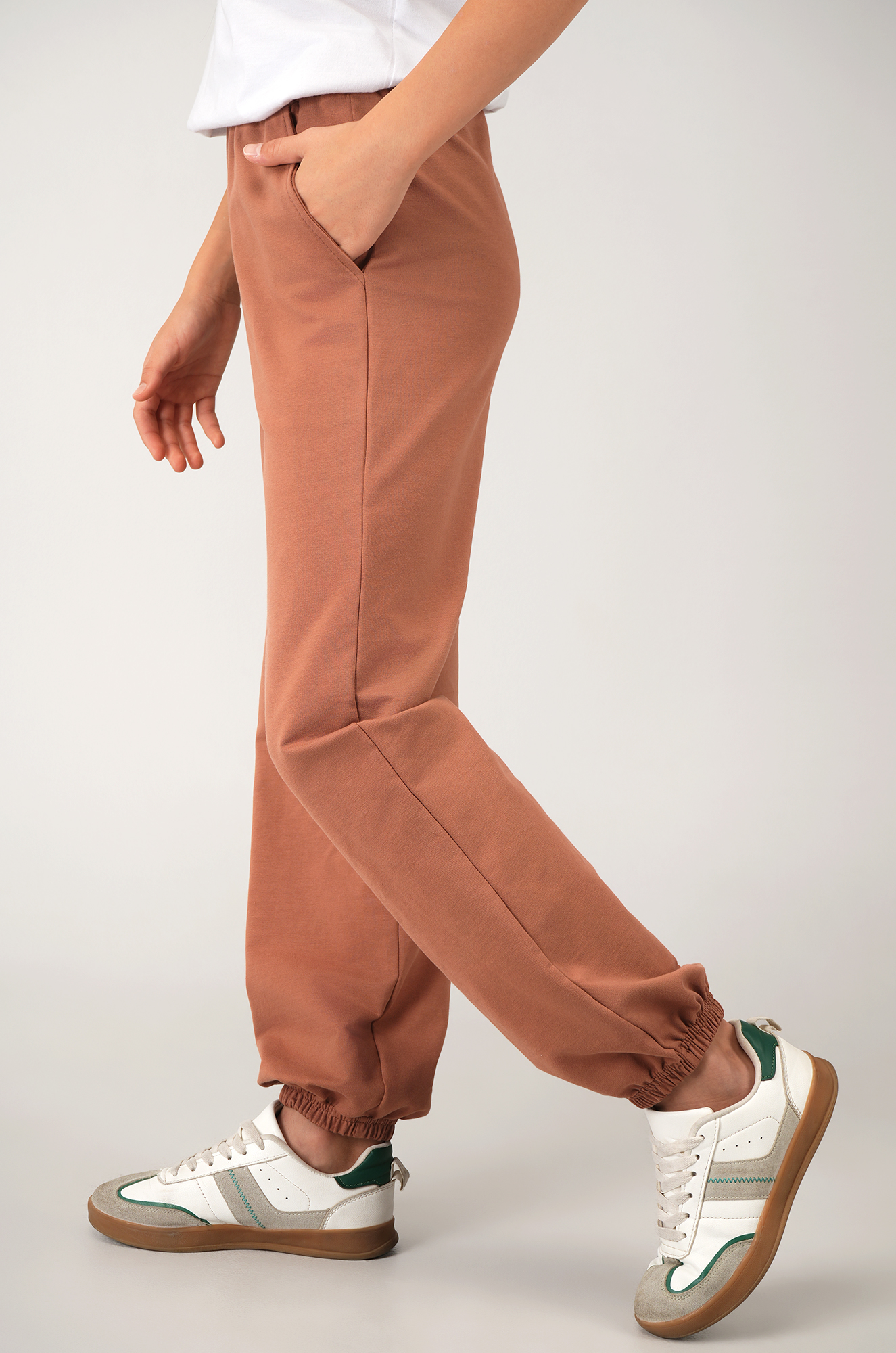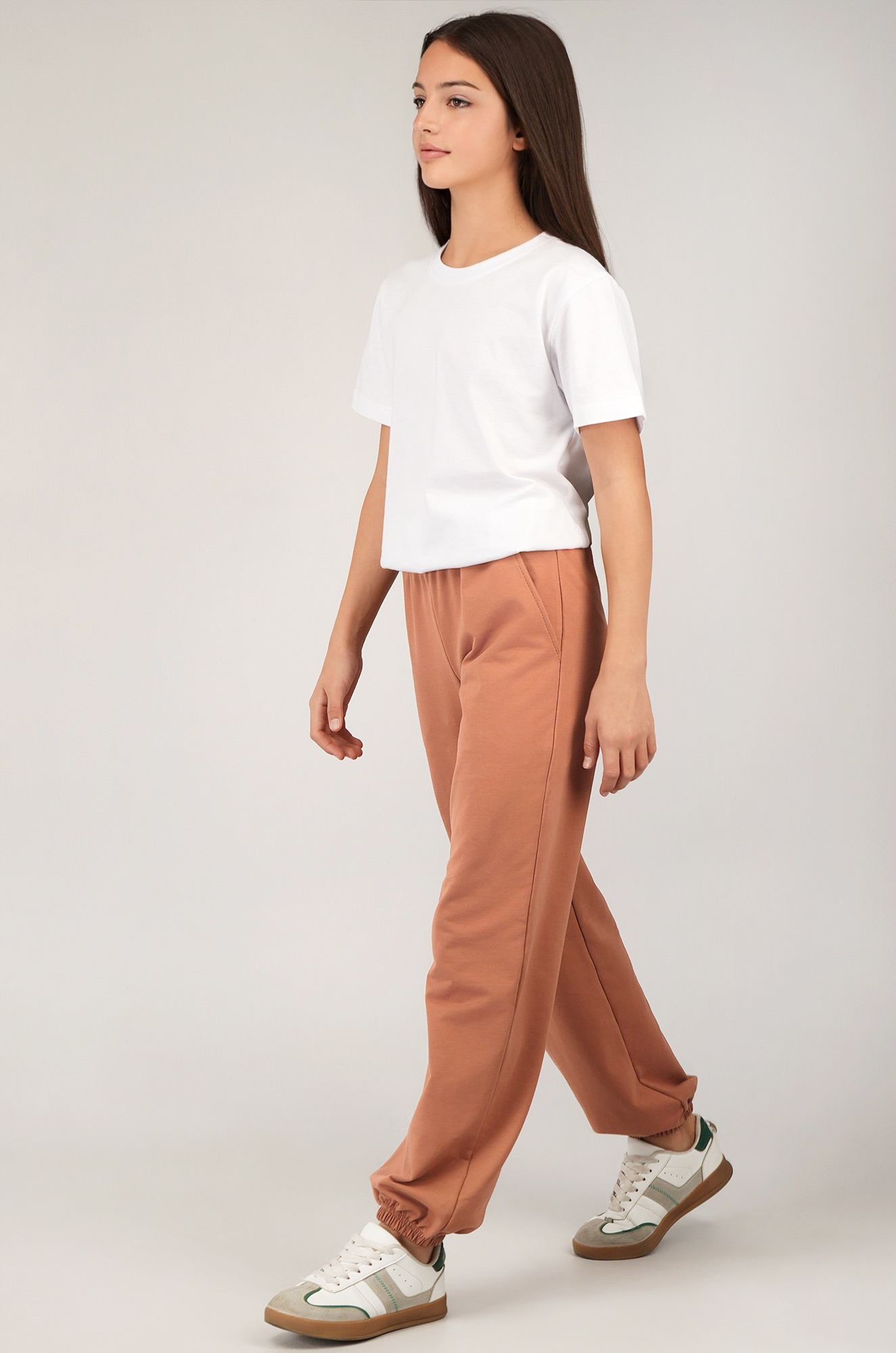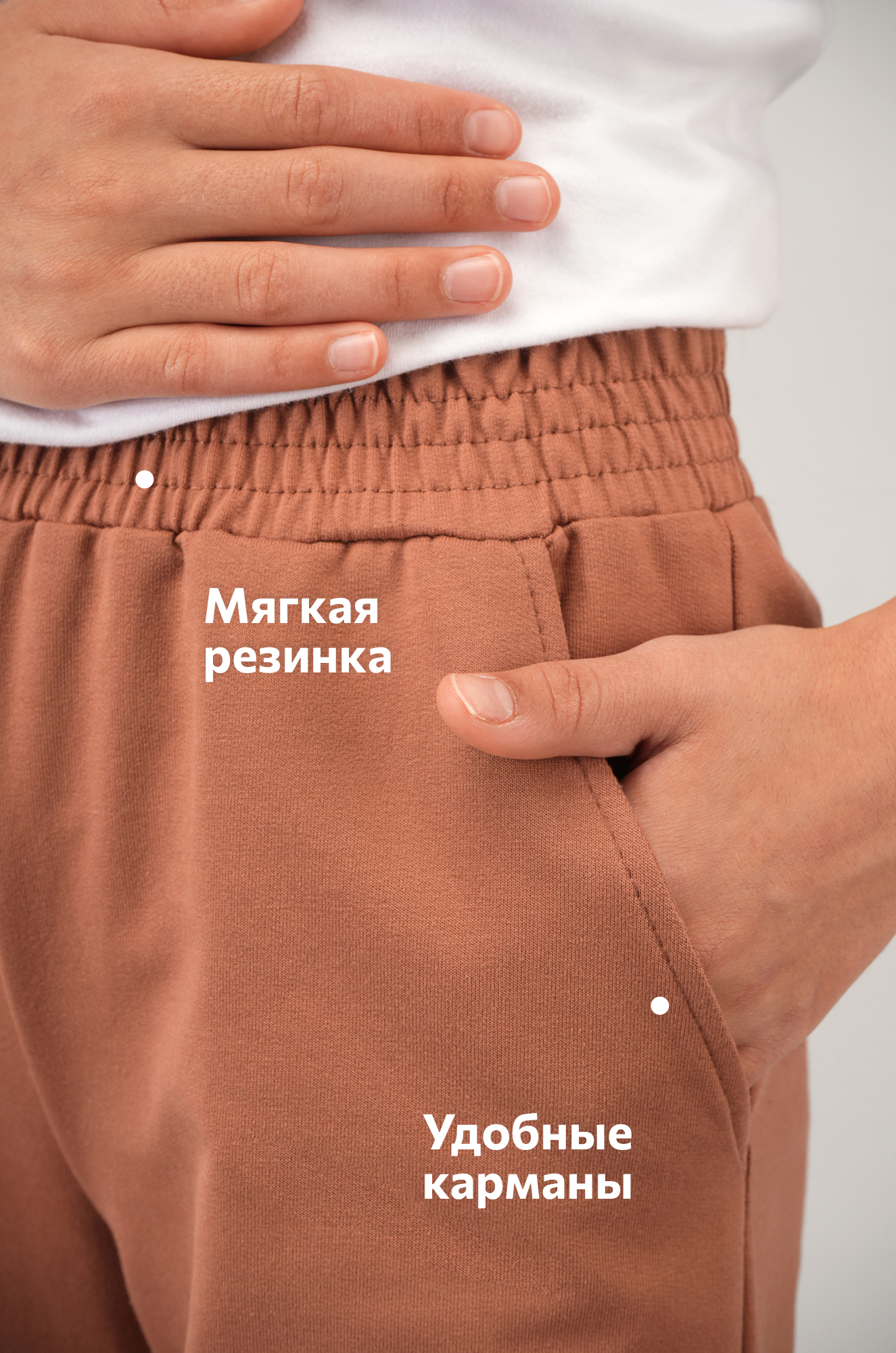 Однотонные коричневые брюки джоггеры с высокой посадкой — это практичный базовый вариант для школьной физкультуры, спортивных секций или активного отдыха. Трикотажные штаны сохраняют комфорт и идеально подойдут для детей, когда важны и стиль, и удобство.