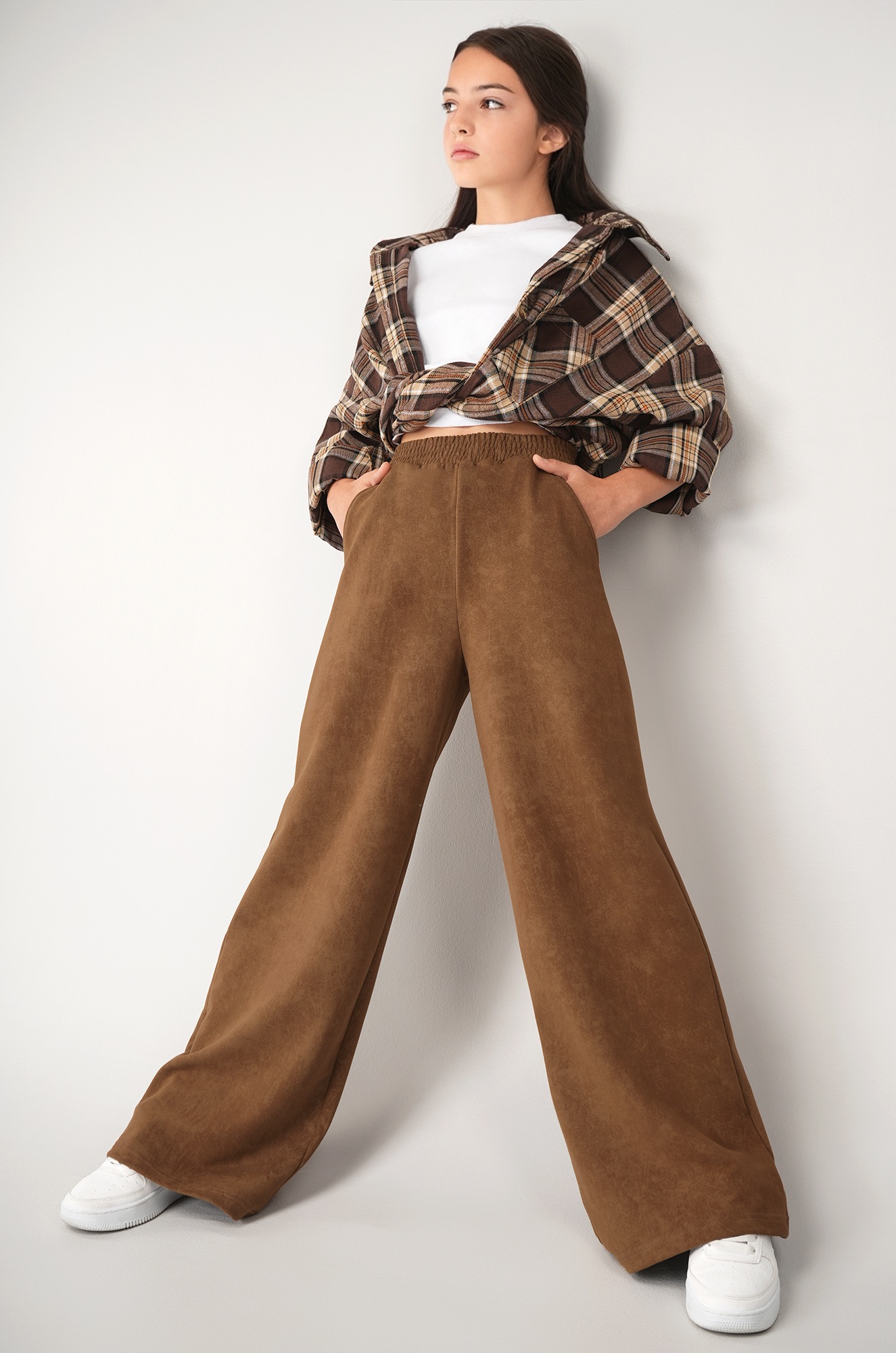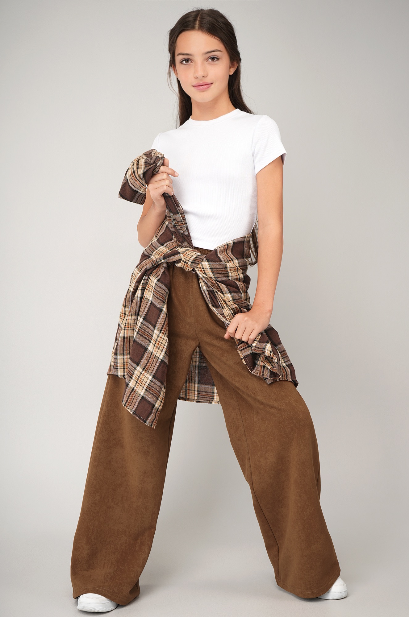 Широкие штаны палаццо подойдут для физкультуры в школе, создавая аккуратный и стильный образ. Брюки с вареным эффектом идеальны на каждый день.