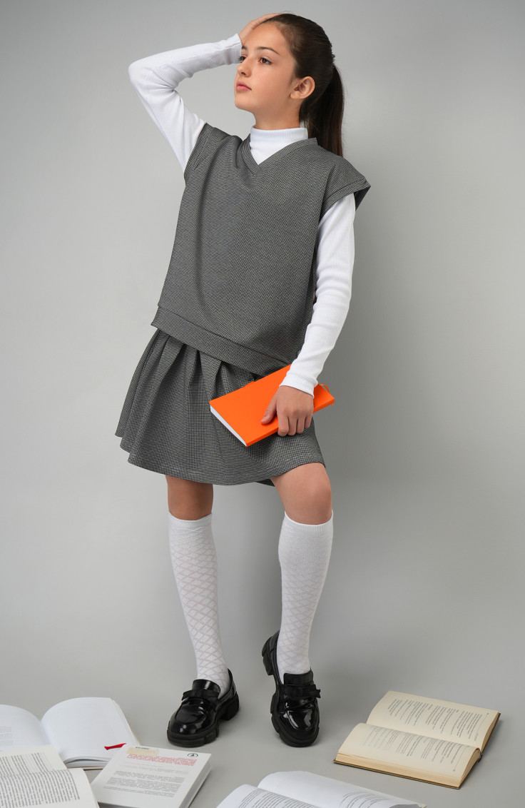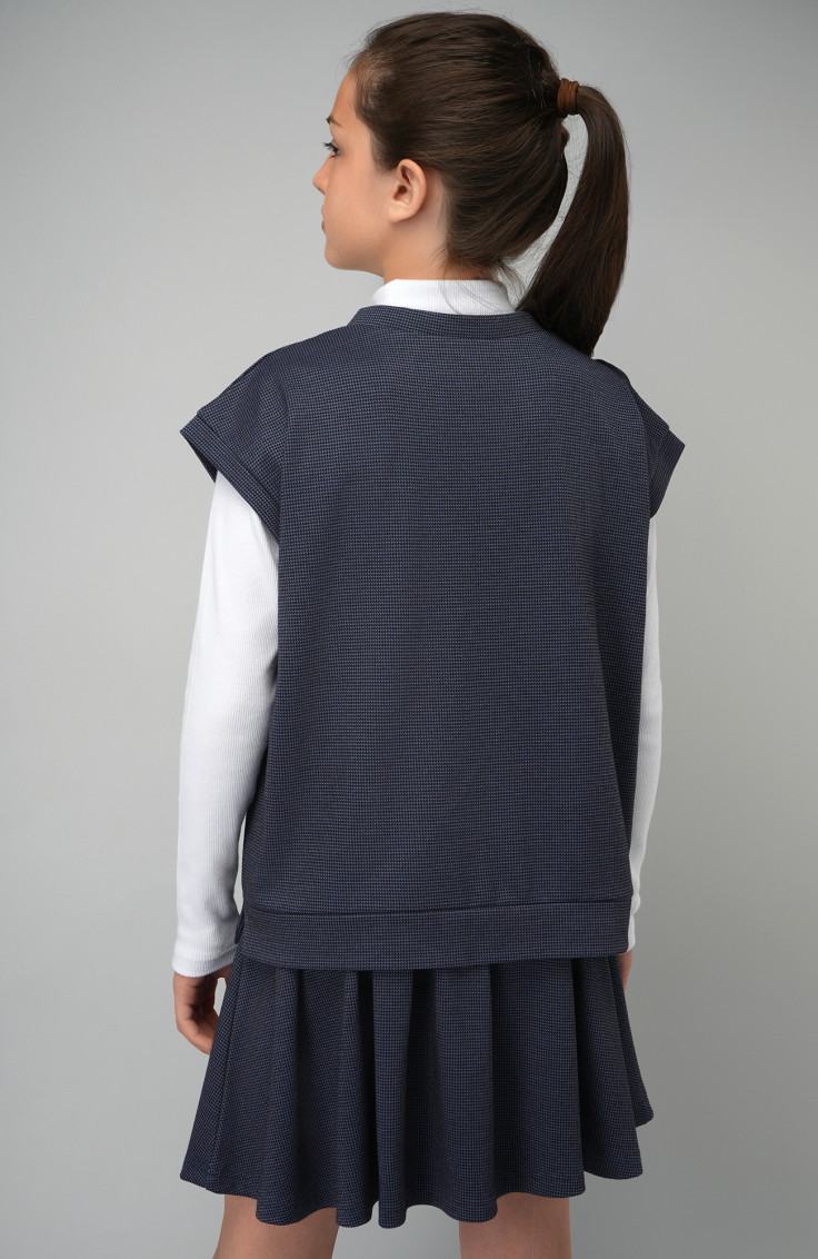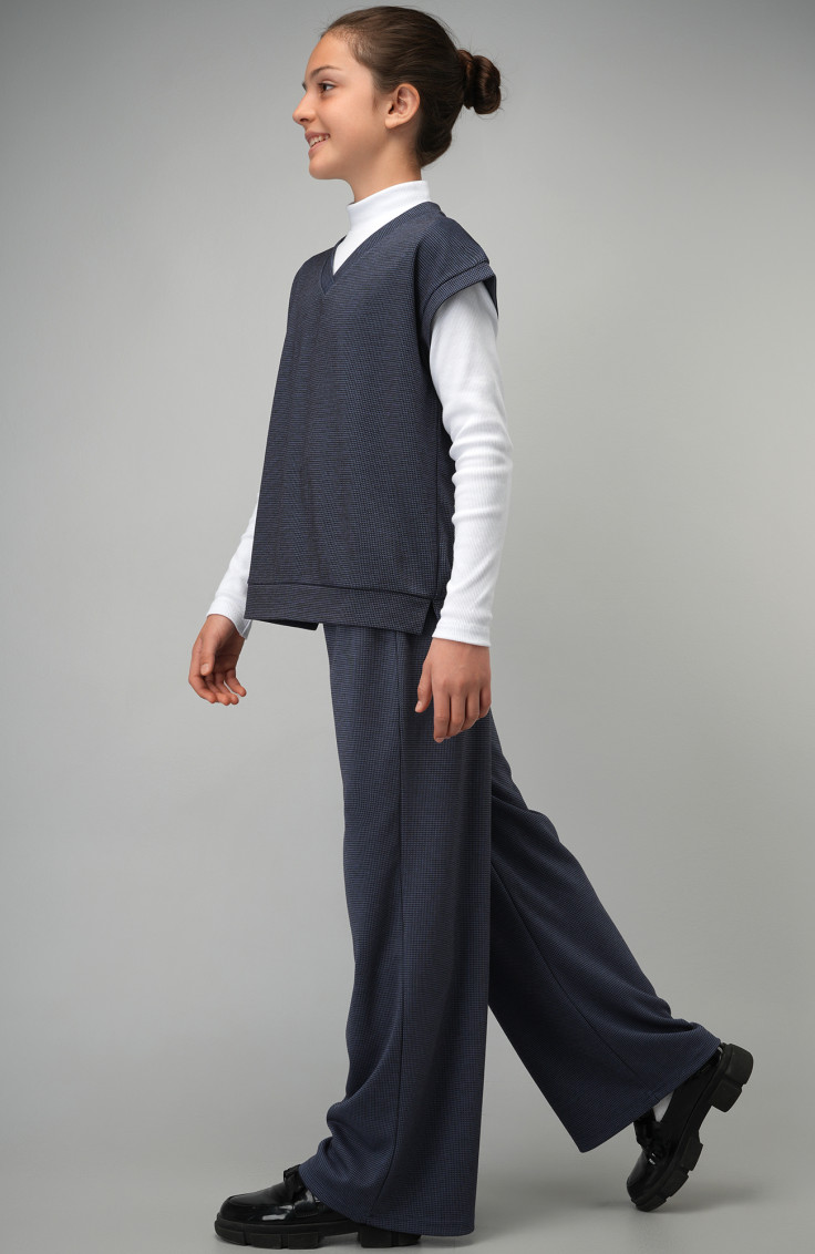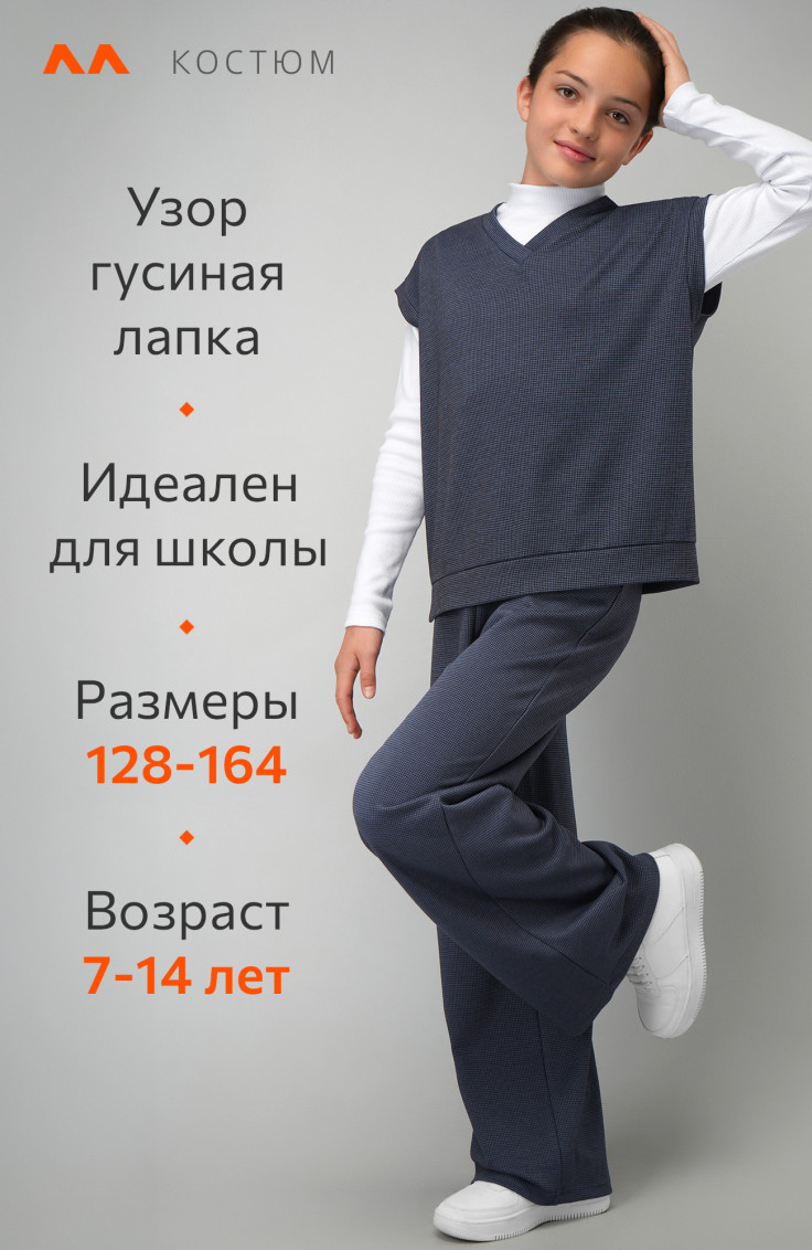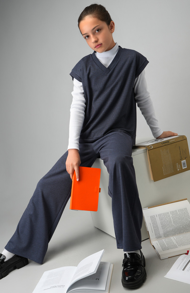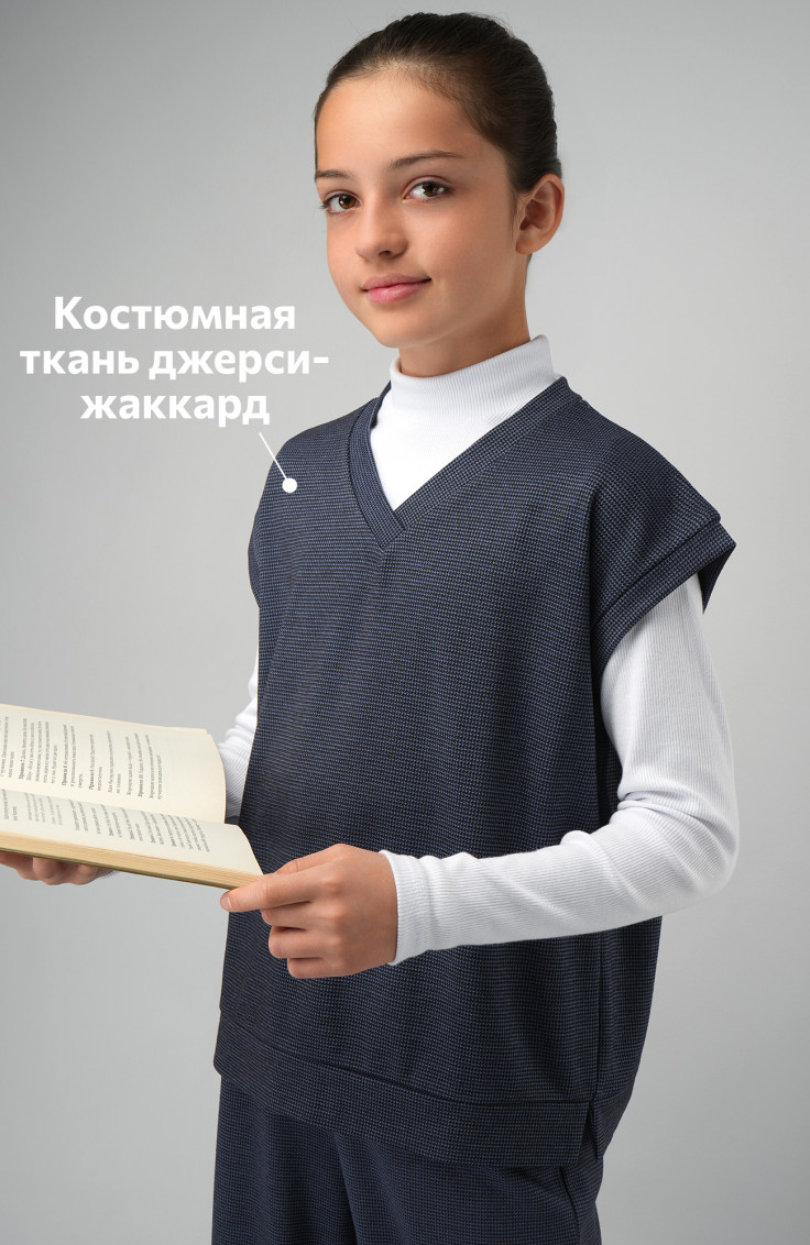 Элегантный костюм-двойка состоит из двух базовых моделей: прямых брюк и оригинального приталенного жилета. Демисезонные костюмы идеальны для занятий в школе.