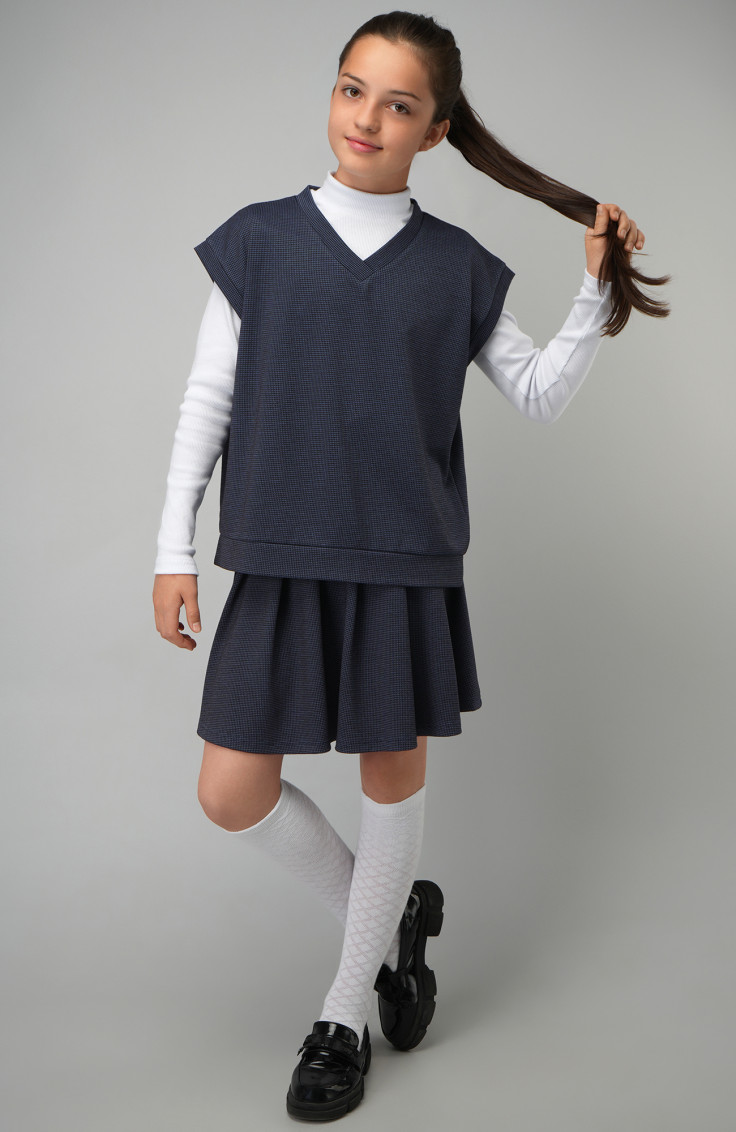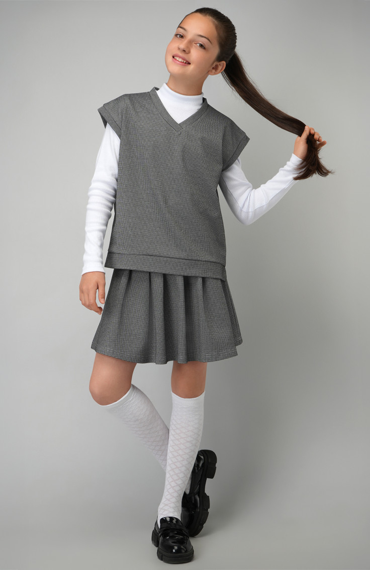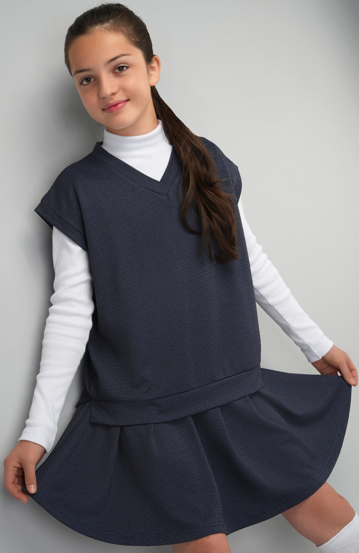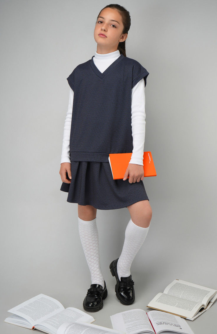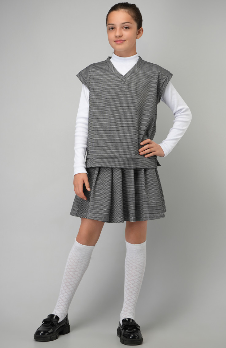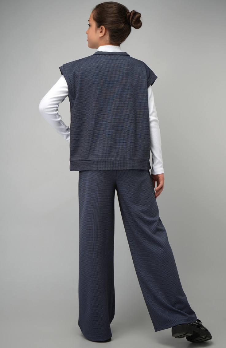 Элегантный костюм-двойка состоит из двух базовых моделей: прямых брюк и оригинального приталенного жилета. Демисезонные костюмы идеальны для занятий в школе.
