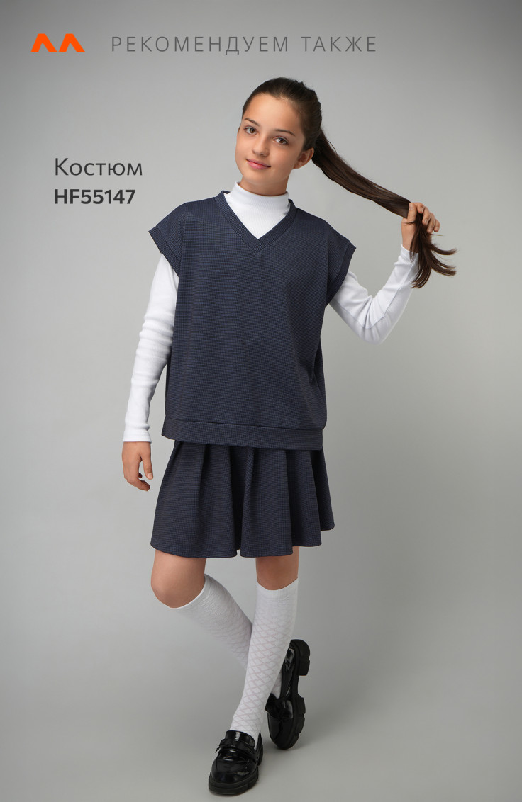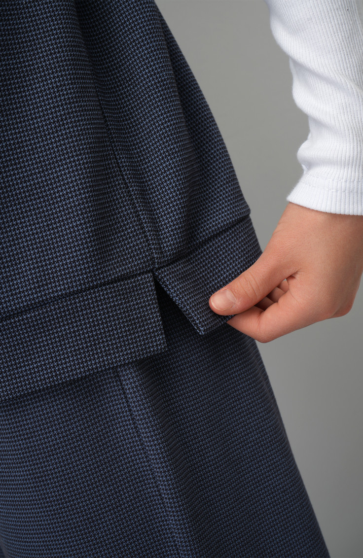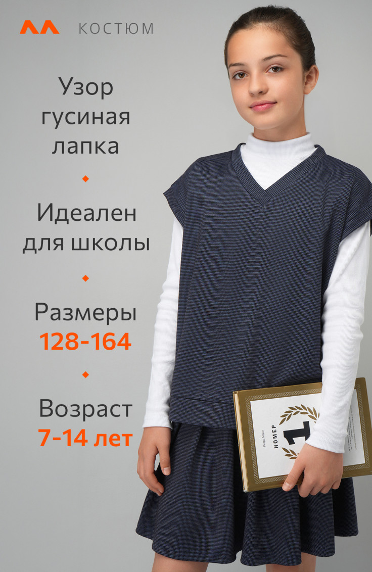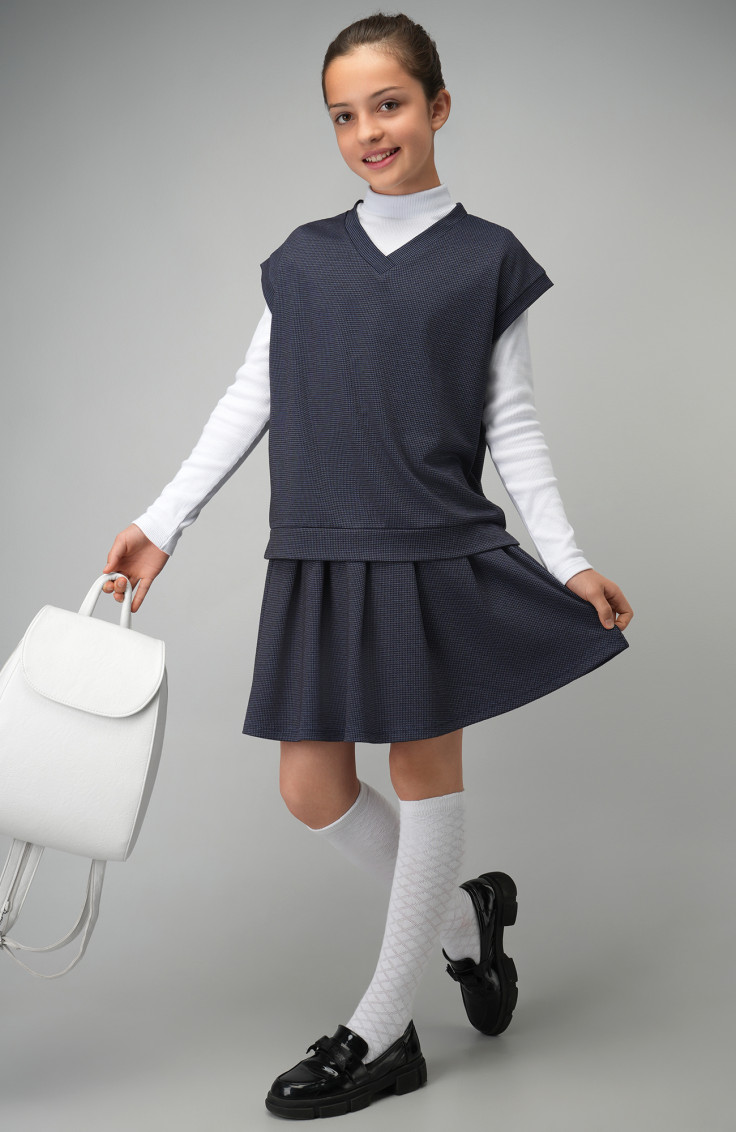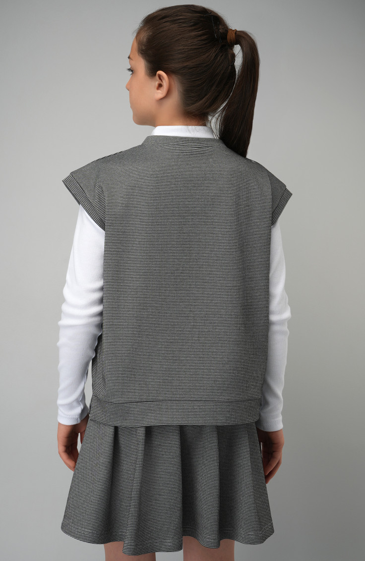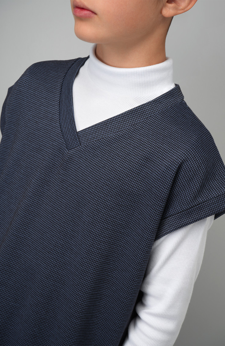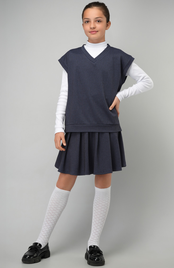 Элегантный костюм-двойка состоит из двух базовых моделей: прямых брюк и оригинального приталенного жилета. Демисезонные костюмы идеальны для занятий в школе.