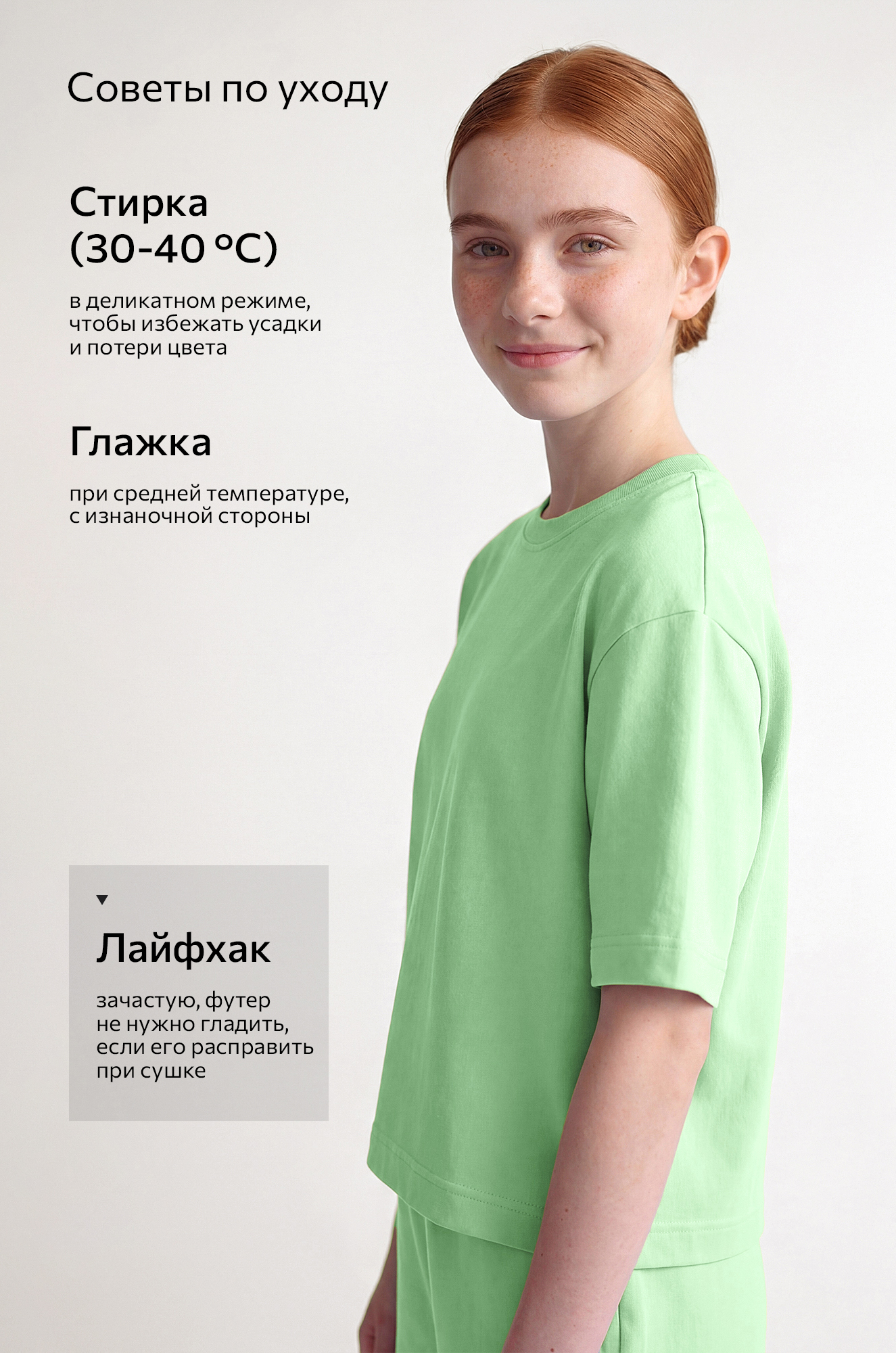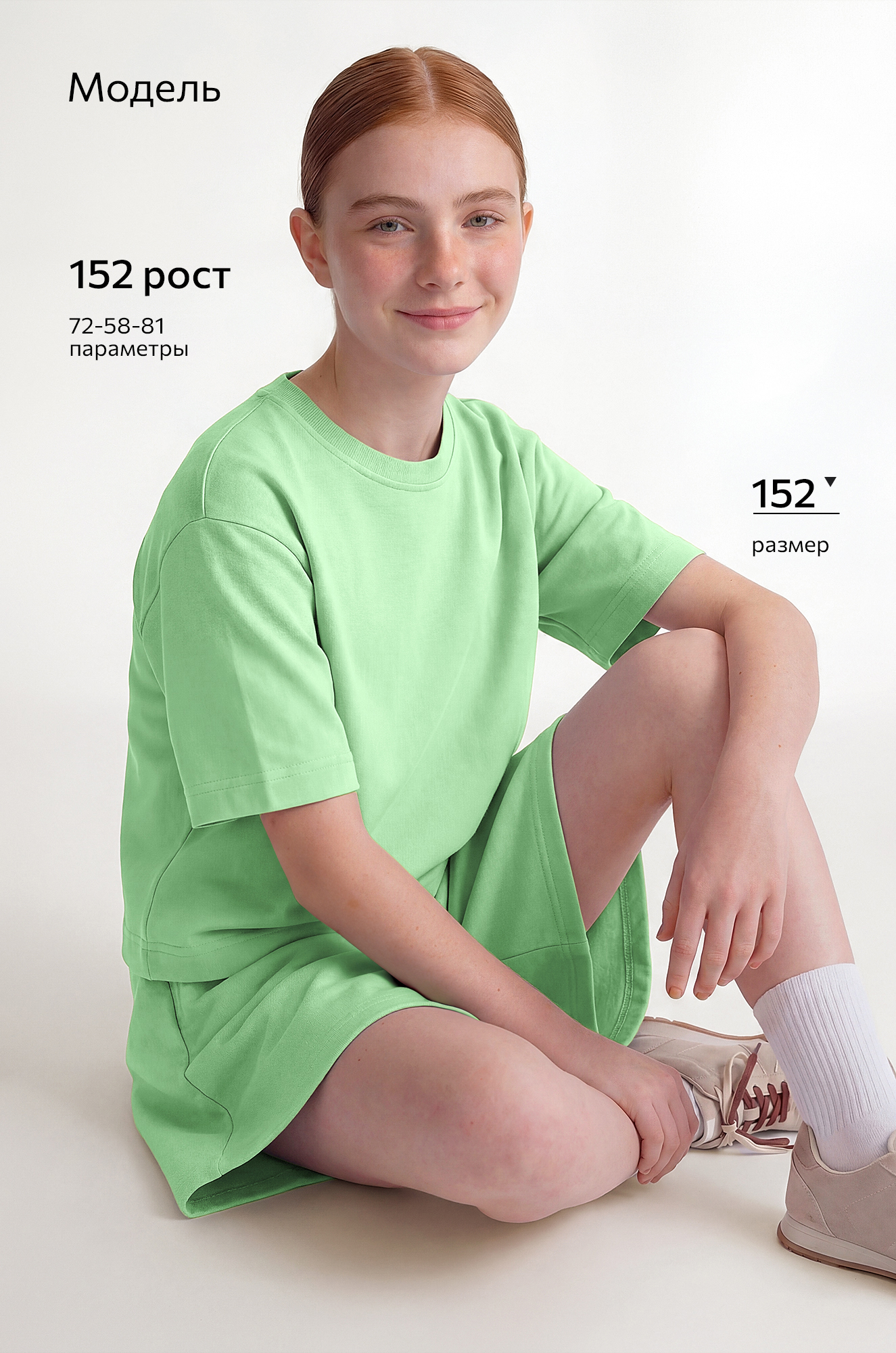 Светло-зеленый костюм для девочки подростка — настоящая находка на лето! Футболка оверсайз со спущенным плечом и круглым вырезом, а также шорты клёш на резинке создают тот самый повседневный ансамбль из мягкого трикотажа, в котором хочется резвиться с утра до вечера.