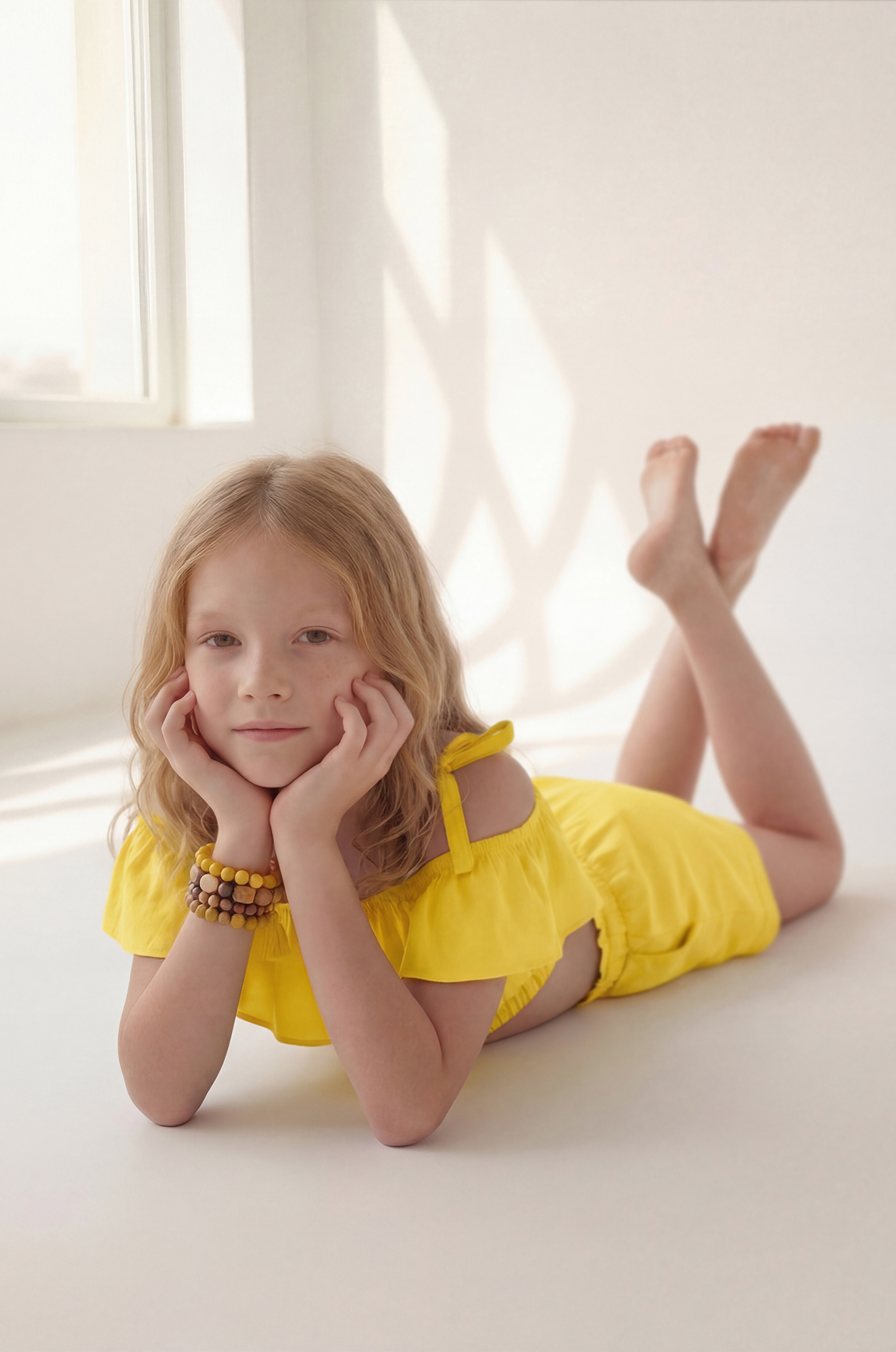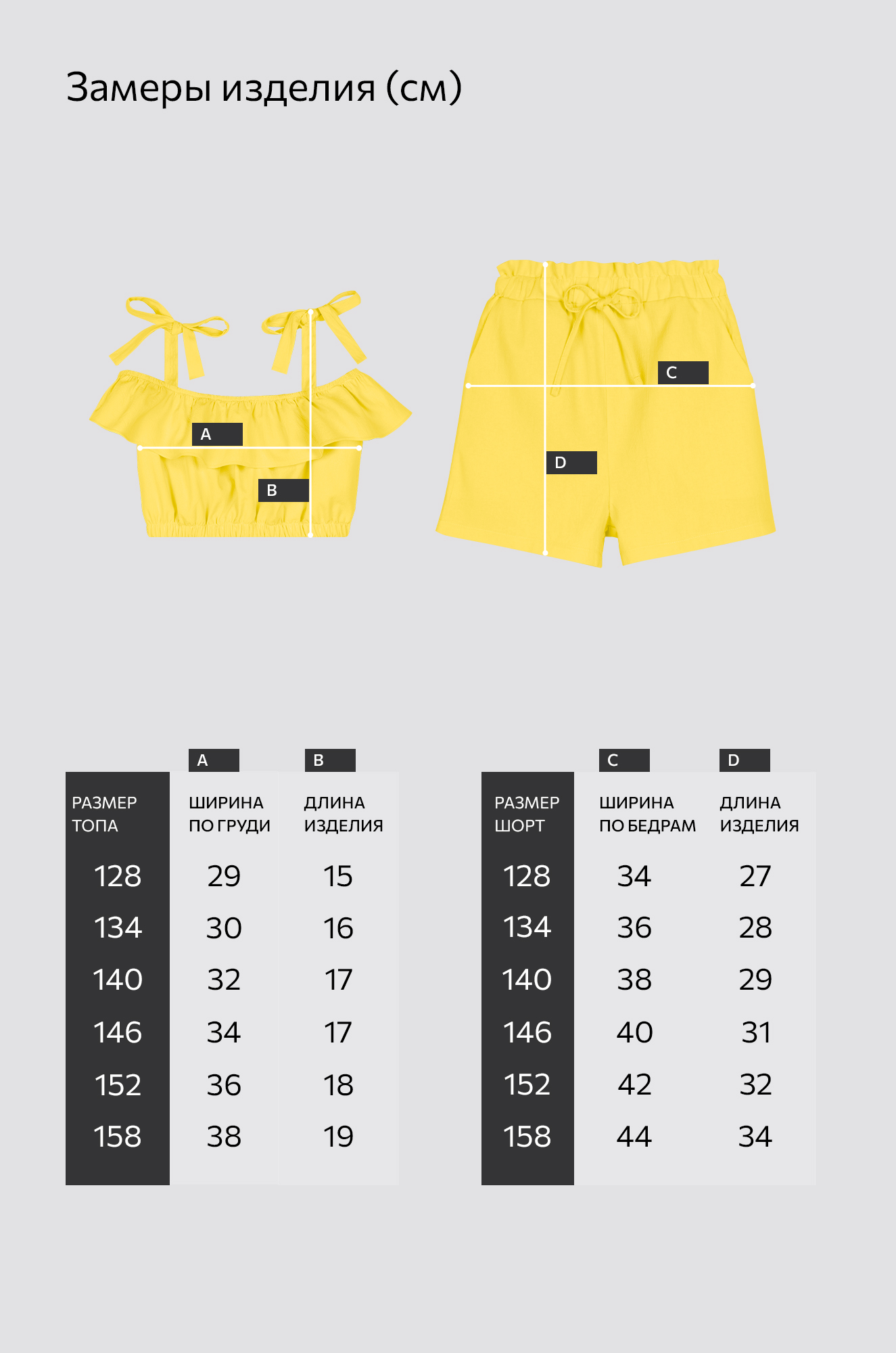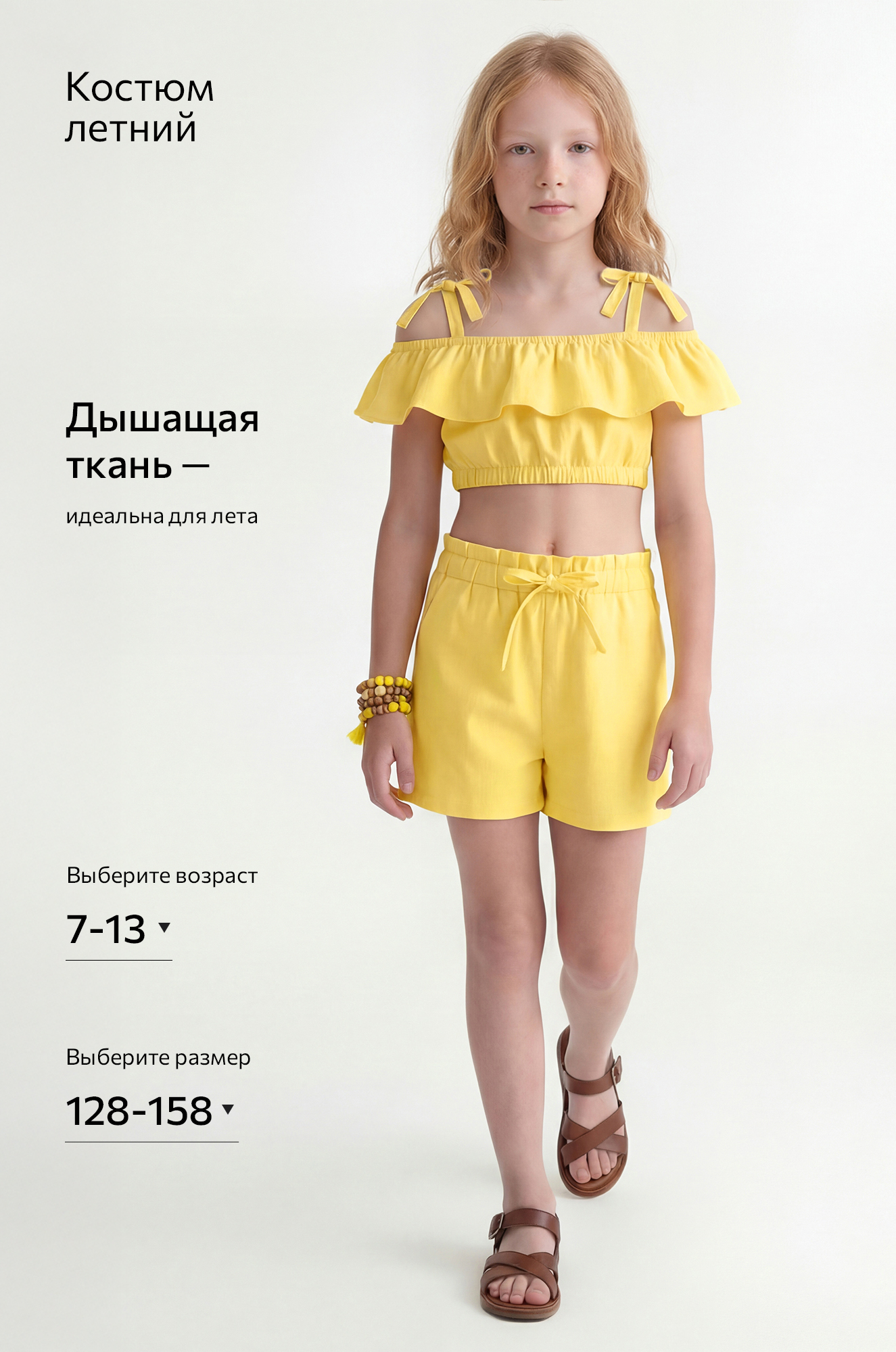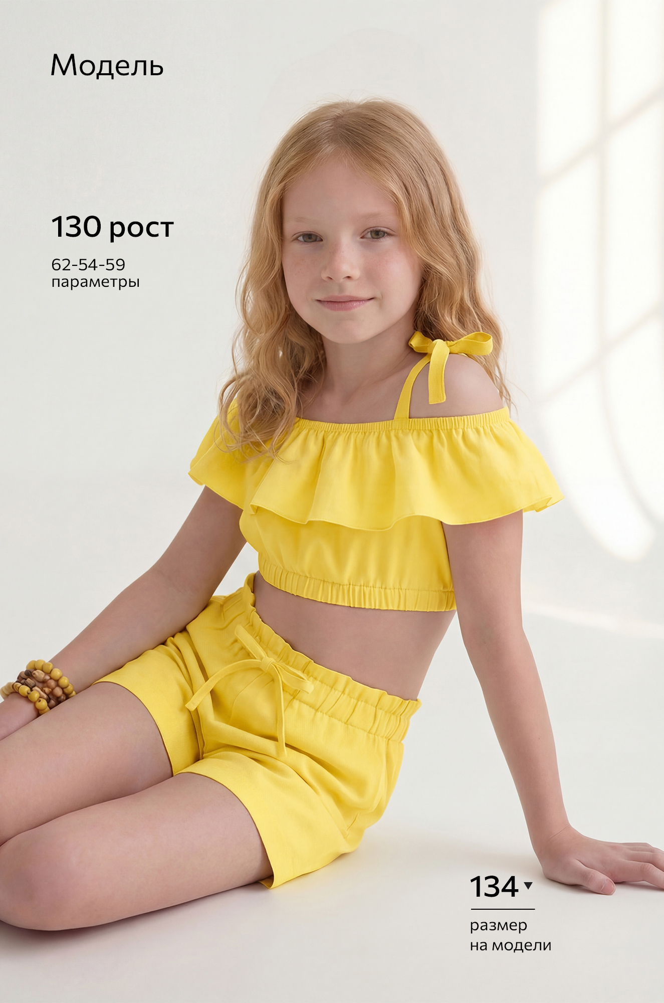 Обеспечьте своей принцессе особенное лето с этим костюмом-двойкой из топа и шорт в нежном желтом цвете! Короткий топик украшен воздушным воланом, а завязки позволяют регулировать посадку. Шорты с прямым кроем, поясом на резинке и утягивающим шнурком обеспечат полную свободу движений, а боковые карманы добавляют удобства.