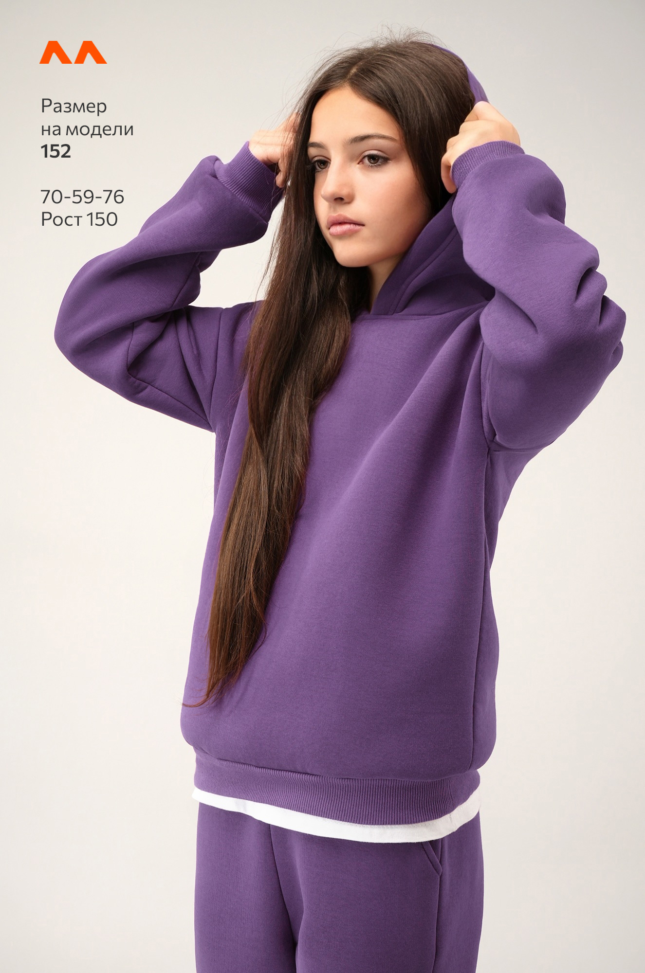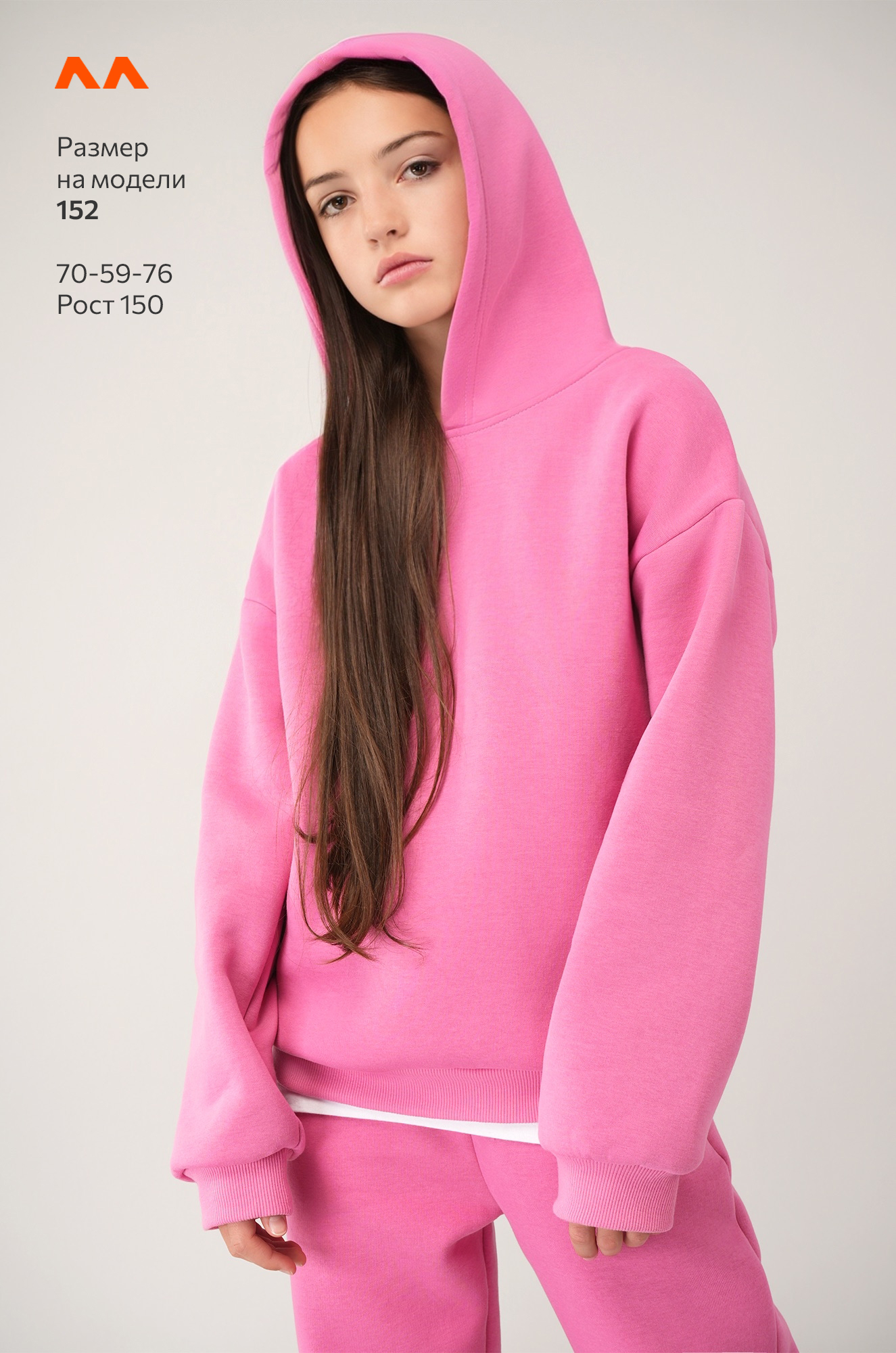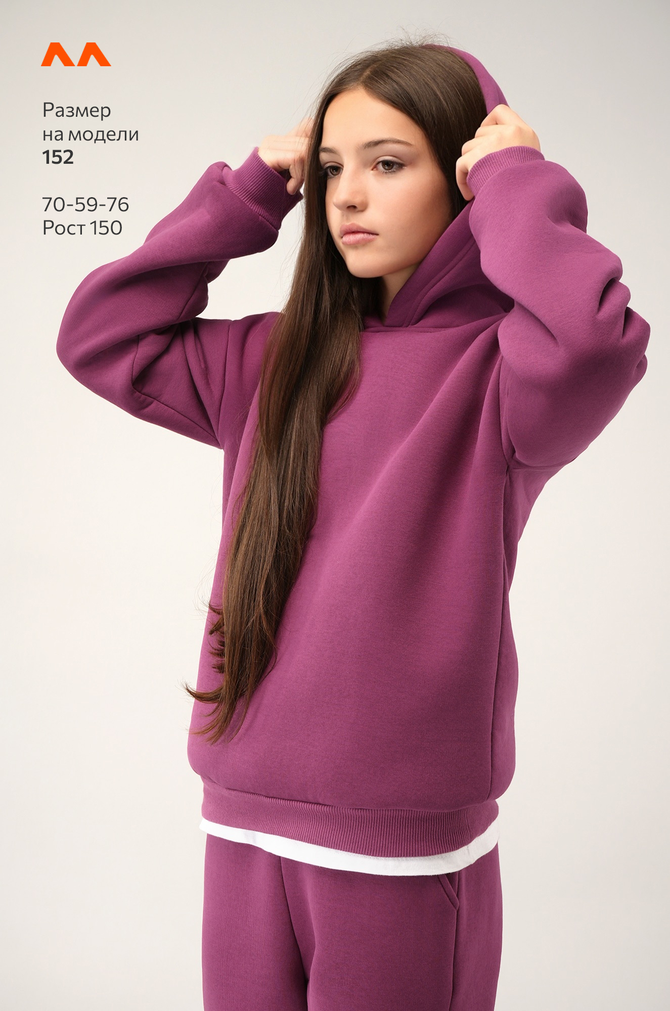 Рост модели 147 см, параметры: объем груди 67, объем талии 56, объем бедер 78. На ней размер 146.