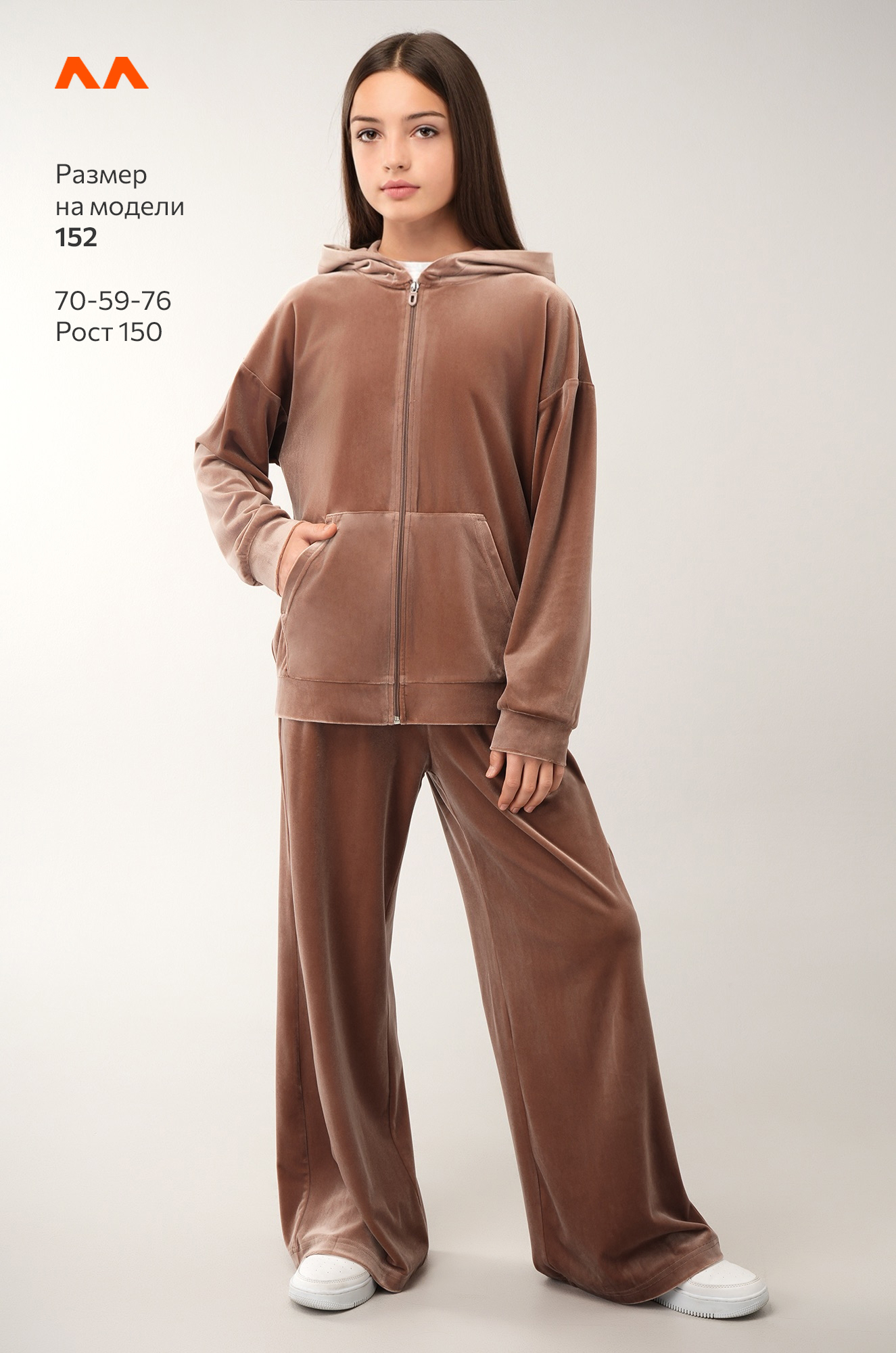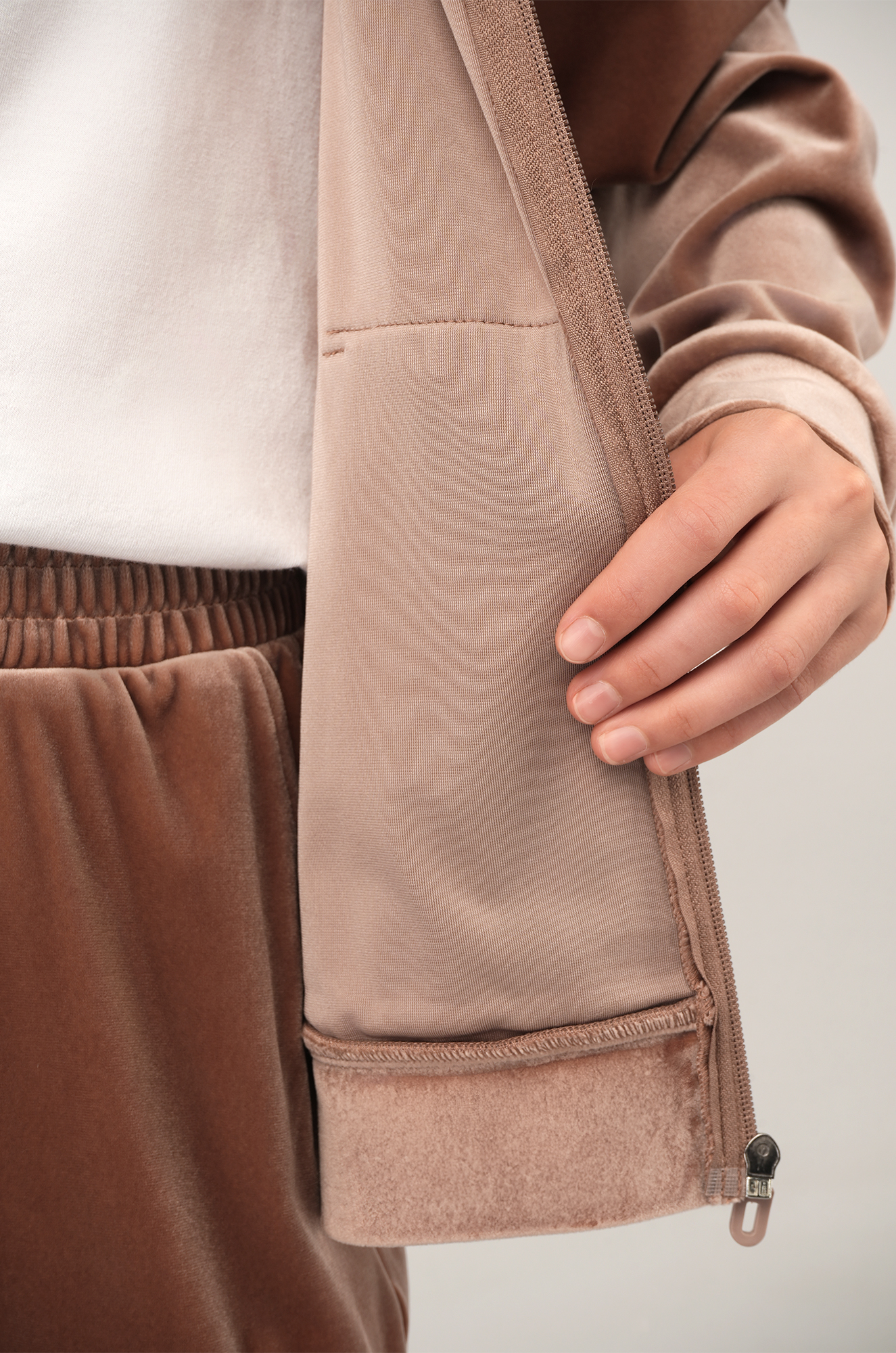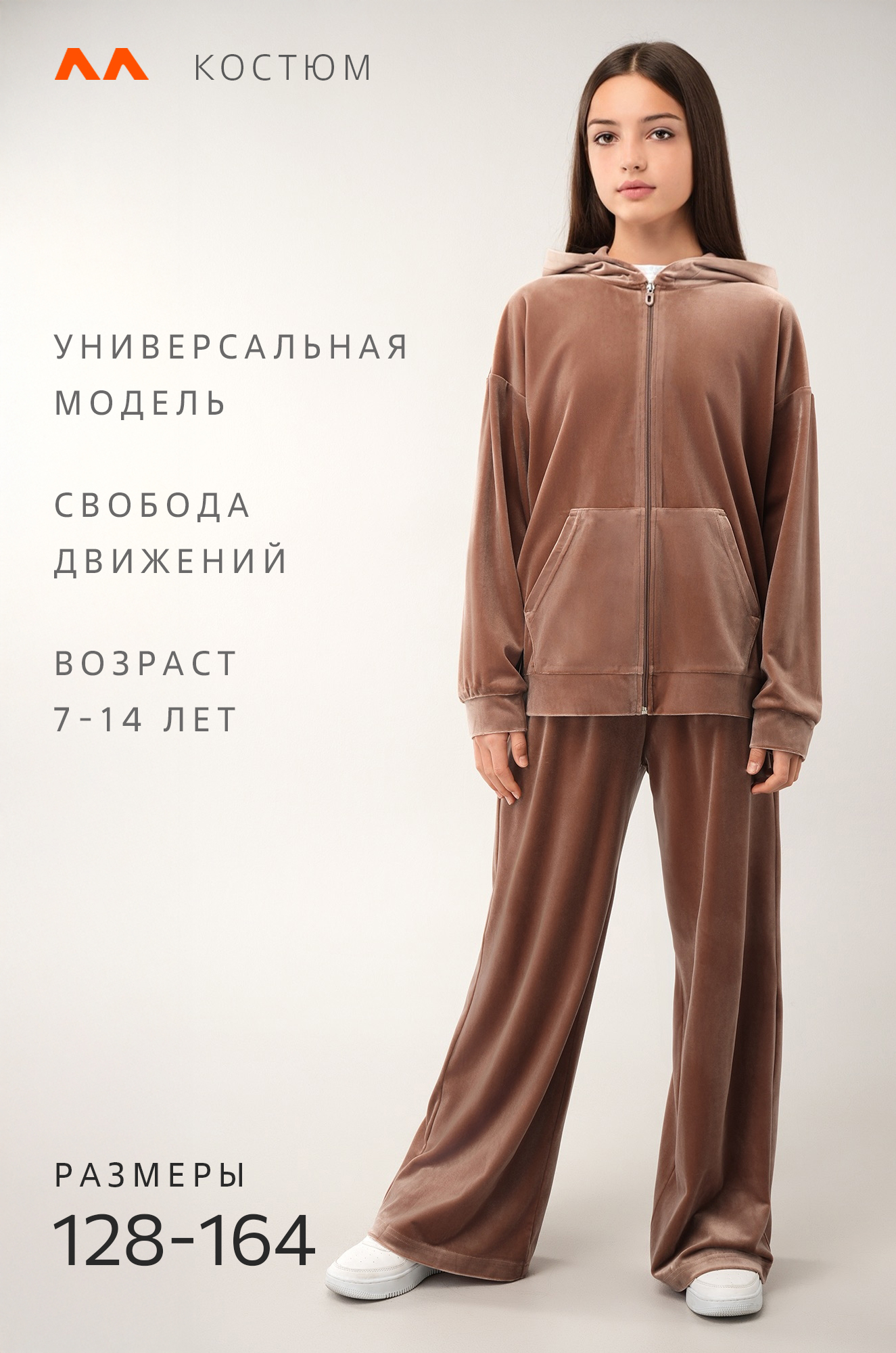 Бежевый костюм для девочки из мягкого трикотажного велюра дарит комфорт и уверенность в движении. Универсальный базовый комплект — отличный выбор для прогулок осенью и весной, отдыха и ярких моментов в спортивном стиле.