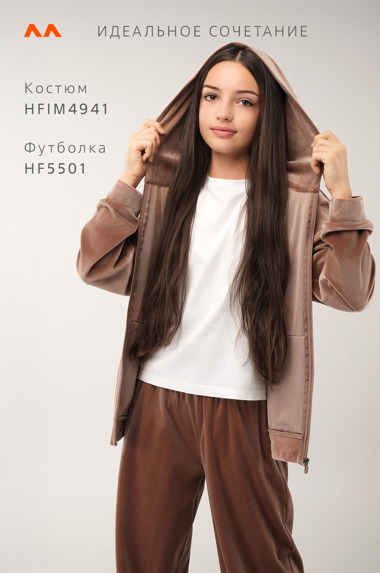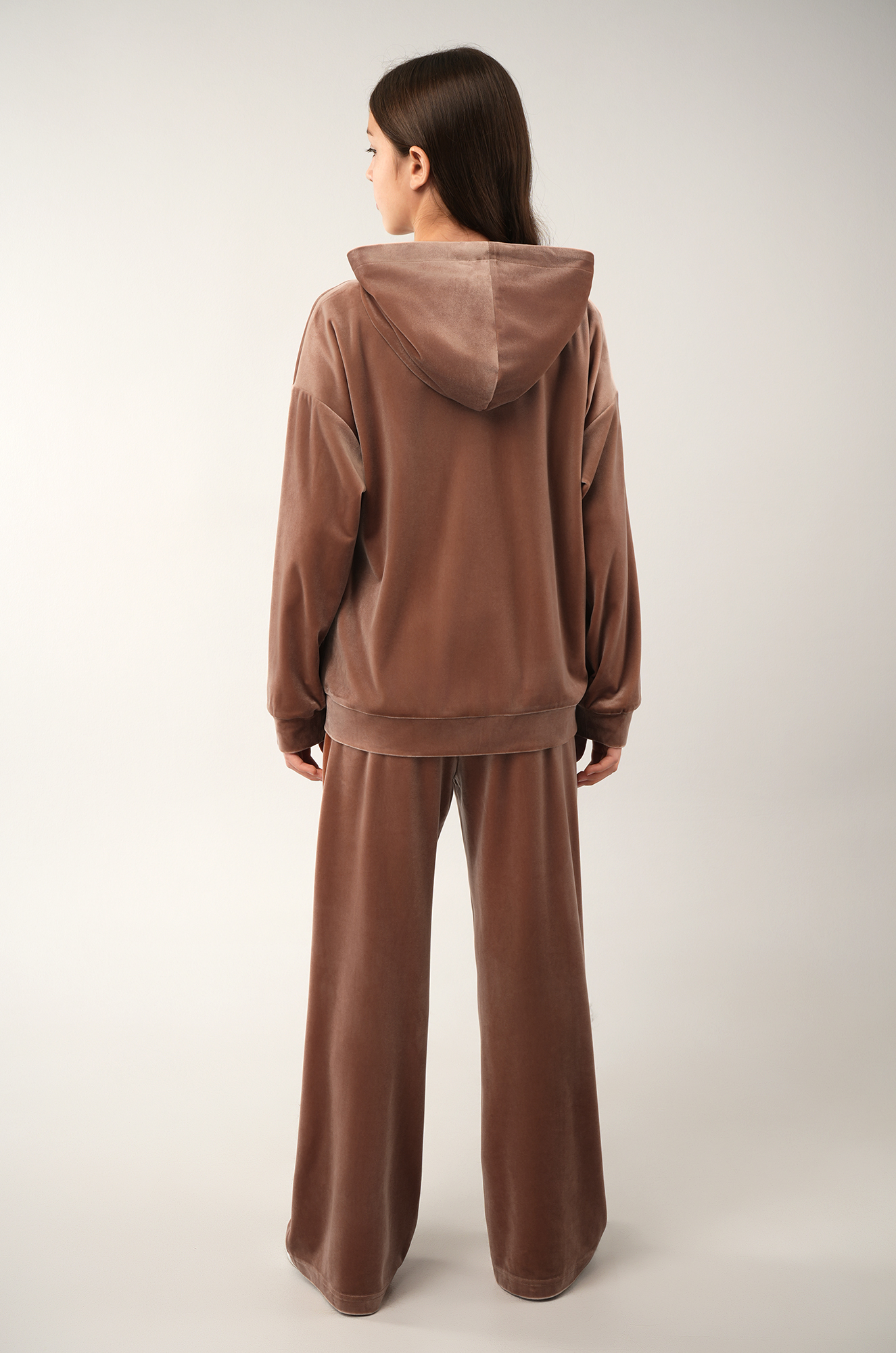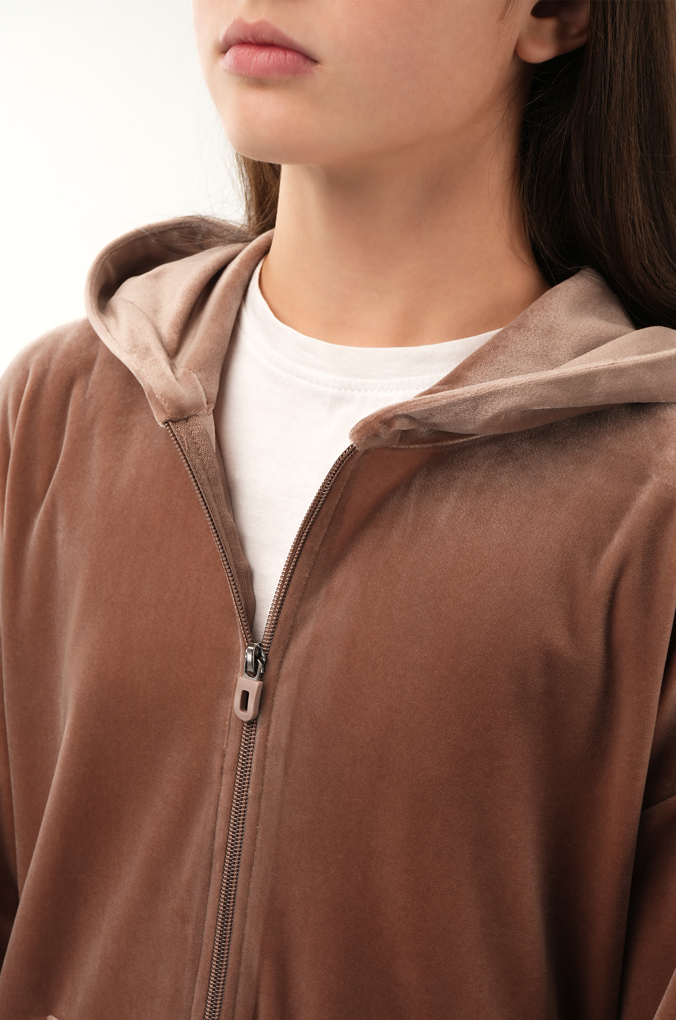 Бежевый костюм для девочки из мягкого трикотажного велюра дарит комфорт и уверенность в движении. Универсальный базовый комплект — отличный выбор для прогулок осенью и весной, отдыха и ярких моментов в спортивном стиле.