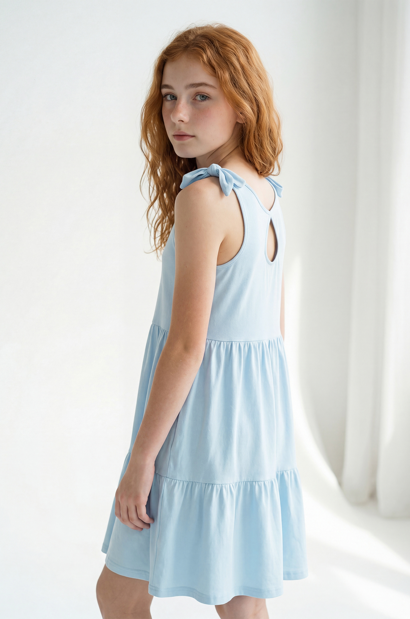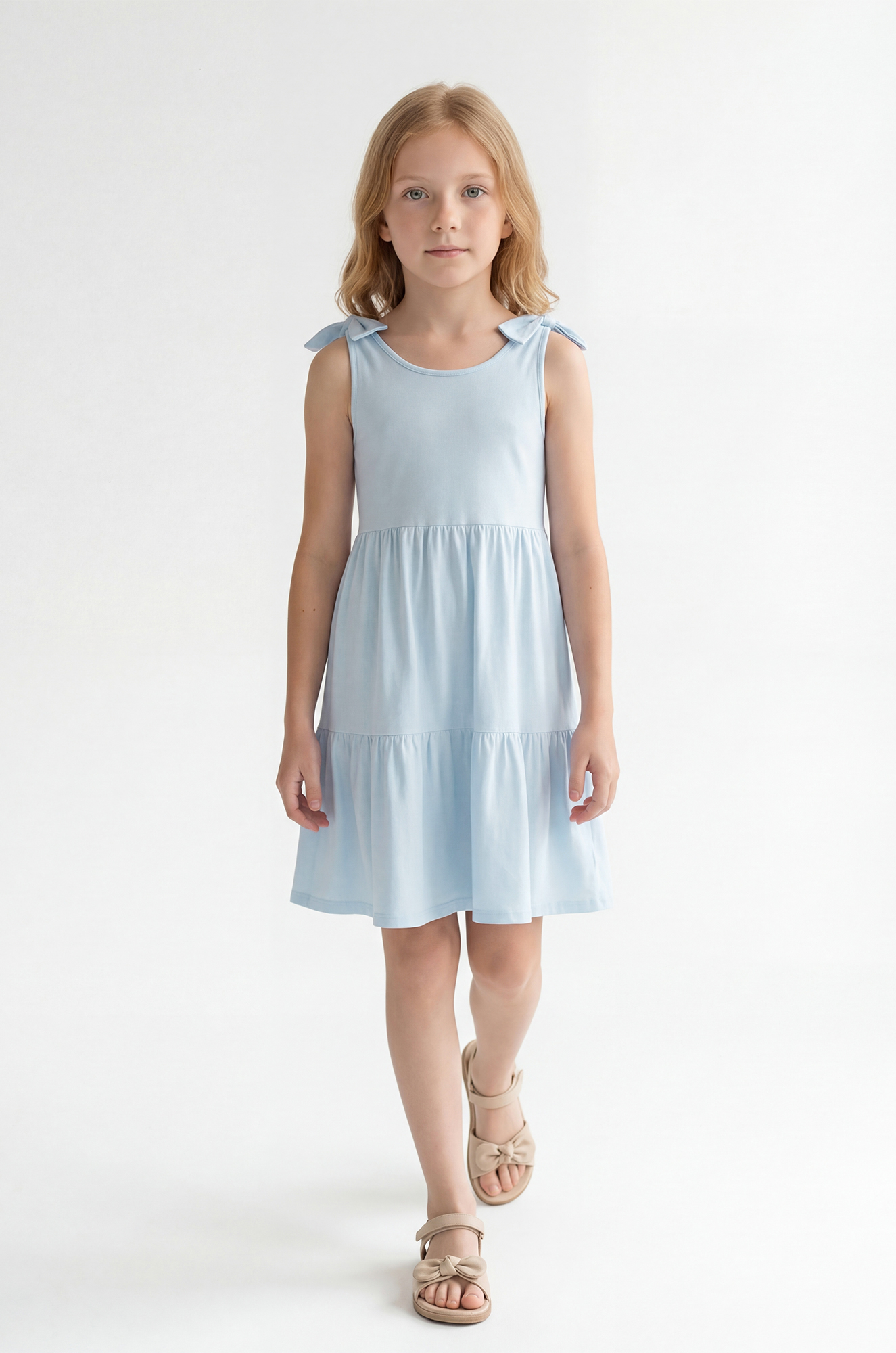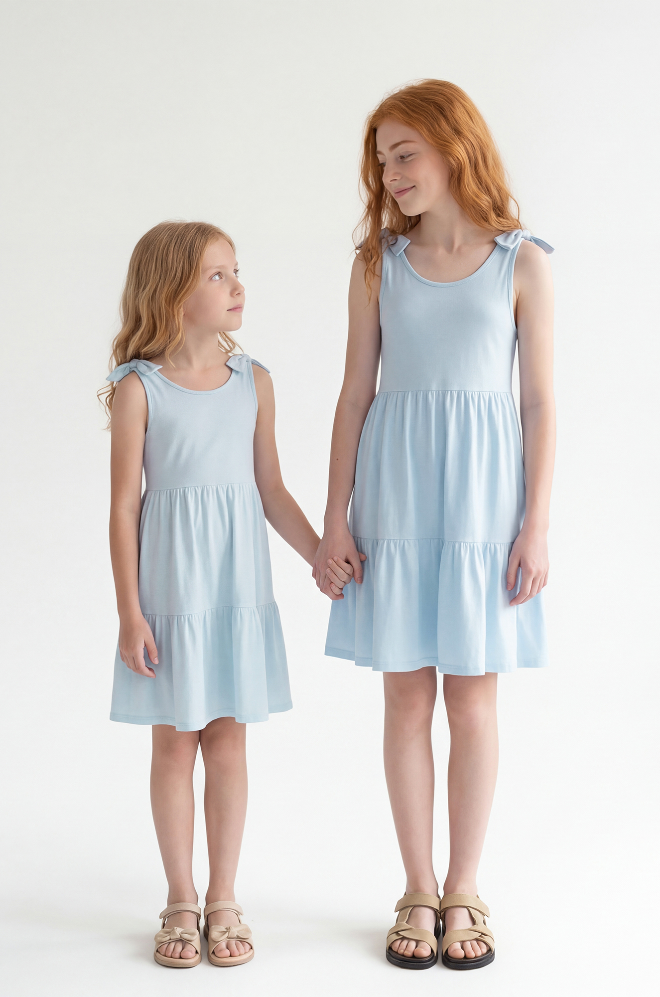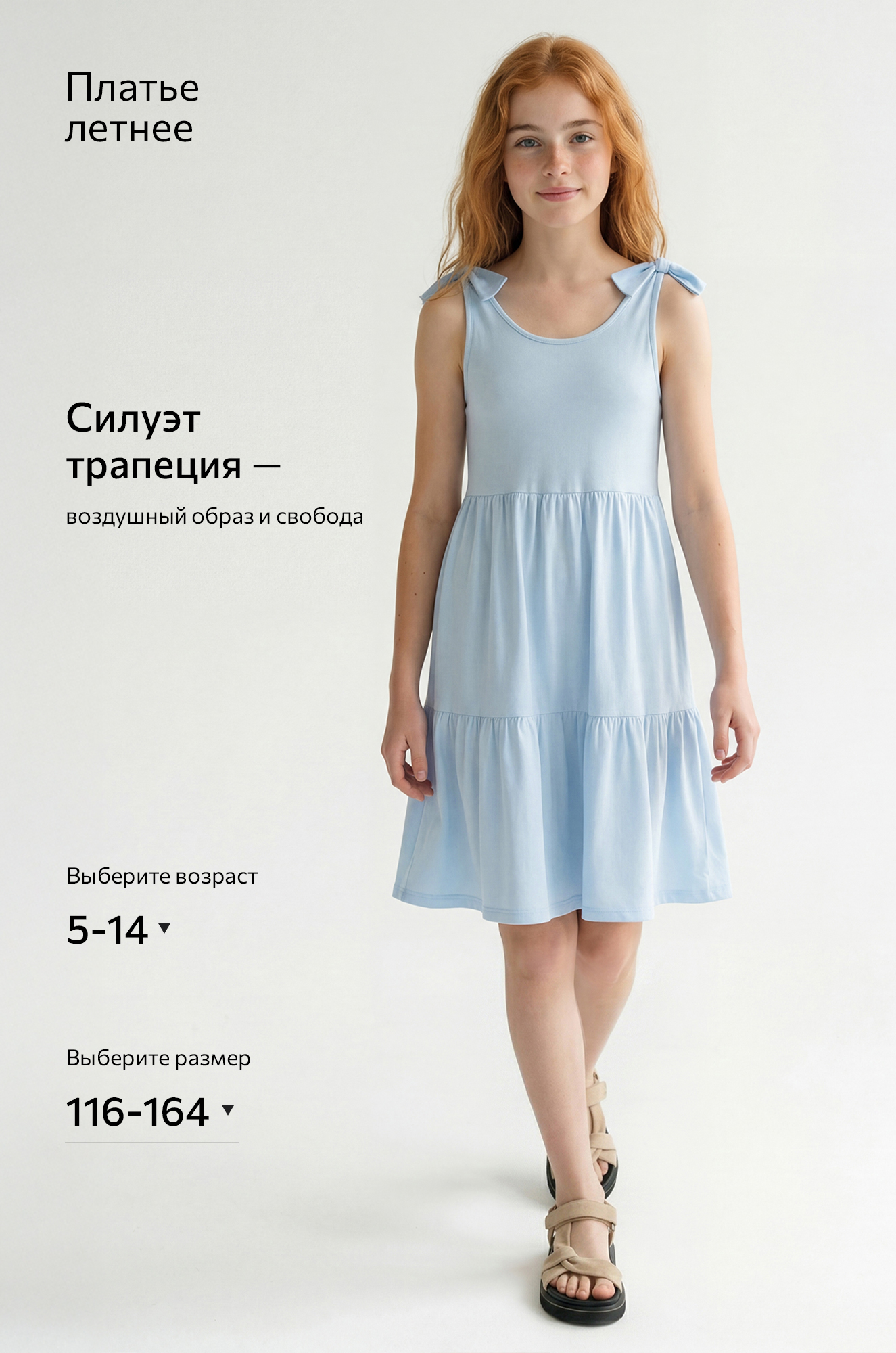 Детский сарафан для девочки и девочек подростков выполнен из натурального 100% хлопка и представлен в нежно-голубом оттенке. Свободный крой, вырез капелька на спинке, кокетливые завязки на плечах – каждая деталь создана для комфорта ребенка. Благодаря воздушным сборкам летнее платьице для детей поможет создать классный образ.