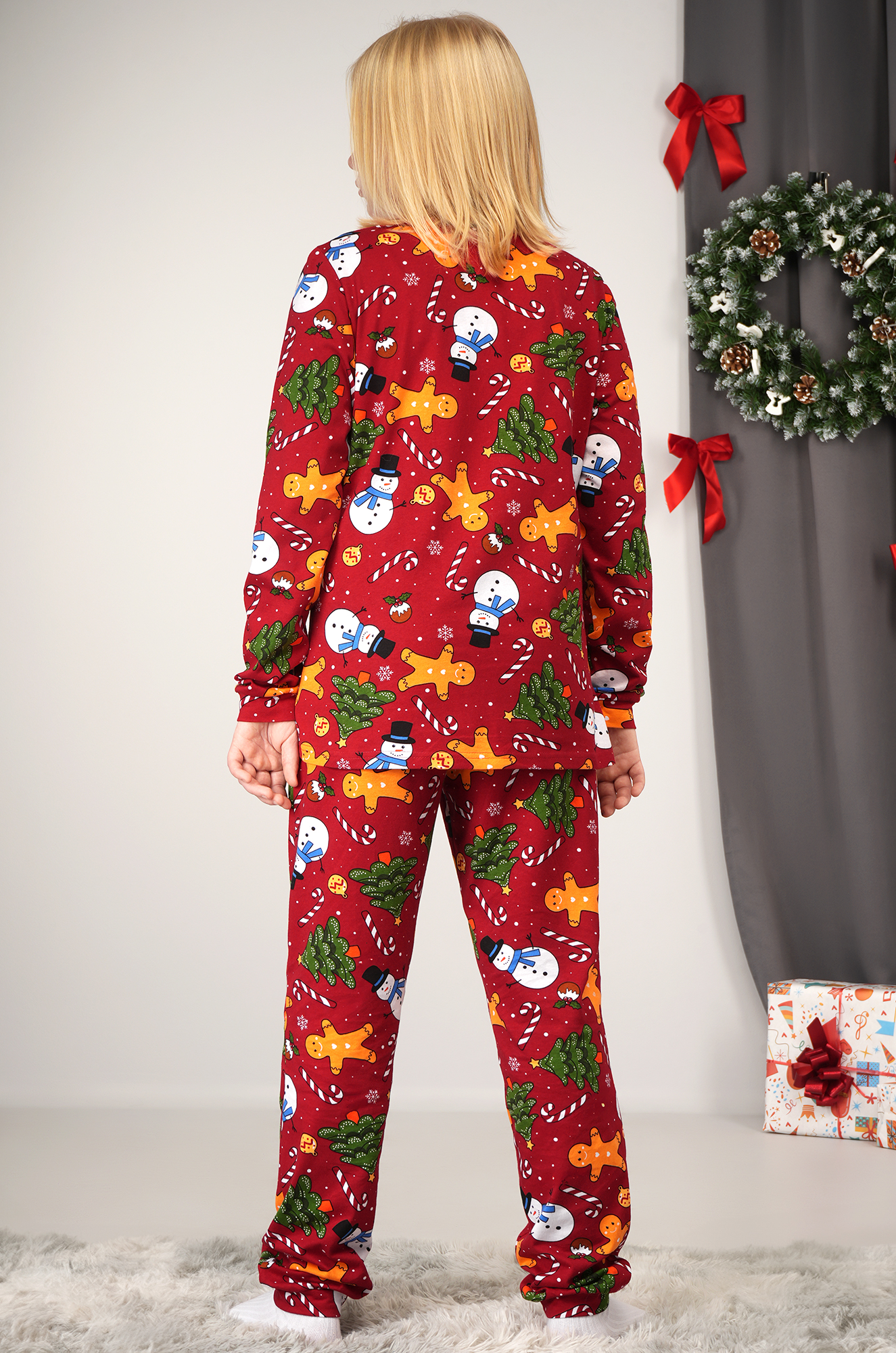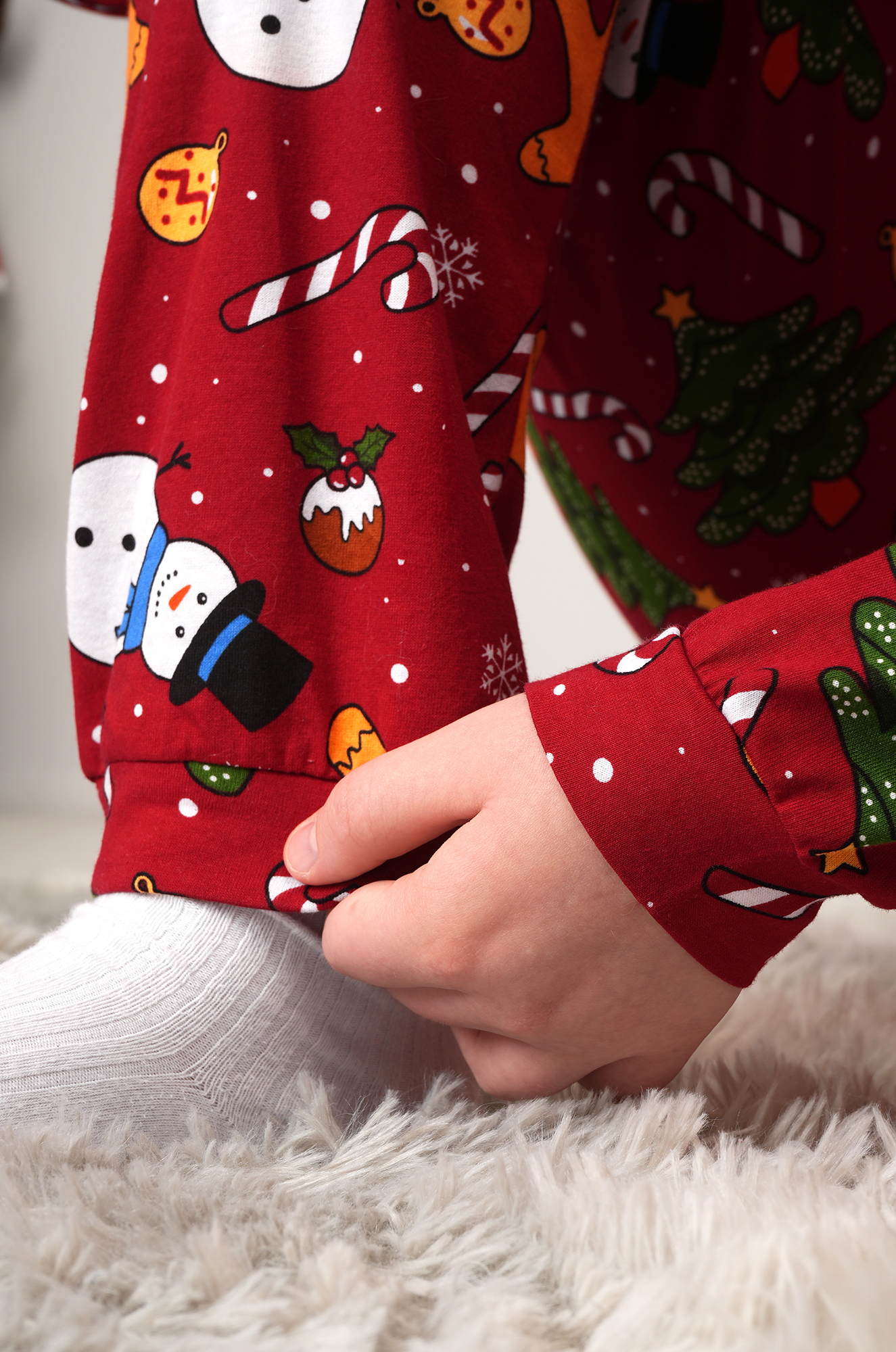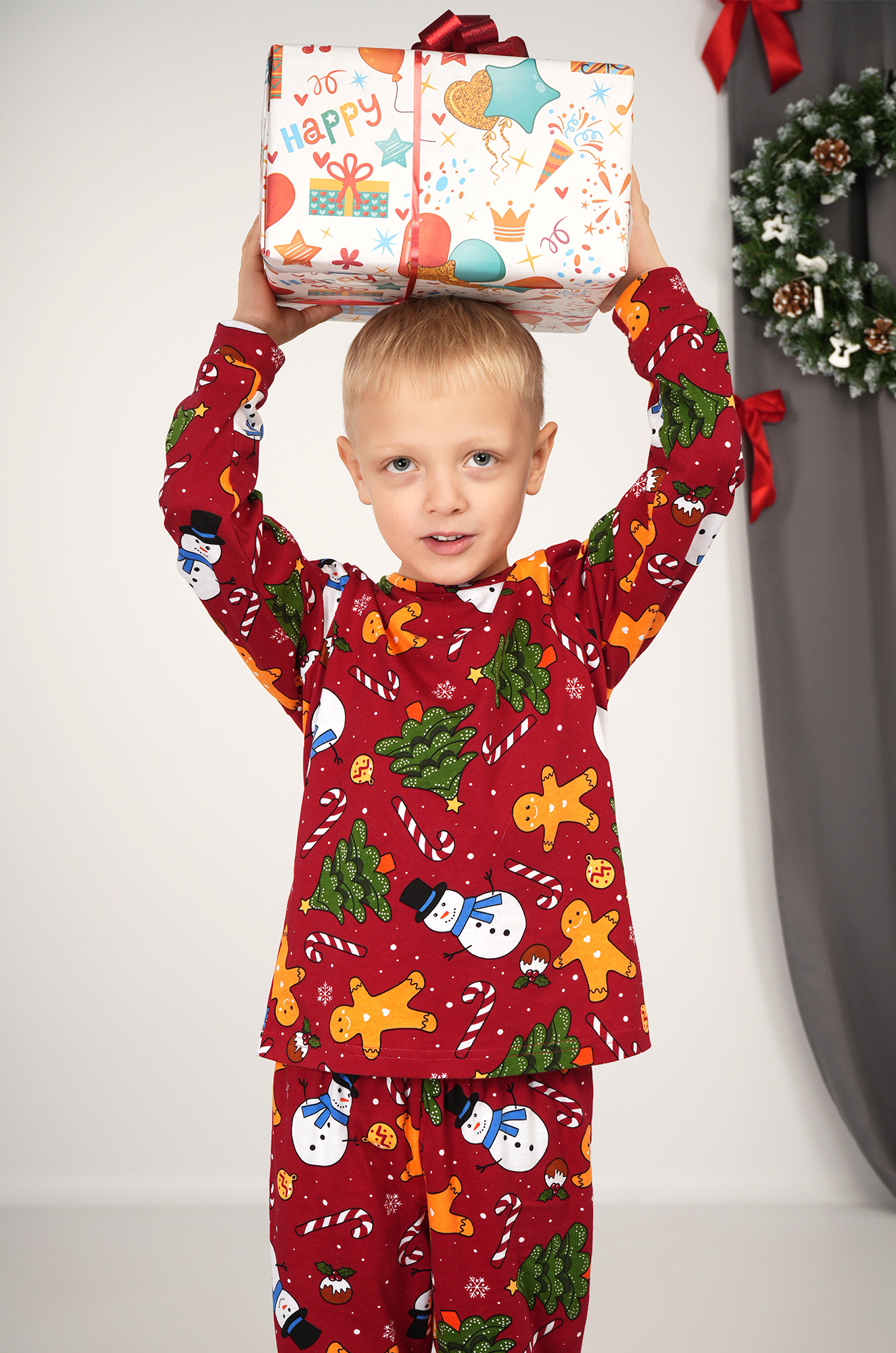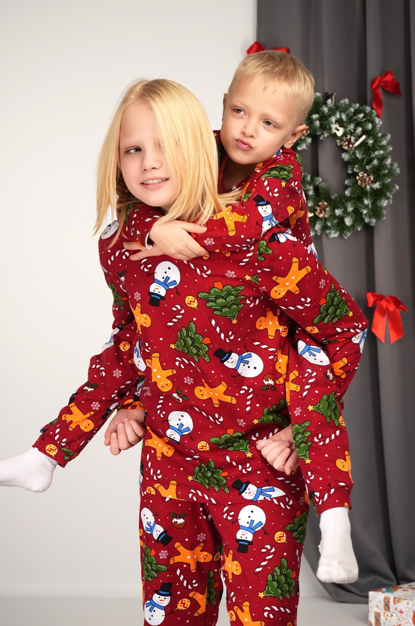 Детская новогодняя пижама с брюками выполнена из натурального 100% хлопка. Яркий красный цвет и принт Снеговики создают атмосферу праздника и поднимают настроение, а мягкий трикотаж дарит комфорт. Домашний комплект двойка для мальчиков и девочек станет чудесным подарком на Новый год или Рождество.