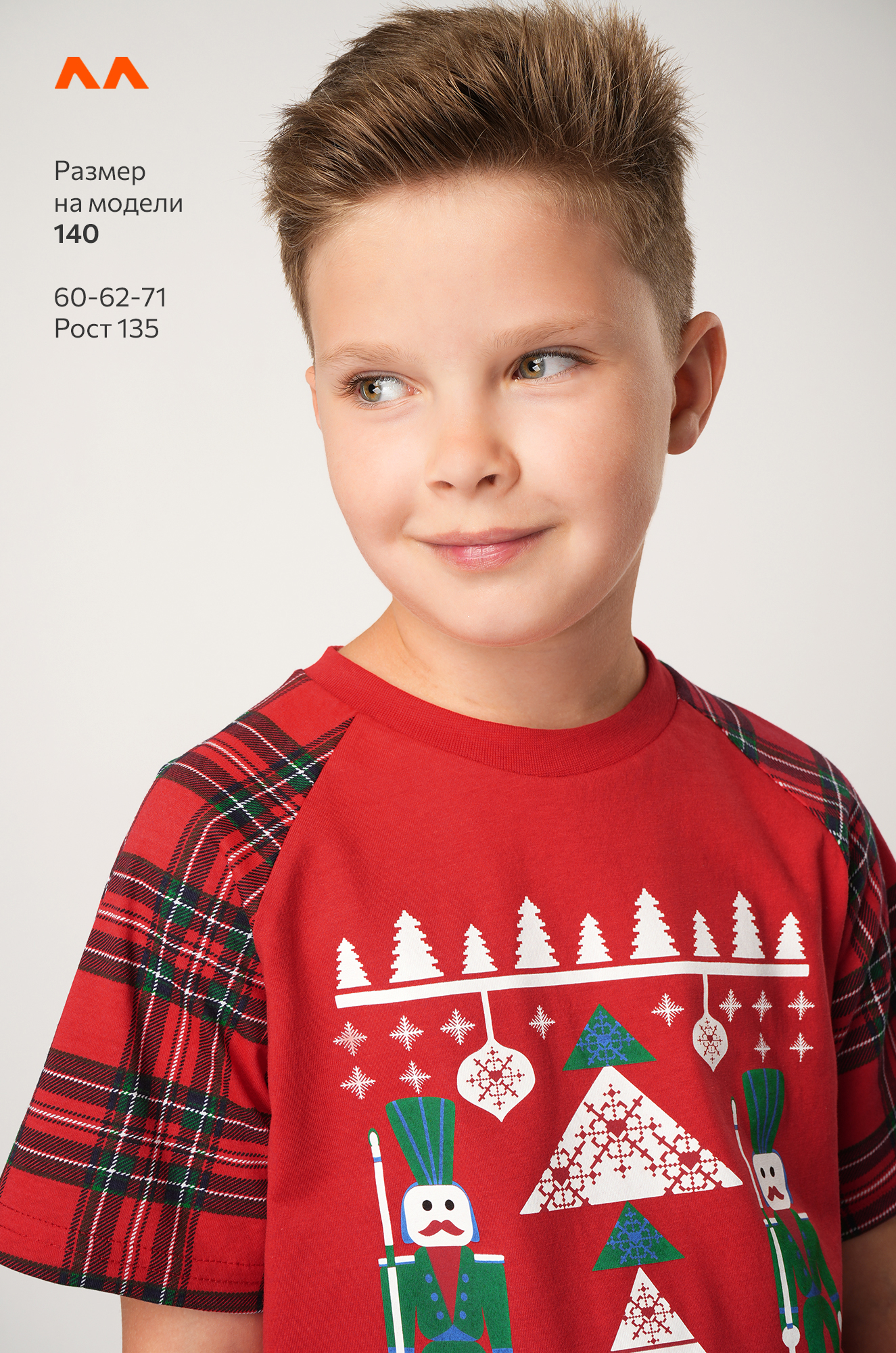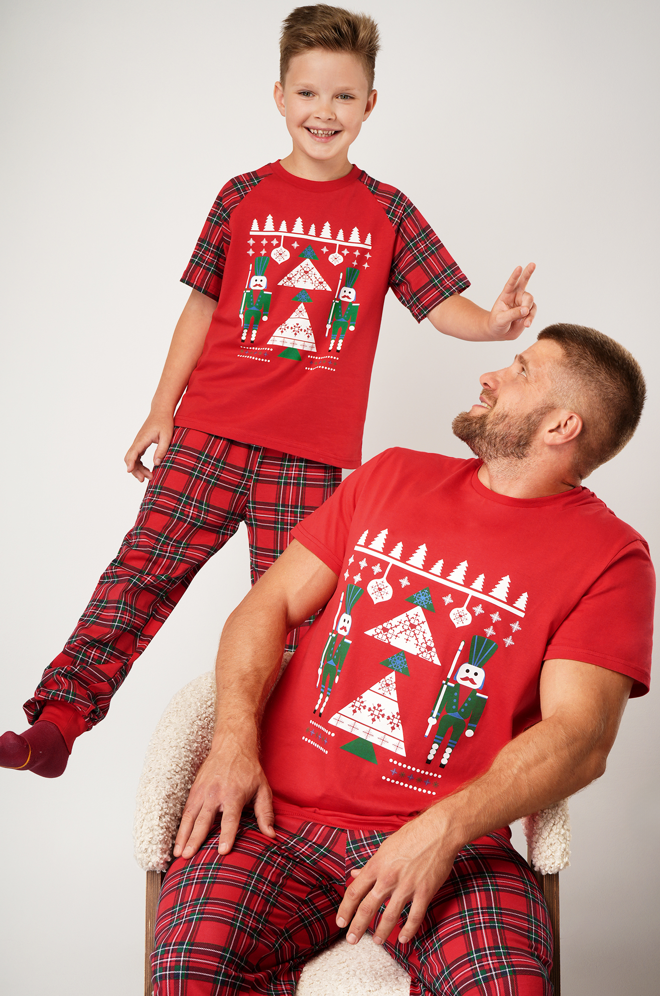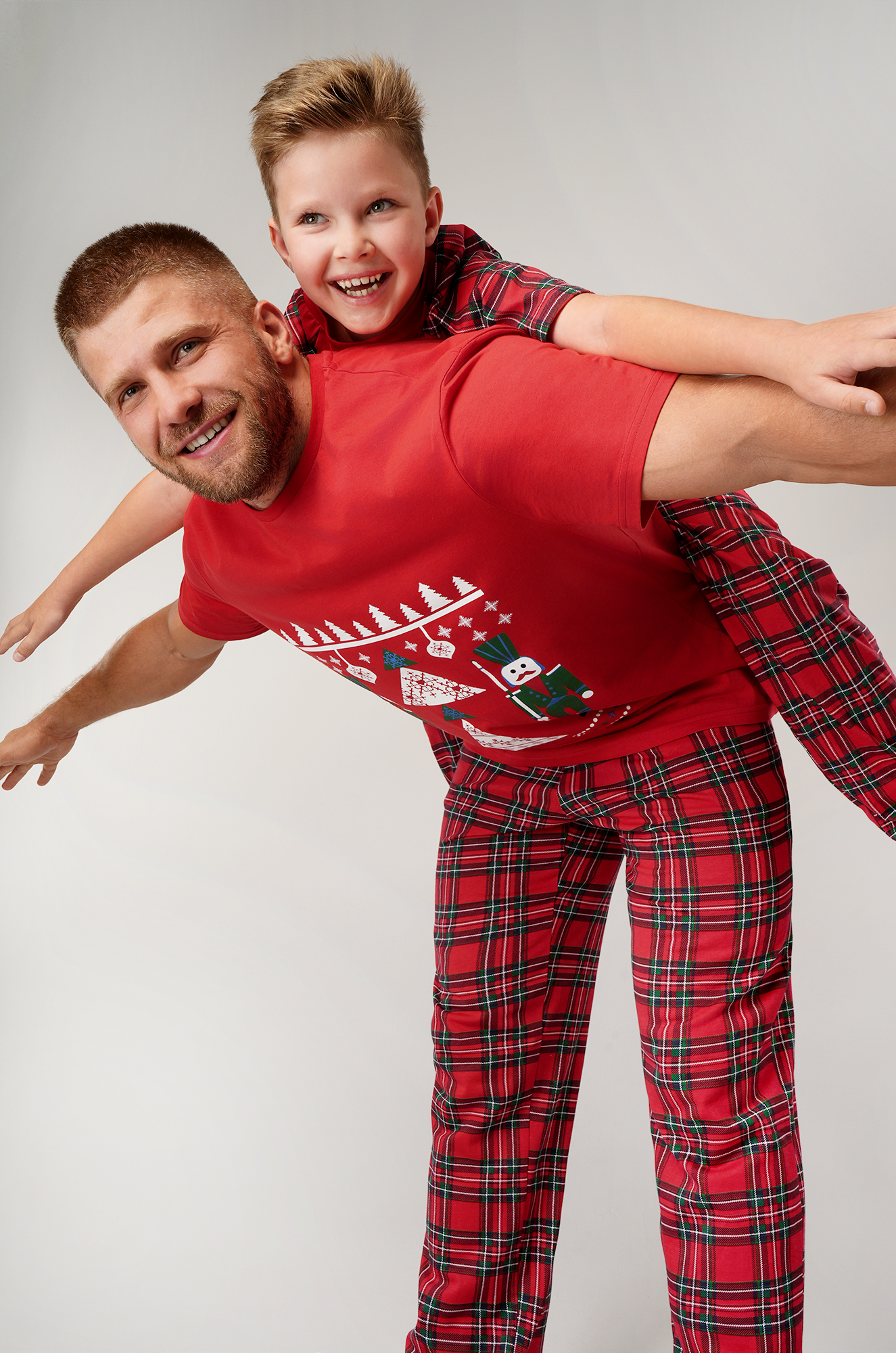 Новогодняя пижама для мальчиков и подростков выполнена из 100% хлопка. Красная футболка с праздничным принтом и брюки в клеточку с манжетами на штанинах делают домашний комплект удобным для сна, садика и семейных фотосессий.