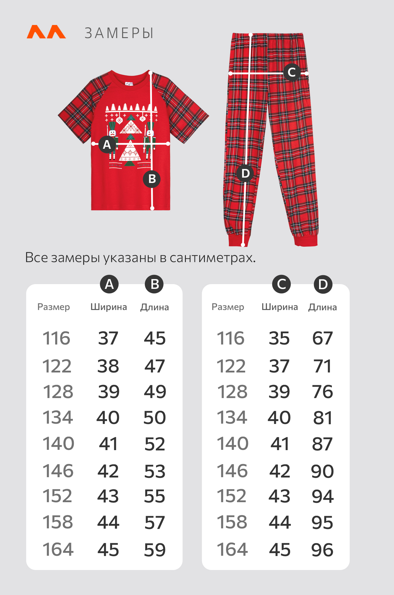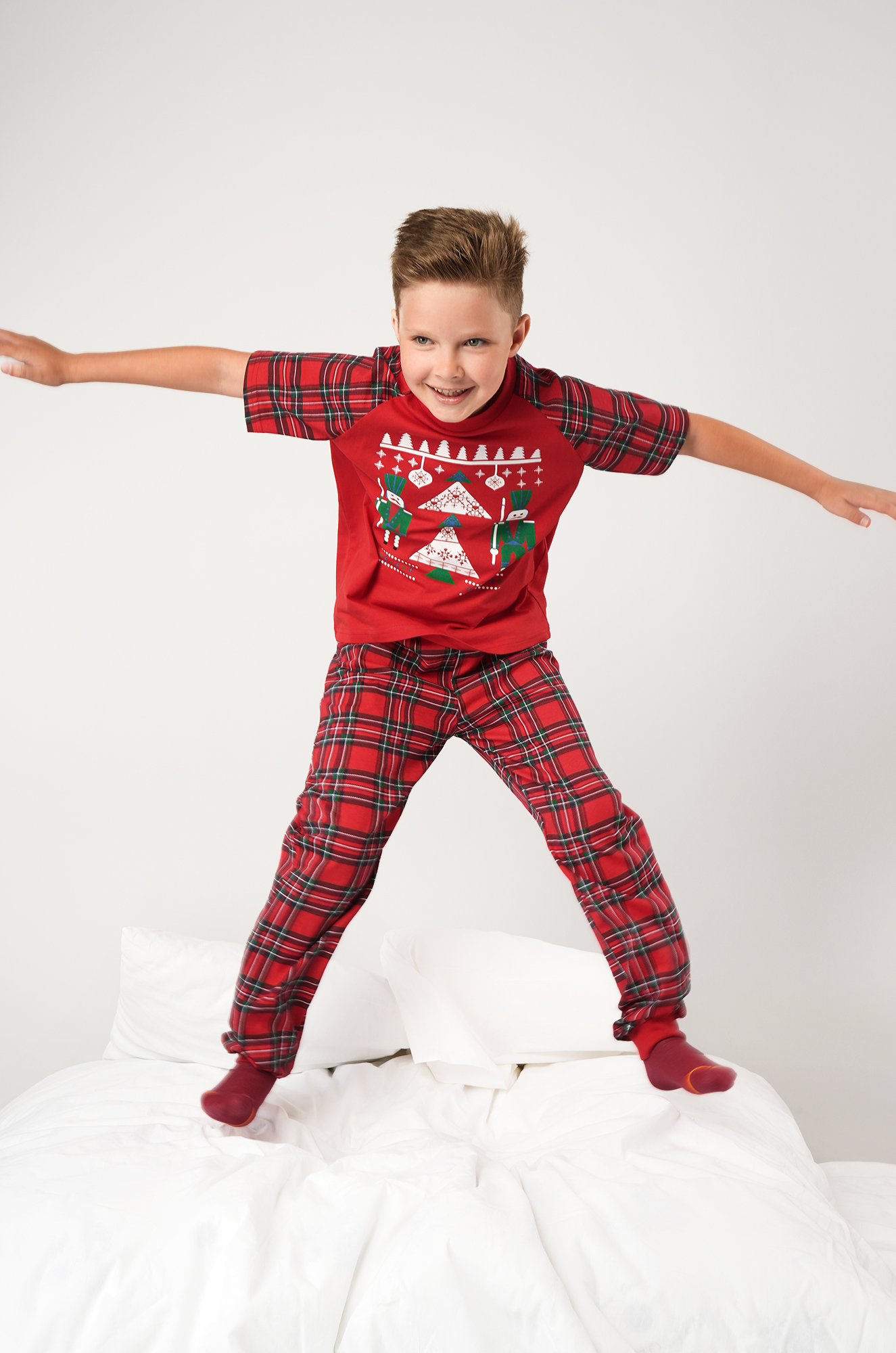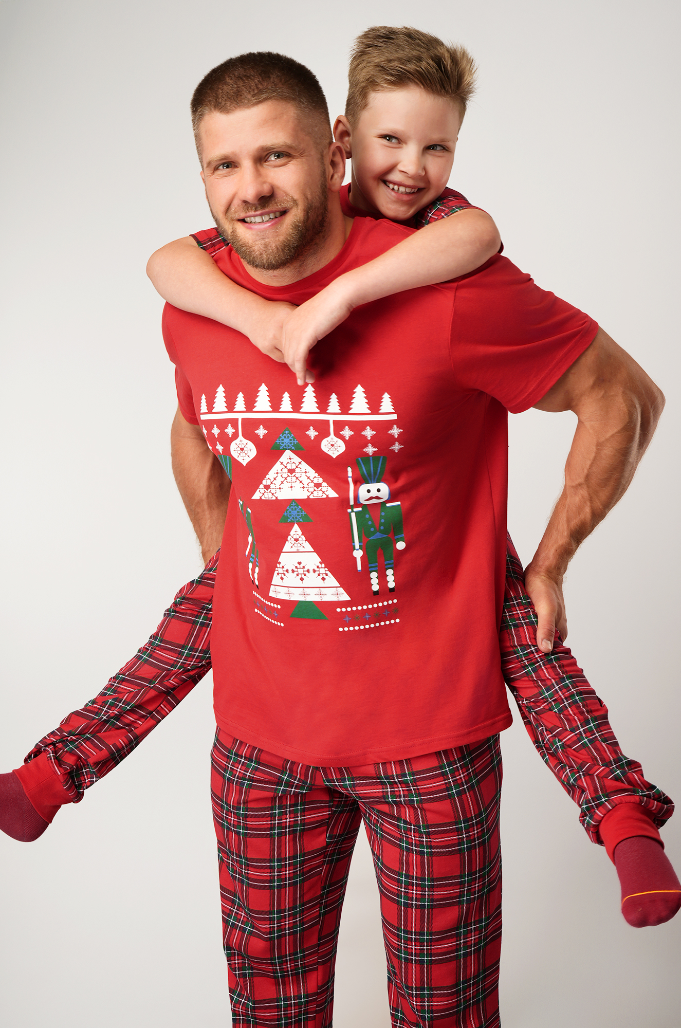 Новогодняя пижама для мальчиков и подростков выполнена из 100% хлопка. Красная футболка с праздничным принтом и брюки в клеточку с манжетами на штанинах делают домашний комплект удобным для сна, садика и семейных фотосессий.