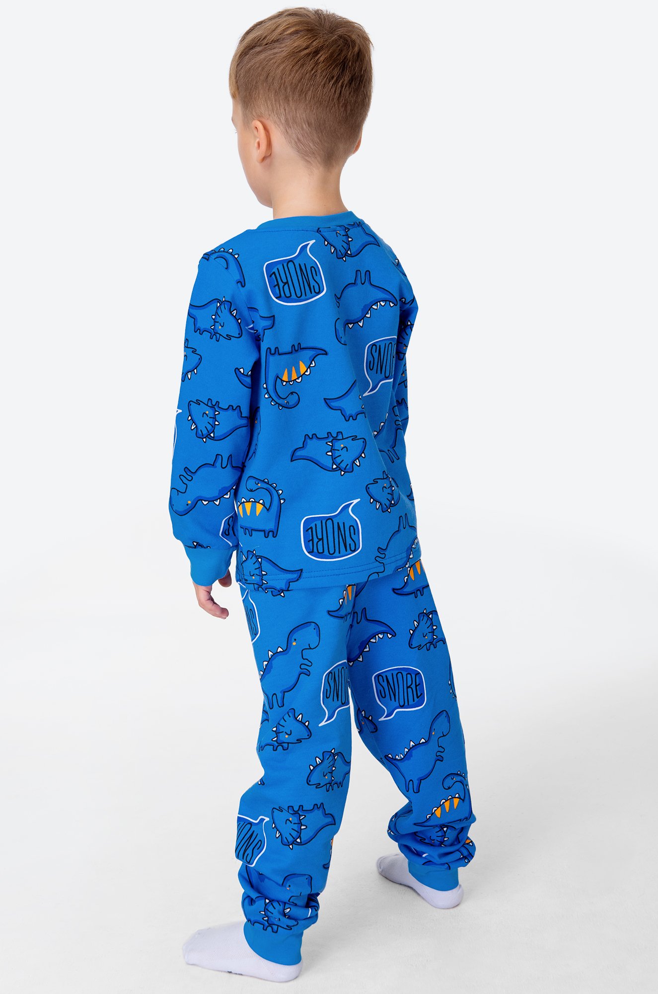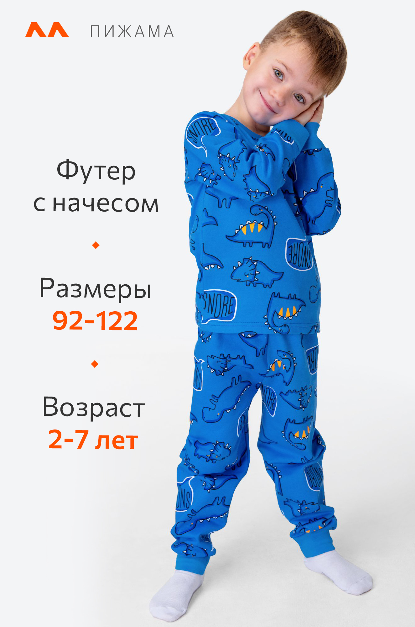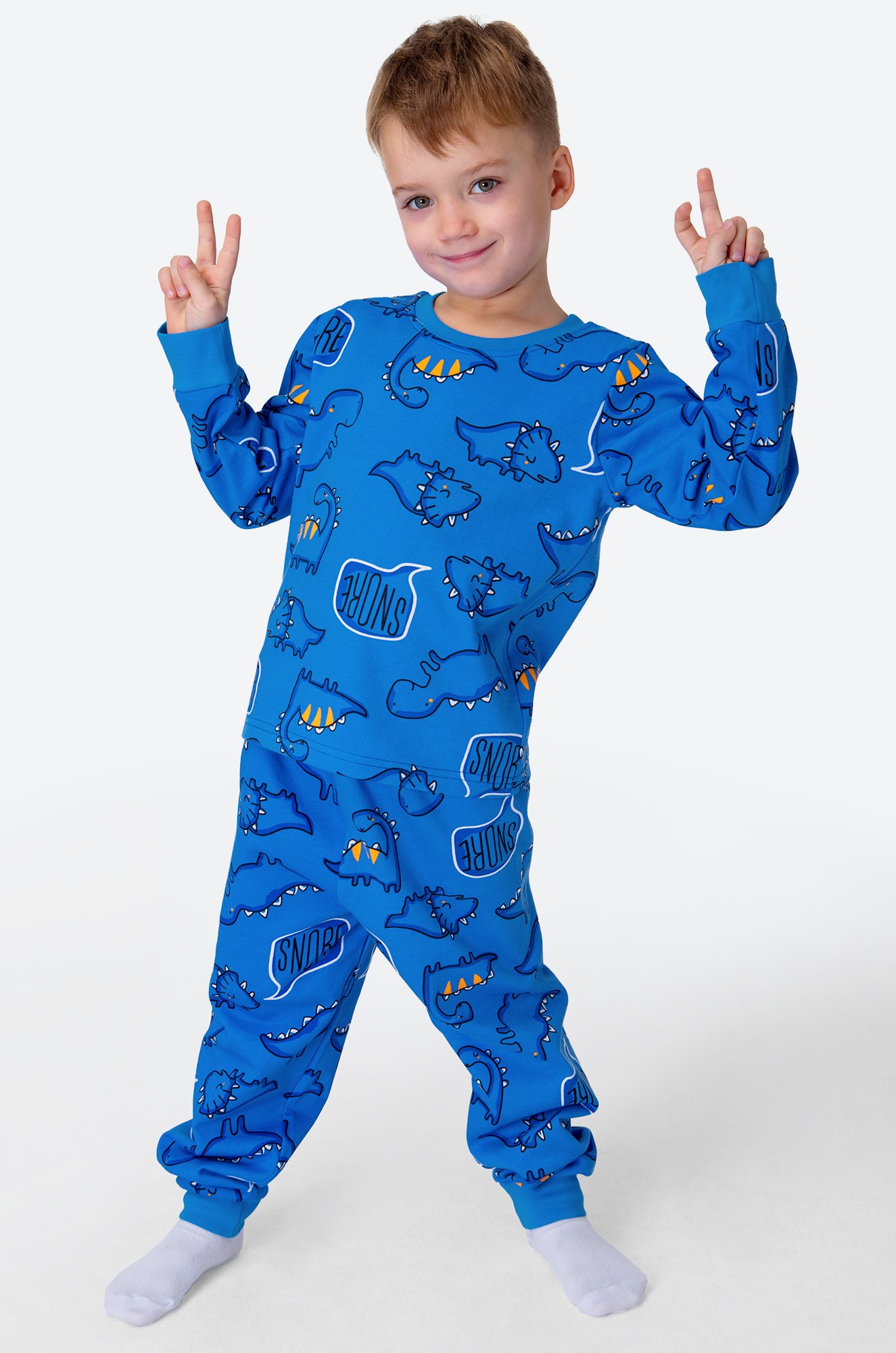 Теплая детская пижама с брюками для мальчиков выполнена из 100% хлопка. Пижама из футера с начесом станет любимым атрибутом отдыха благодаря свободному крою и насыщенному синему цвету. Прикольный принт Динозавры поднимает настроение и создает уютную атмосферу.