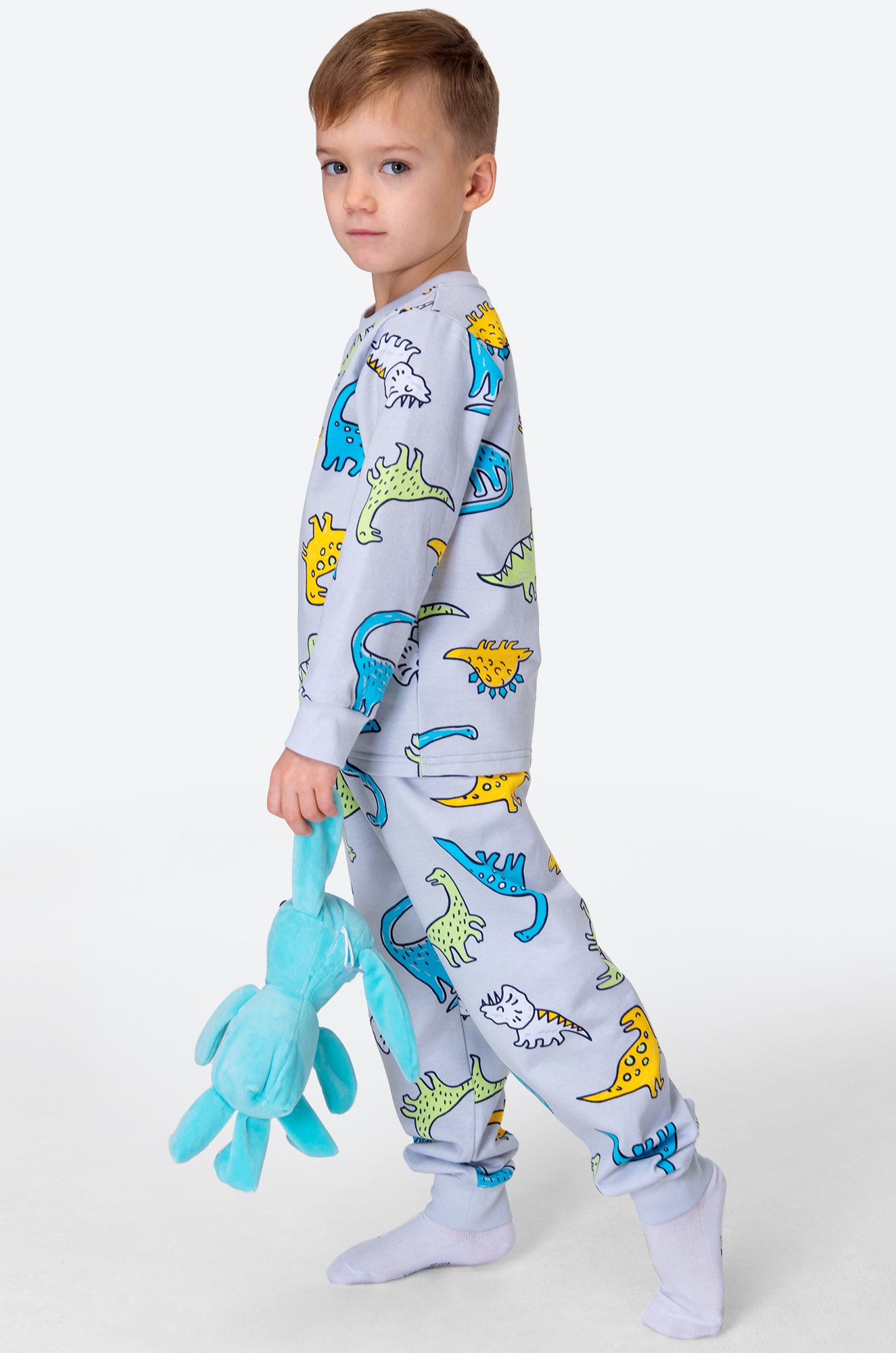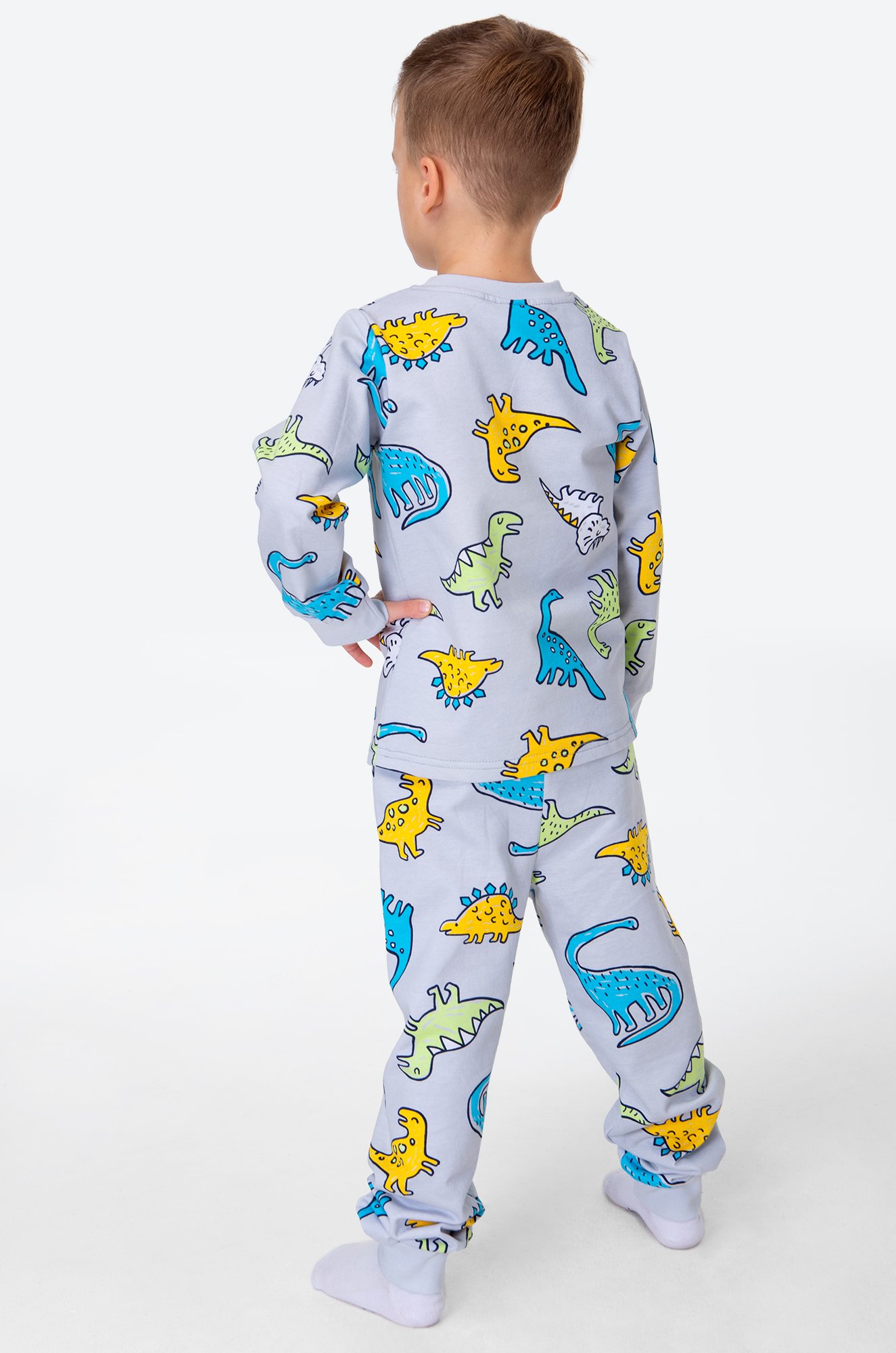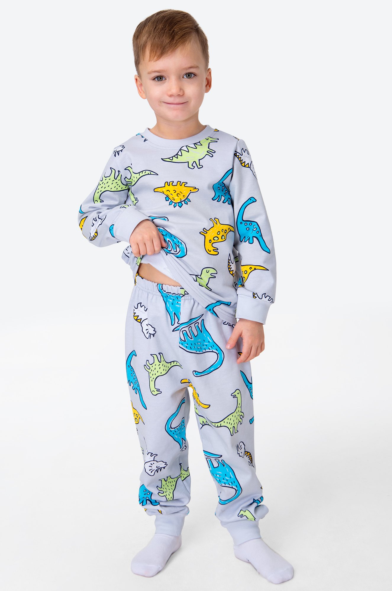 Теплая детская пижама с брюками для мальчиков выполнена из 100% хлопка. Пижама из футера с начесом станет любимым атрибутом отдыха благодаря свободному крою и спокойному серому цвету. Прикольный принт Динозавры поднимает настроение и создает уютную атмосферу.