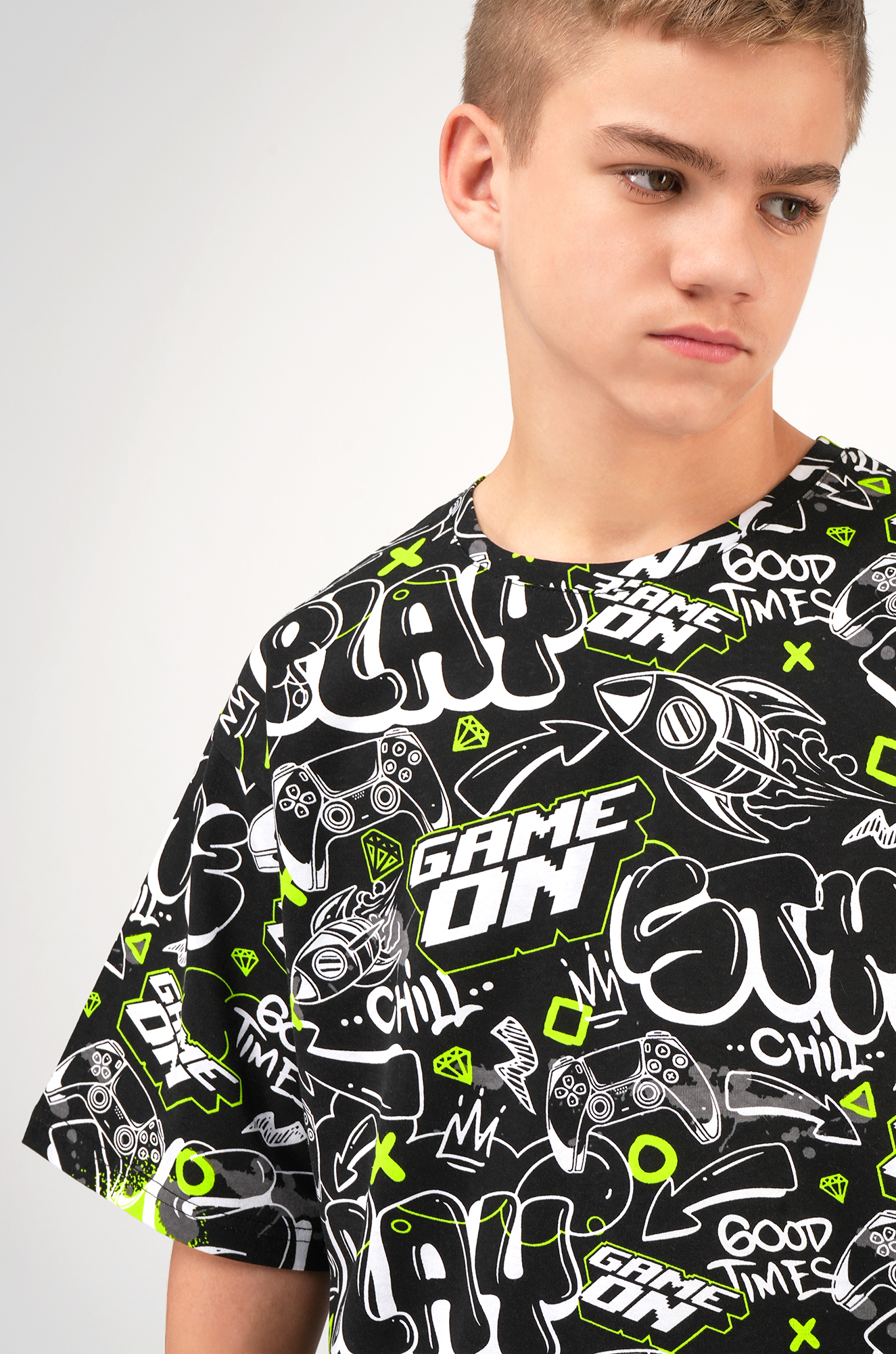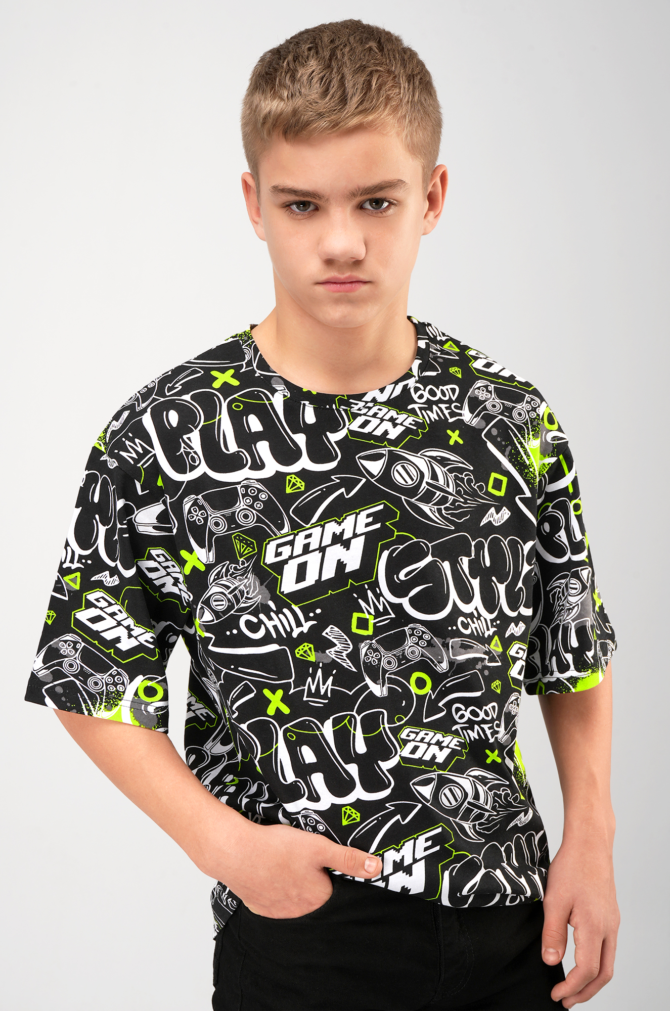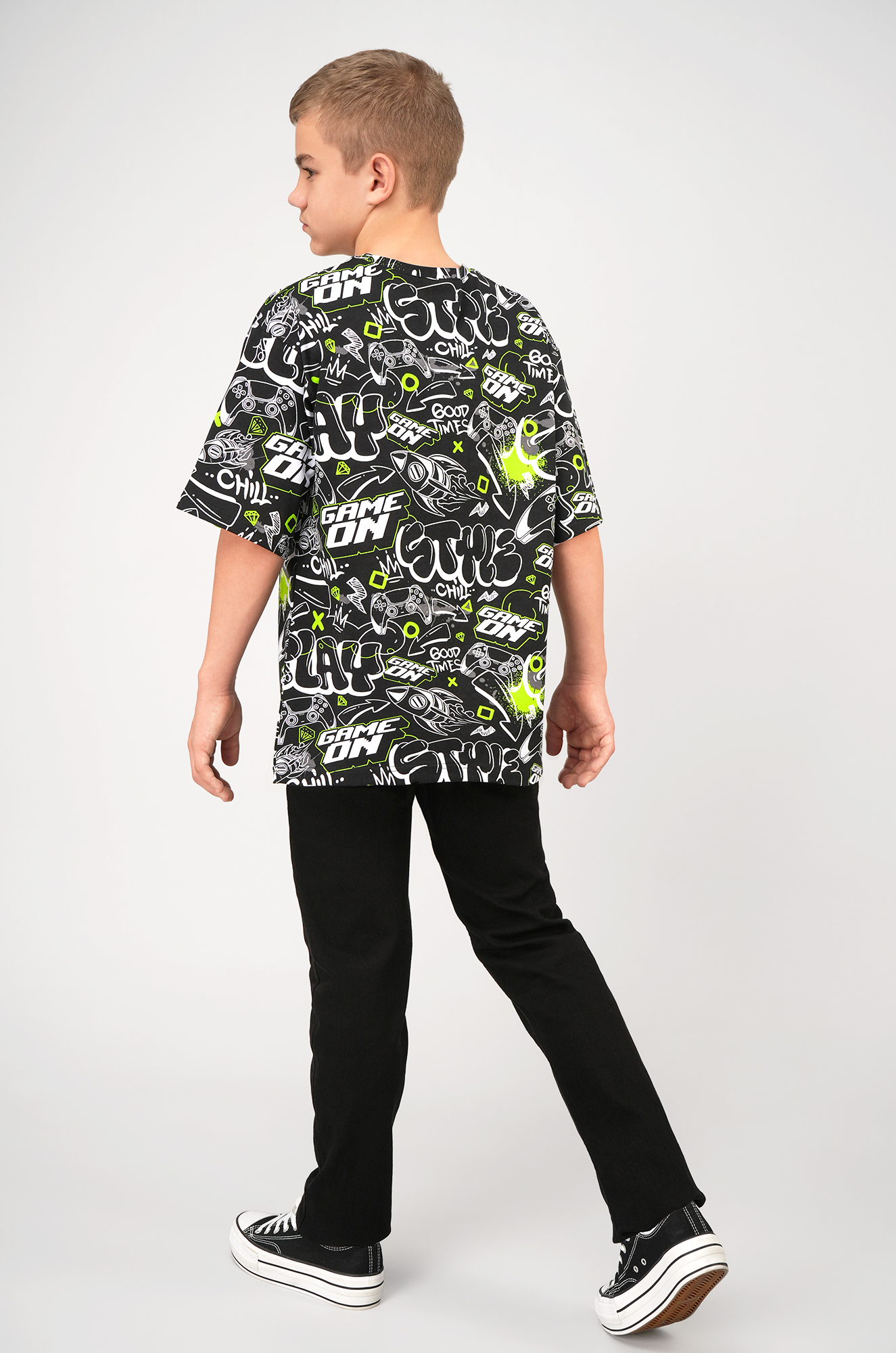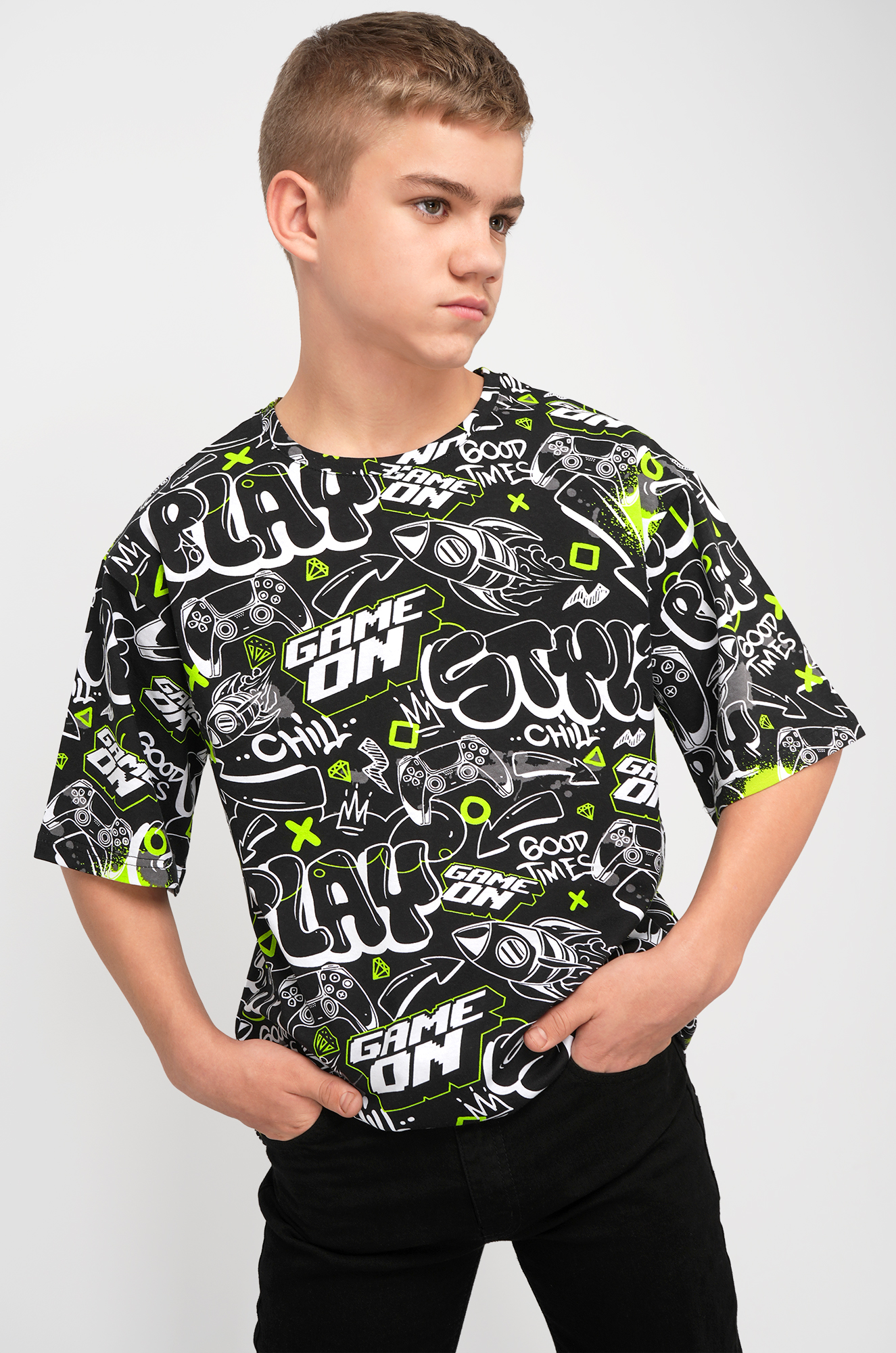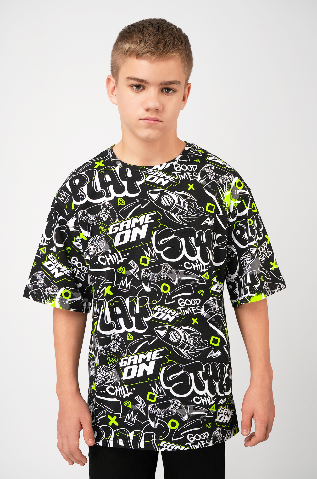 Детская футболка оверсайз привлекает внимание яркими графическими элементами. Футболка из лёгкого хлопкового трикотажа обеспечивает максимальный комфорт и идеально подойдёт для прогулок, учёбы или активного отдыха. Подростковая футболка с рисунком в стиле комиксов смотрится стильно, добавляет динамики образу и подчёркивает индивидуальность.