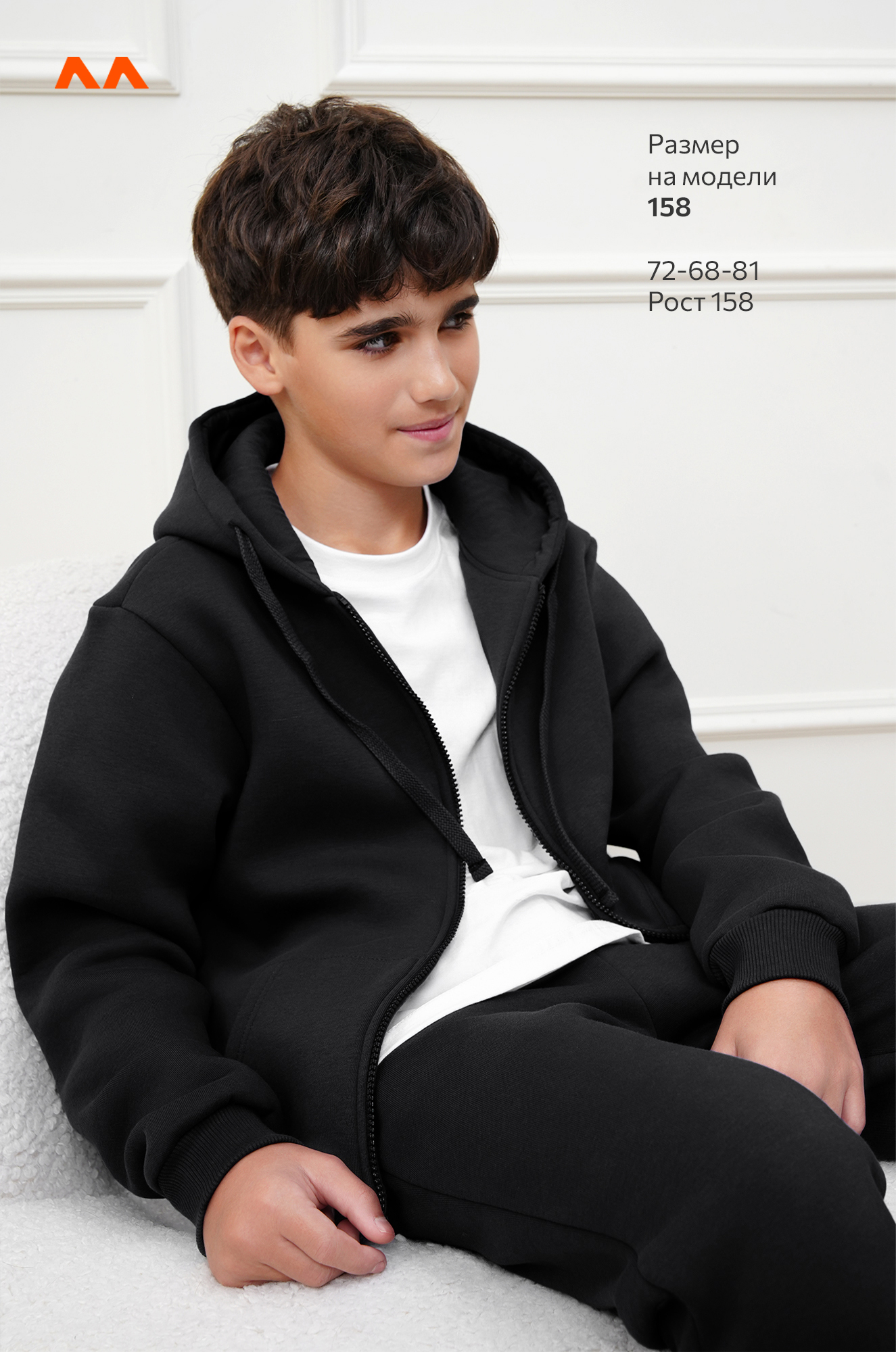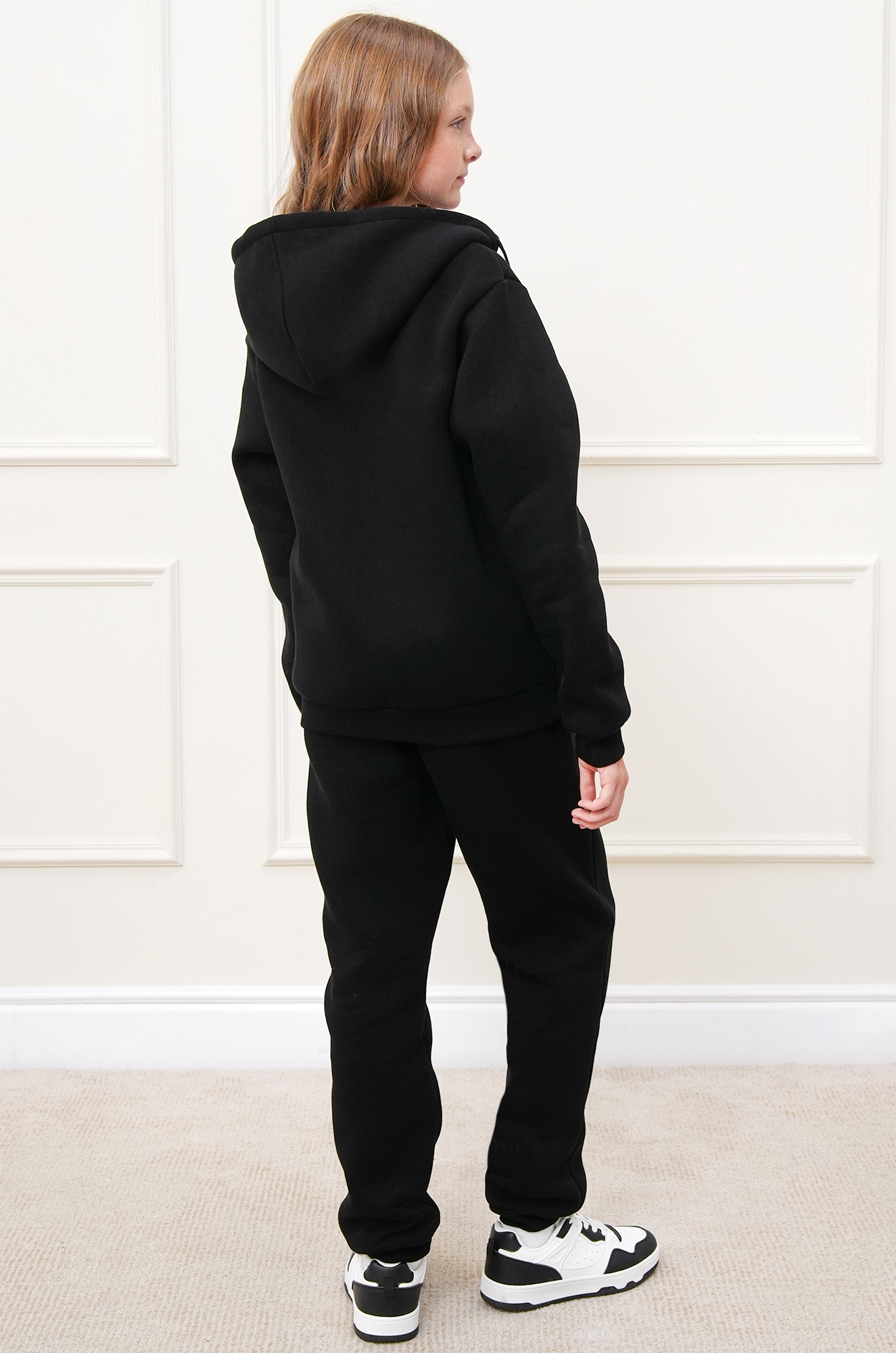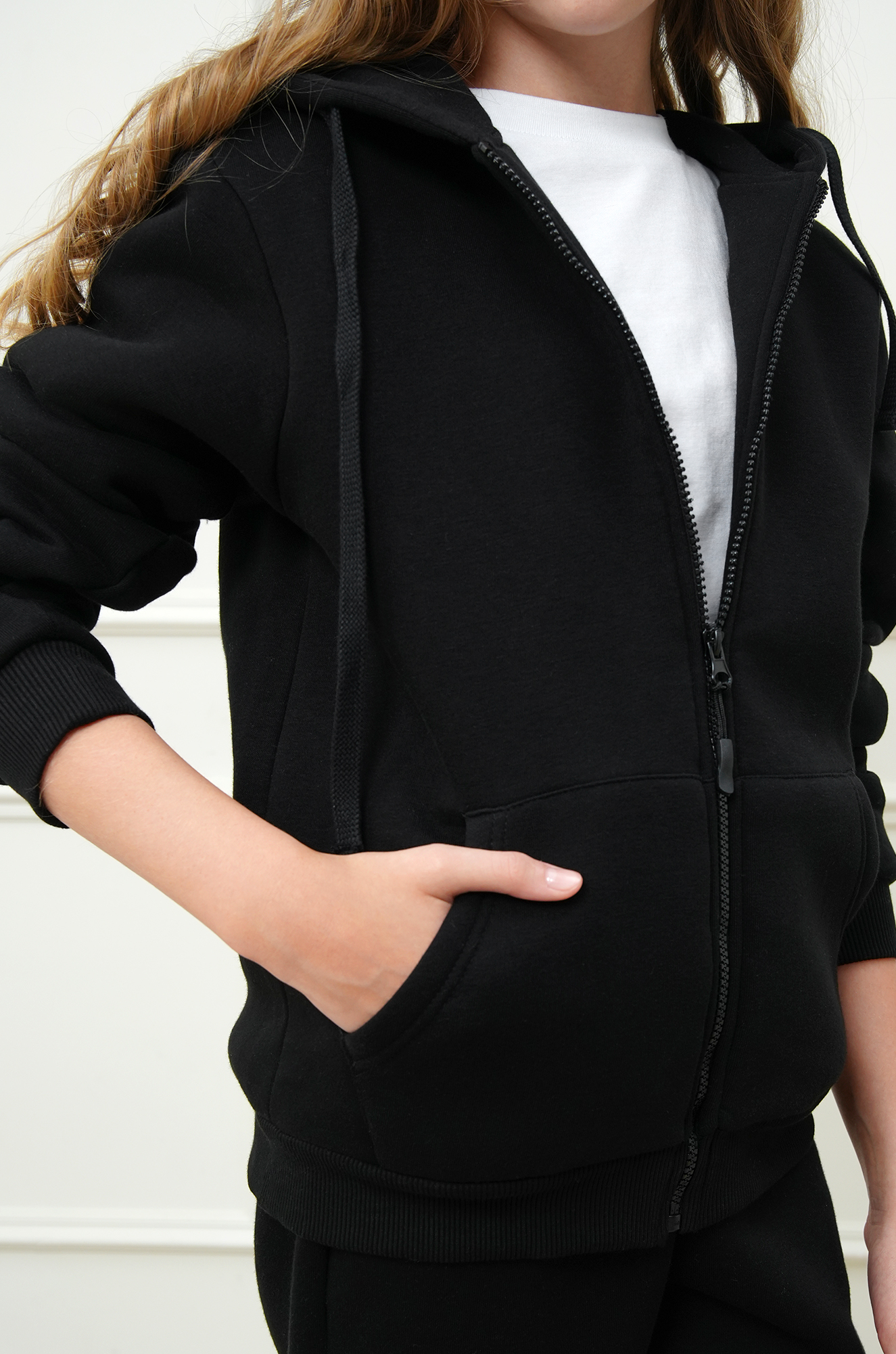 Детский костюм с худи и брюками для мальчиков и девочек выполнен из плотного трикотажа футер с начесом. Базовый черный цвет делает комплект для подростков универсальным и легко вписывается в повседневные образы.