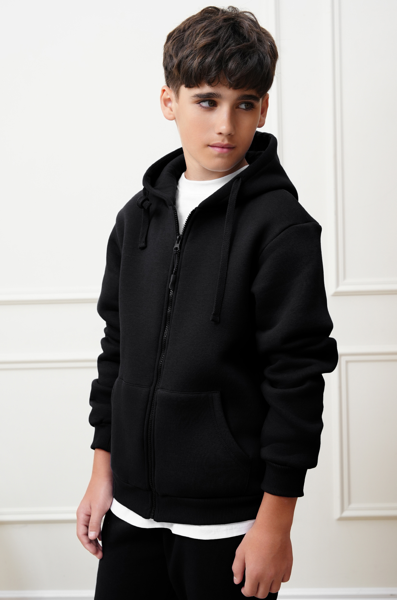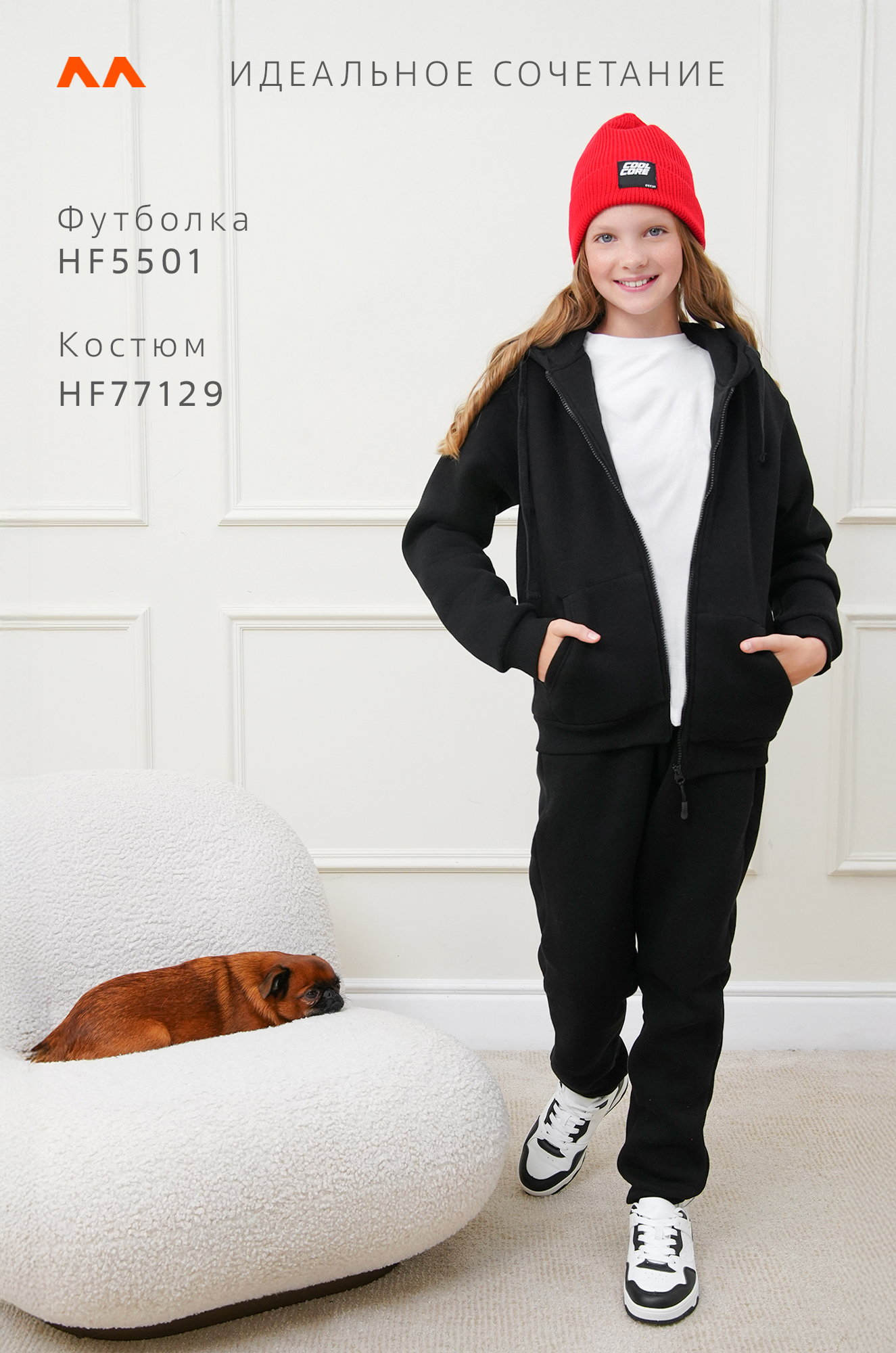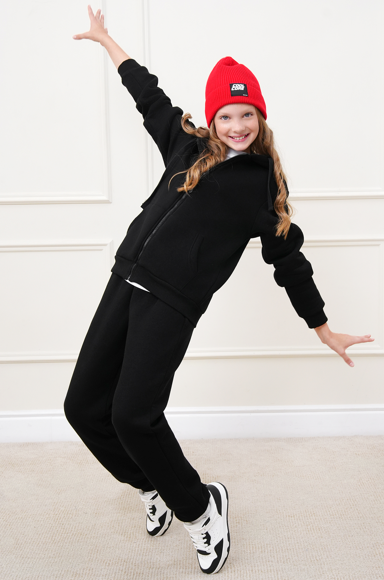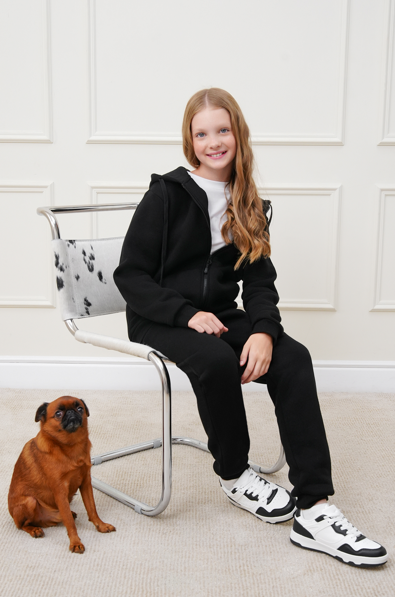 Детский костюм с худи и брюками для мальчиков и девочек выполнен из плотного трикотажа футер с начесом. Базовый черный цвет делает комплект для подростков универсальным и легко вписывается в повседневные образы.