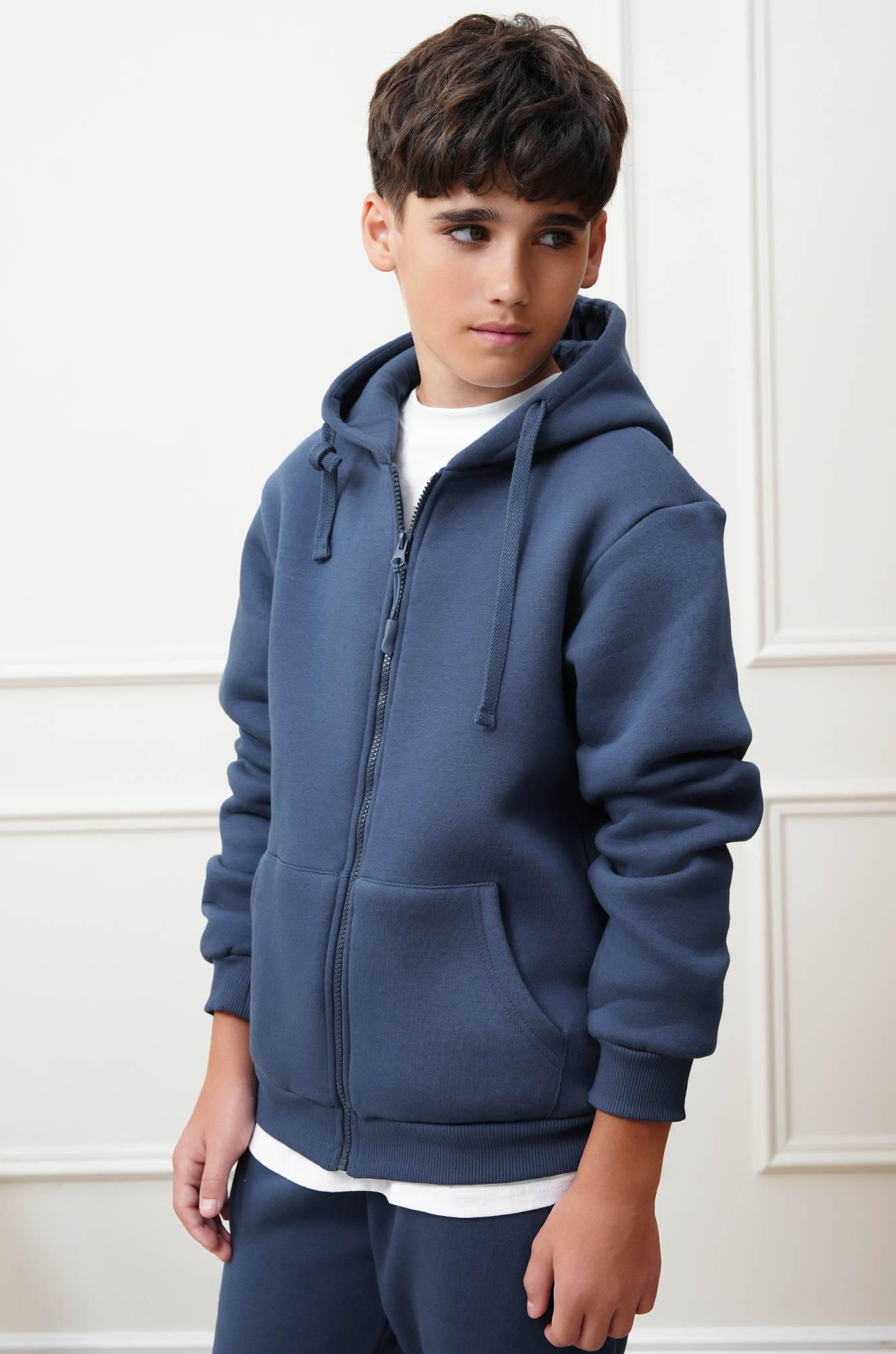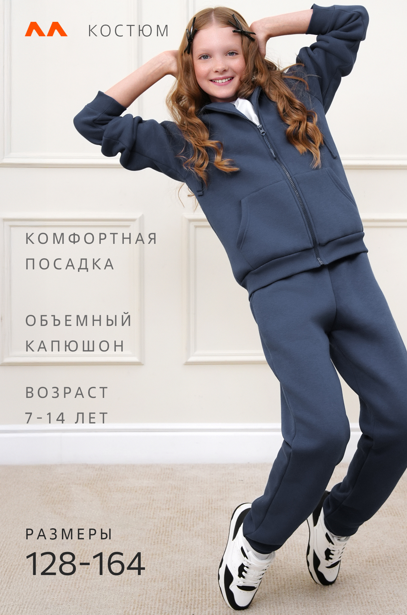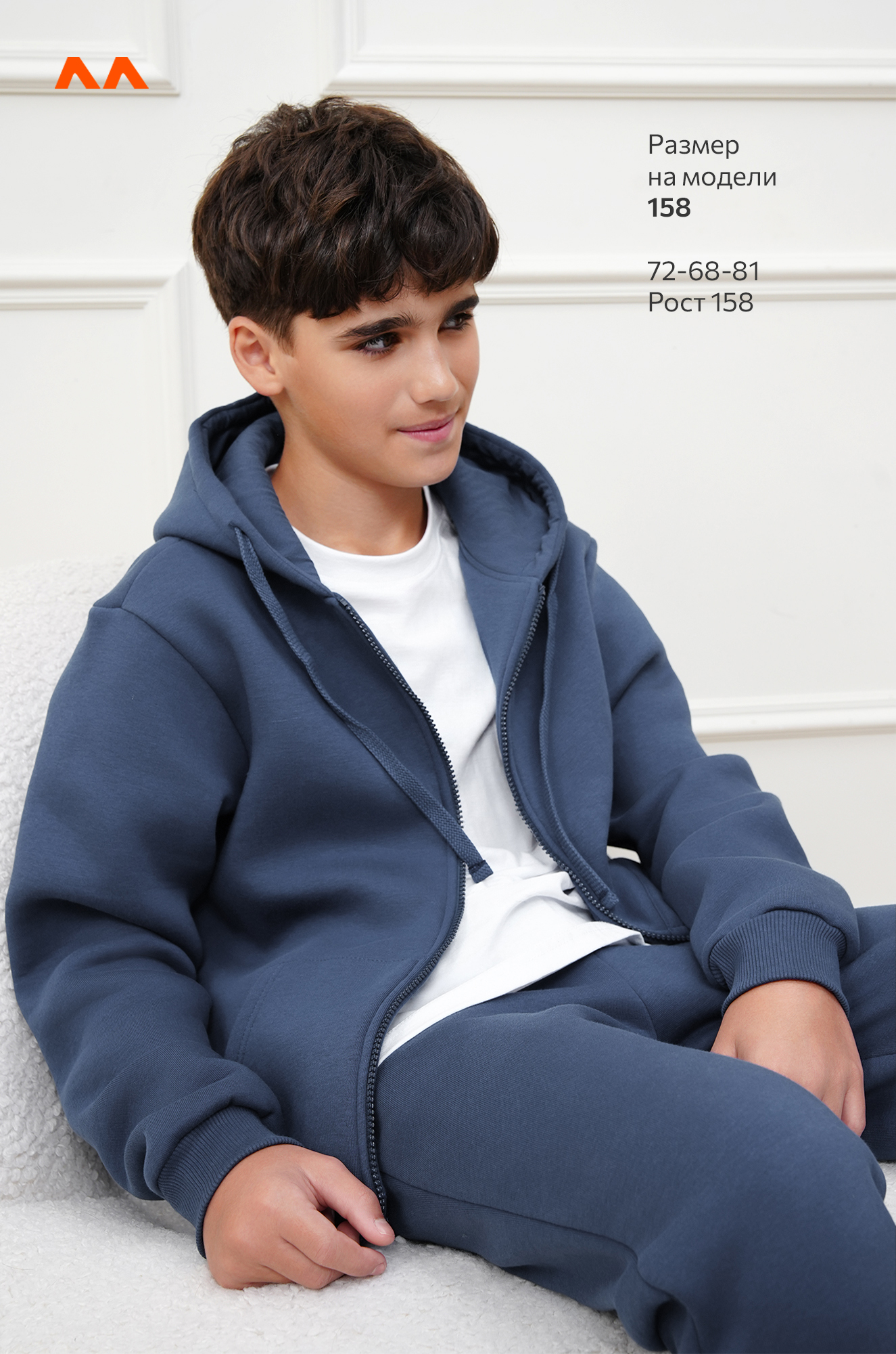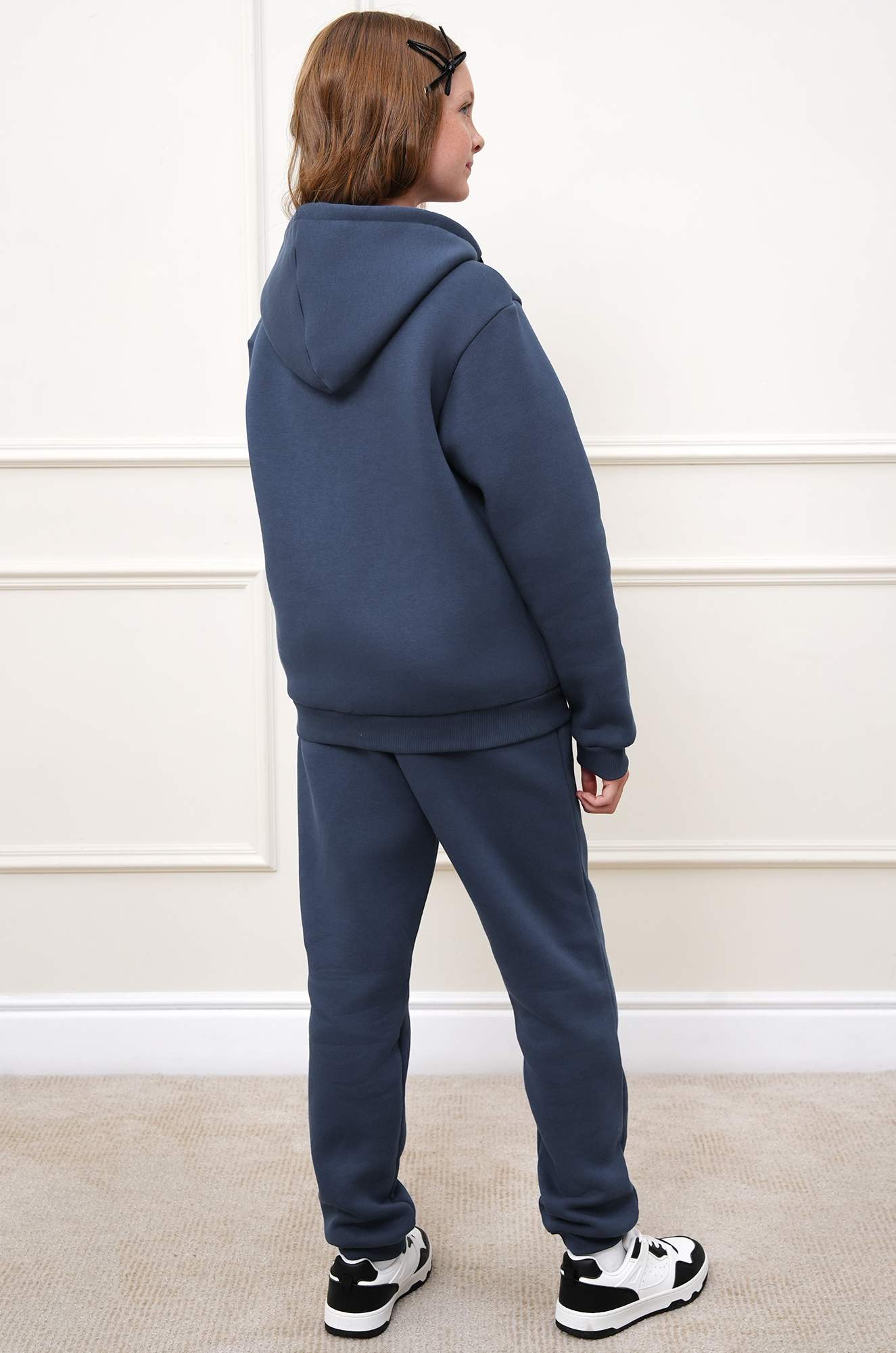 Детский костюм с худи и брюками для мальчиков и девочек выполнен из плотного трикотажа футер с начесом. Базовый синий цвет делает комплект для подростков универсальным и легко вписывается в повседневные образы.