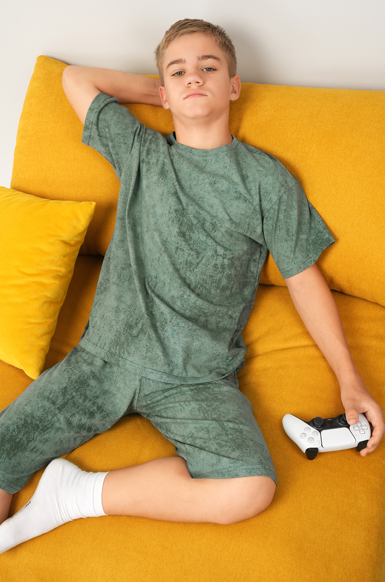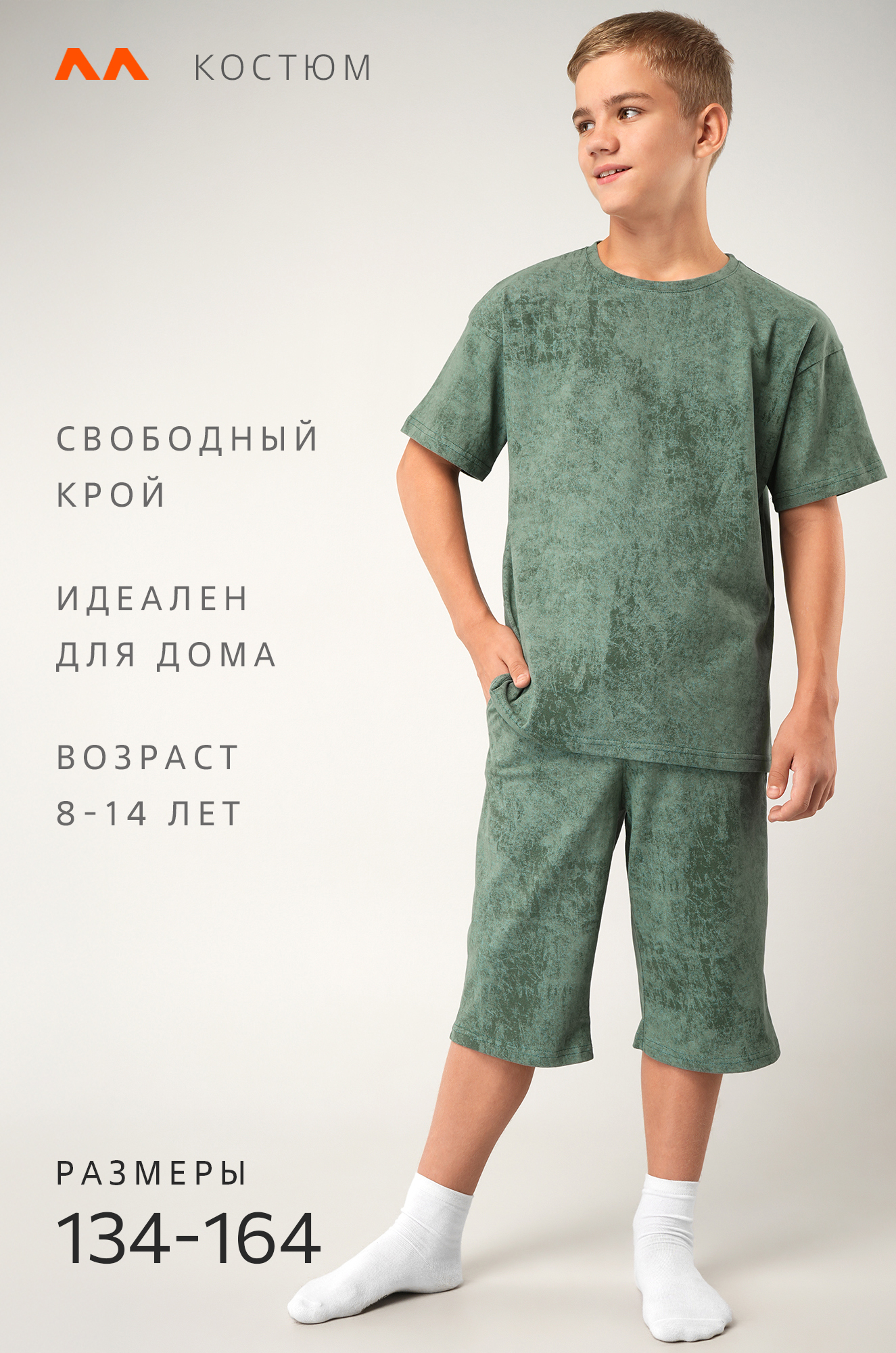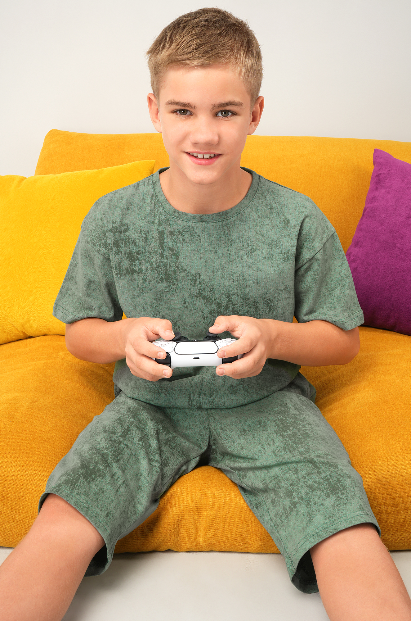 Зеленый костюм с винтажным эффектом варенка подходит для сна и отдыха дома.