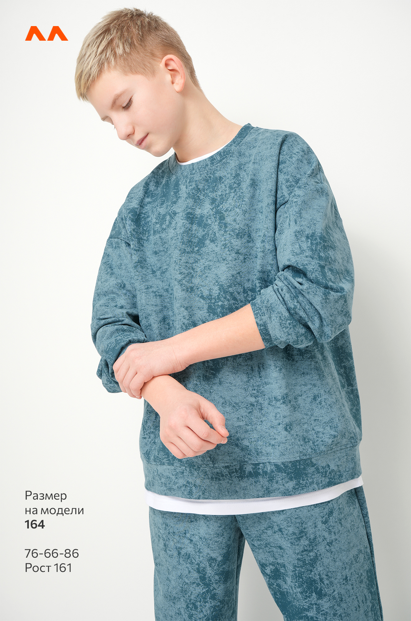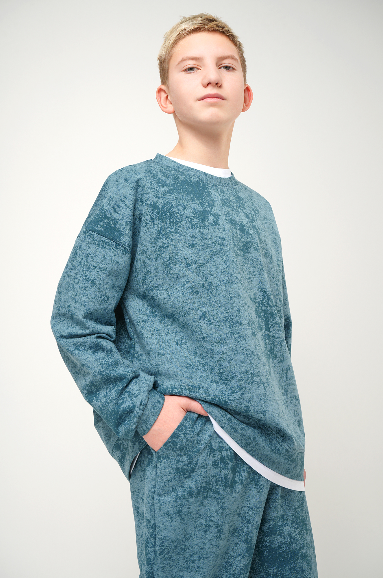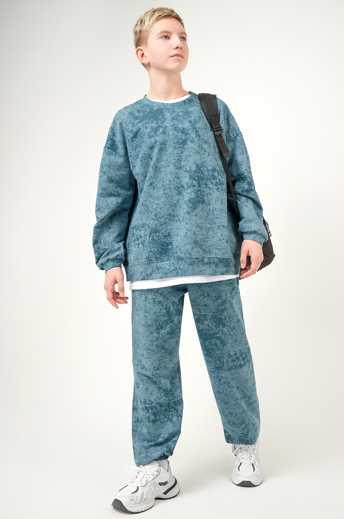 Стильный детский костюм бирюзового цвета для мальчика подростка вдохновляет на активность. Мягкая толстовка оверсайз и широкие брюки на манжетах придают полную свободу движений.