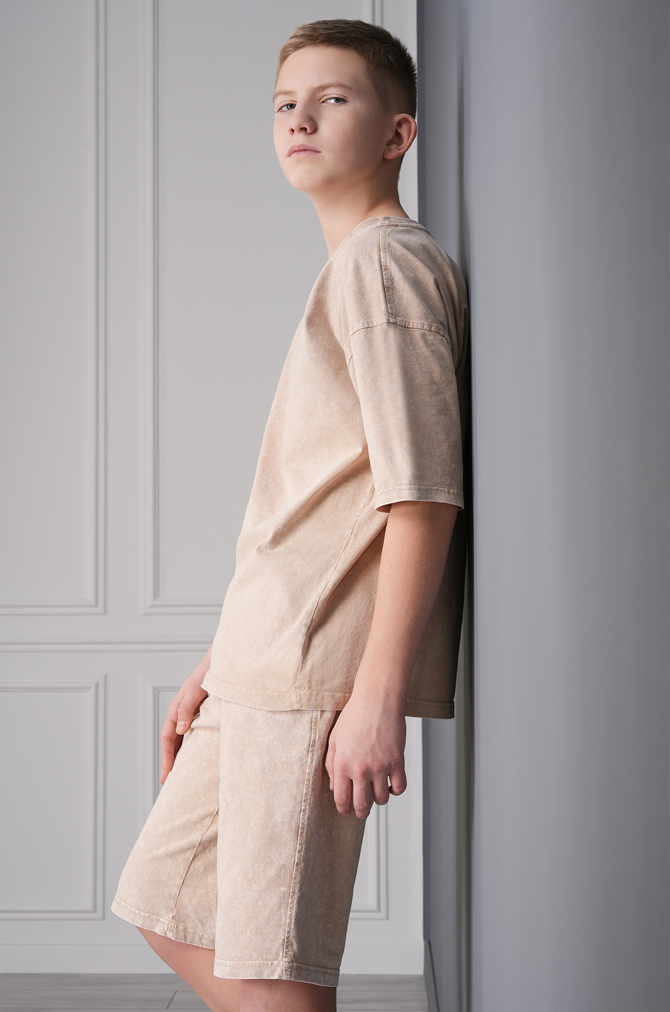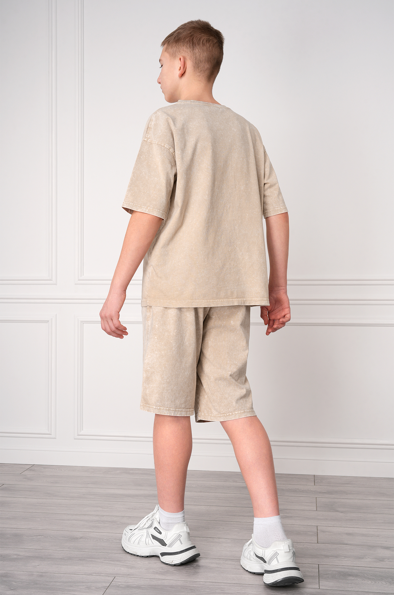 Летний костюм с шортами — универсальное решение на каждый день. Спортивный костюм для мальчика состоит из футболки оверсайз и удлинённых шорт. Вареный костюм для детей и подростков выполнен из 100% хлопка.