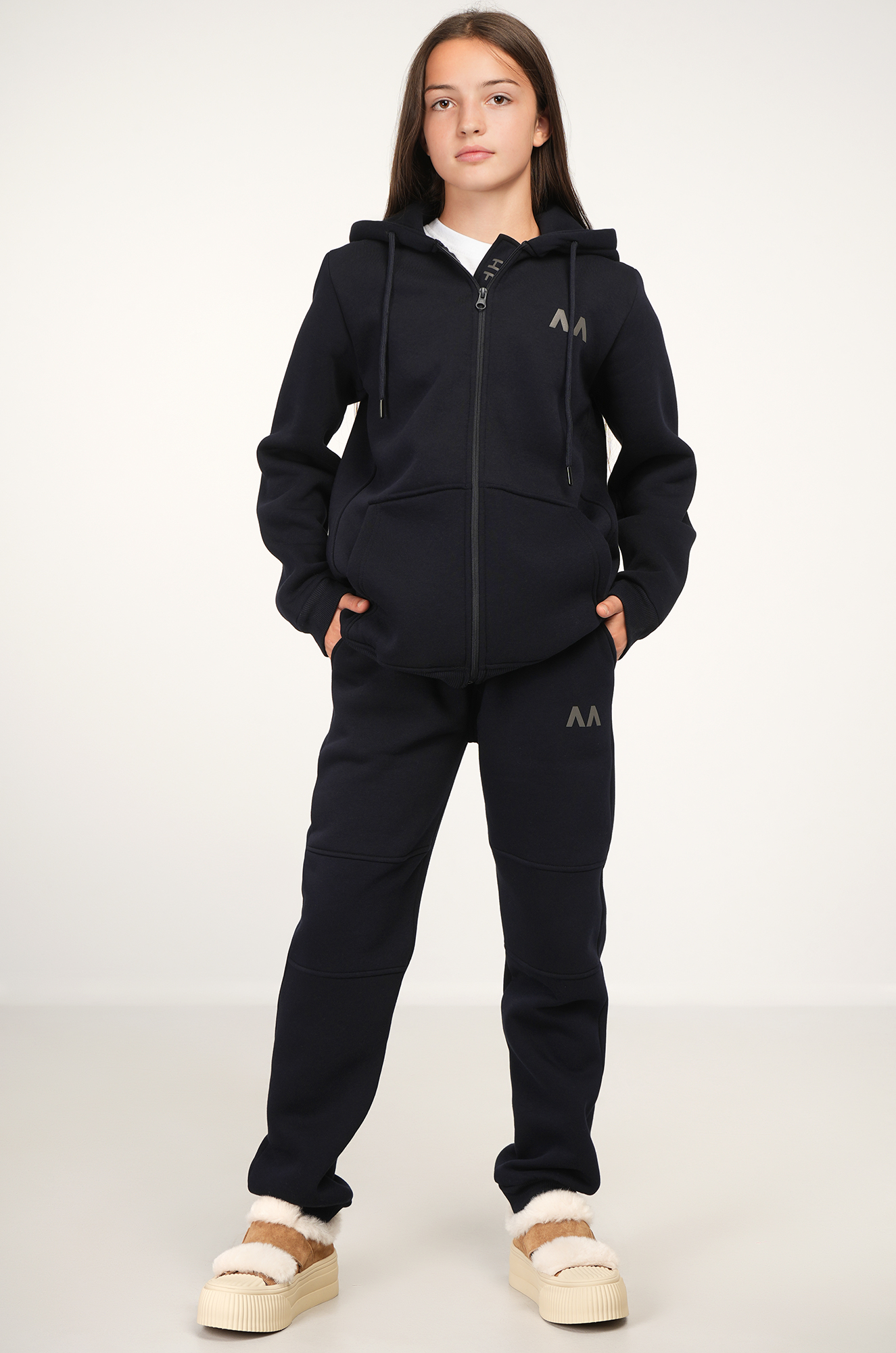 — утепленный костюм с брюками-джоггерами не стесняет движений;