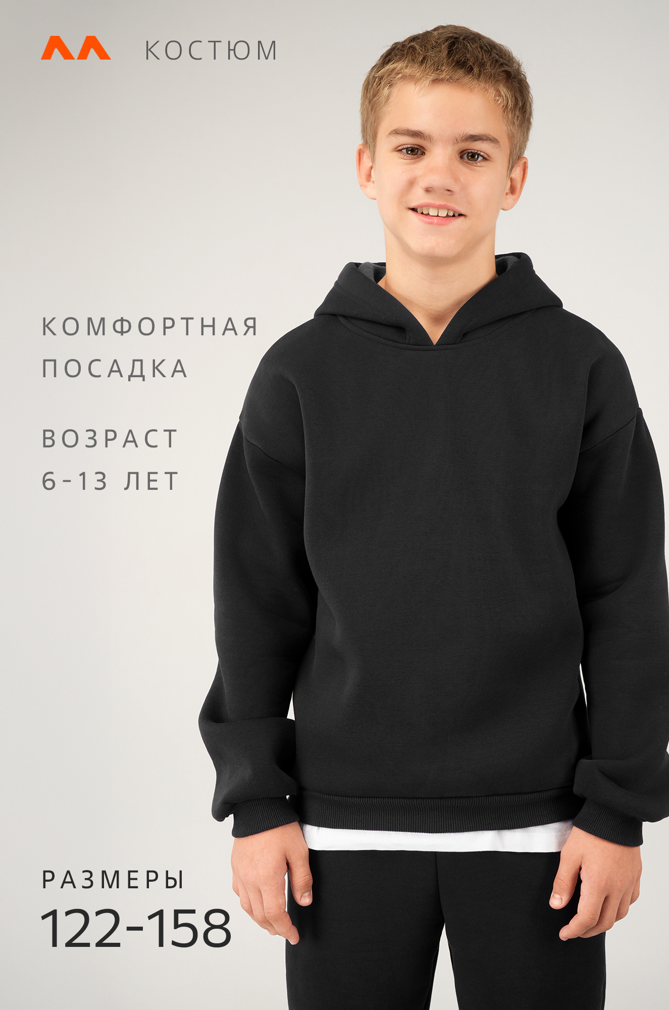 Теплый детский спортивный костюм с начесом для мальчиков и мальчиков-подростков выполнен из натурального 100% хлопка. Удобный капюшон, карманы в брюках, крой оверсайз делают костюм невероятно уютным. Зимний утепленный костюм двойка создан для стильных повседневных образов.