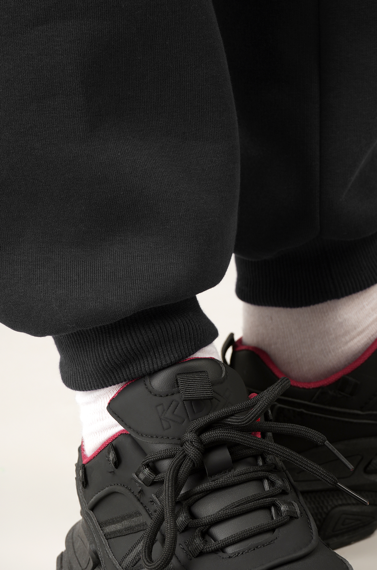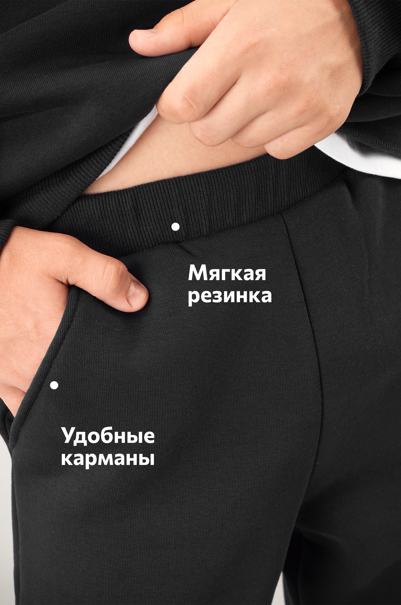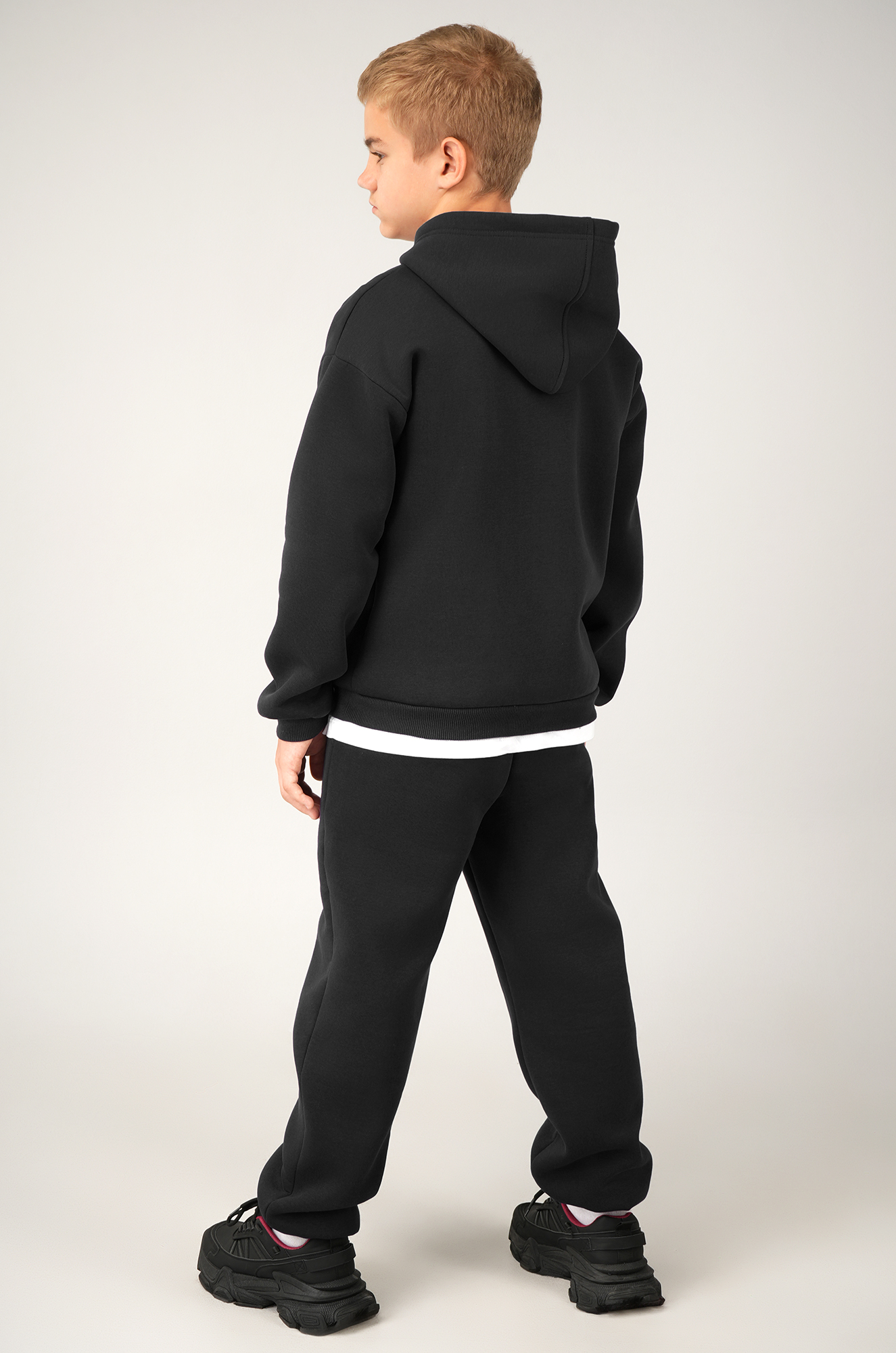 Черный спортивный костюм для детей выполнен из плотного трикотажа футер трехнитка. Начес отлично сохраняет тепло и не пропускает холодный воздух. Костюм хорошо тянется и держит форму даже после частых стирок.