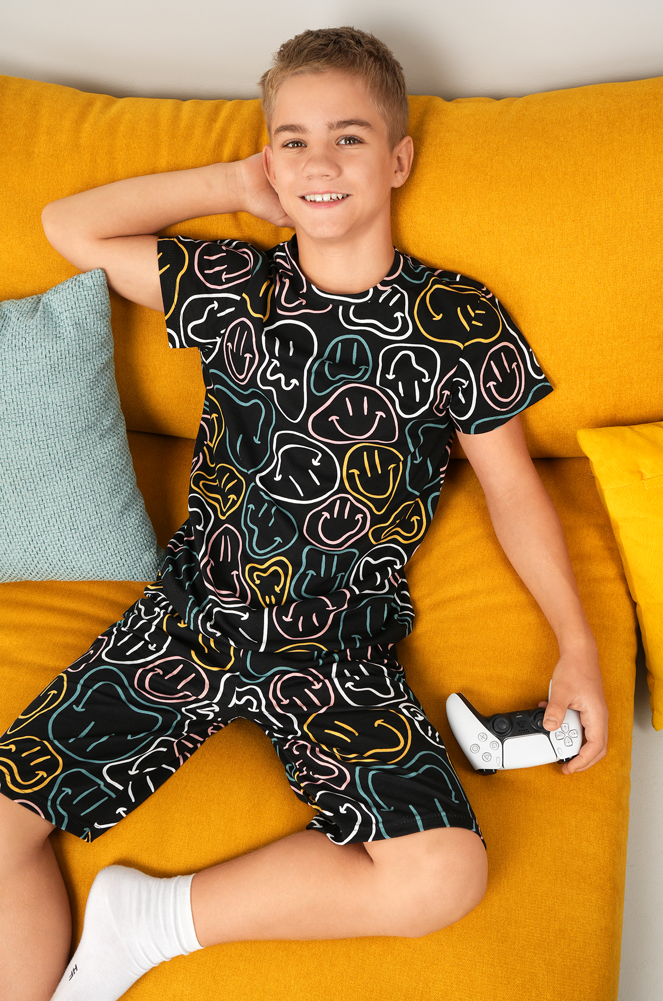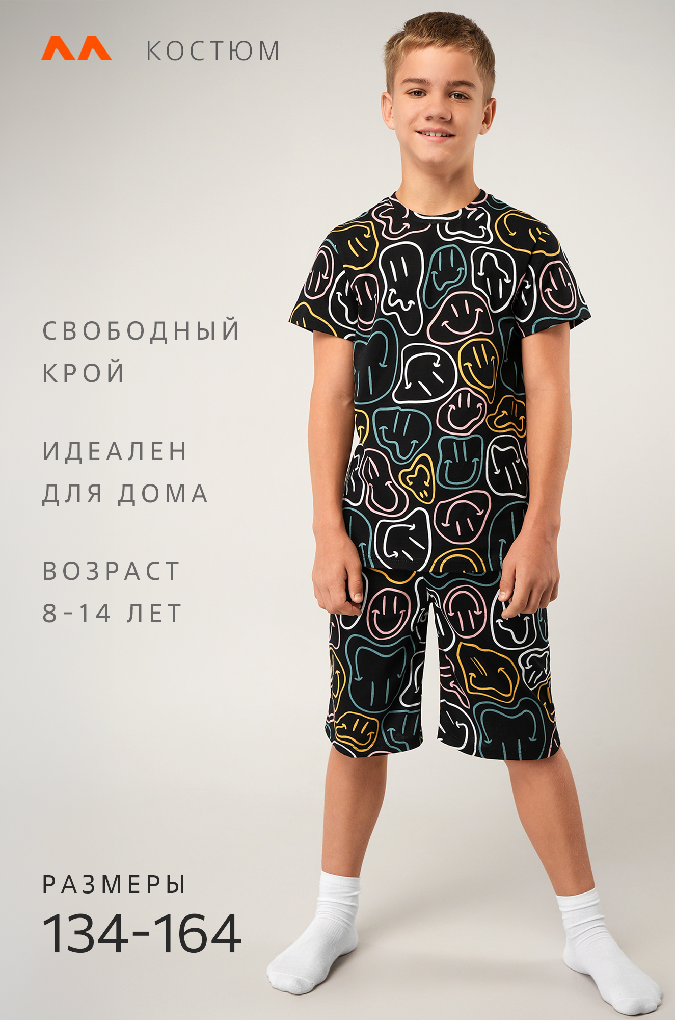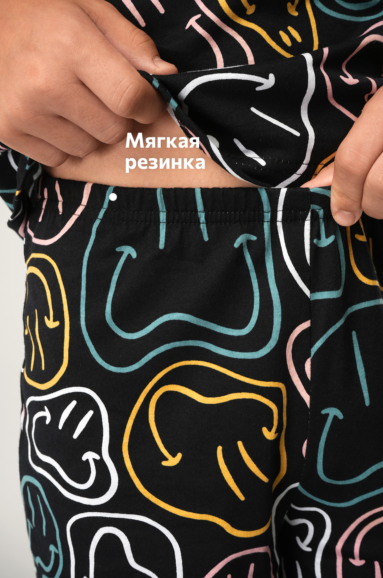 Черный костюм со смайликами подходит для сна и отдыха. Подростковый трикотажный костюм идеален для дома.