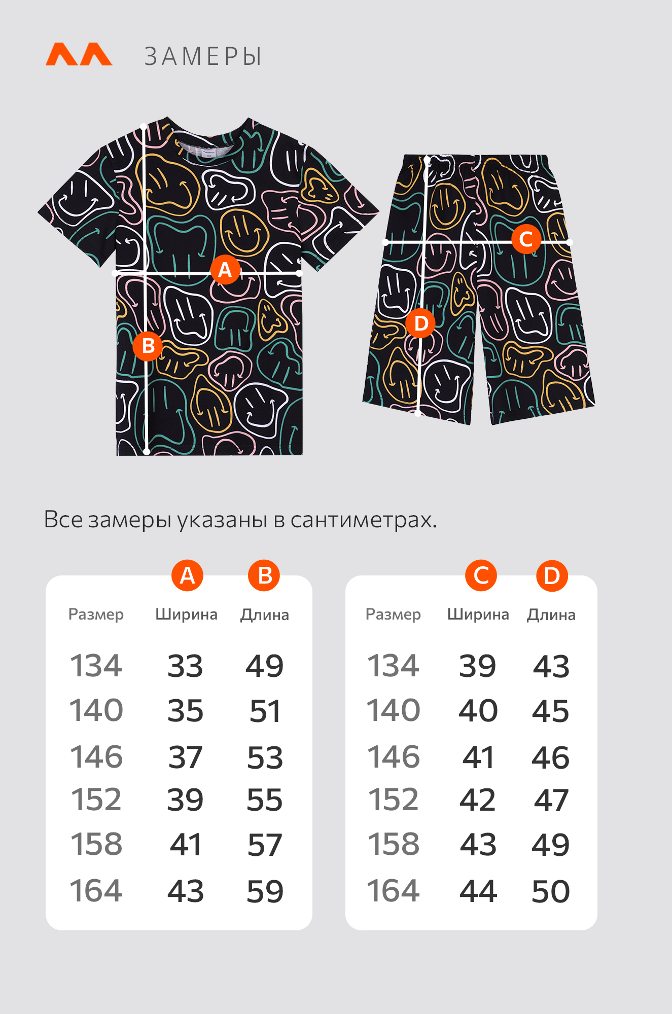 – детский костюм двойка с принтом Смайлы выполнен из натурального хлопка средней плотности (145 г/м²) — дышит и держит форму;
