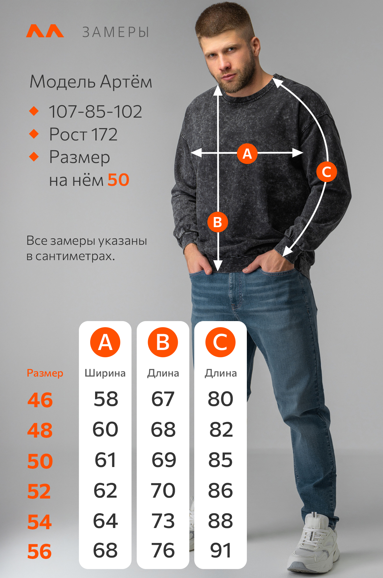 Модель Артем, рост 172 см, параметры 107-85-102 см. На нем размер 50.
