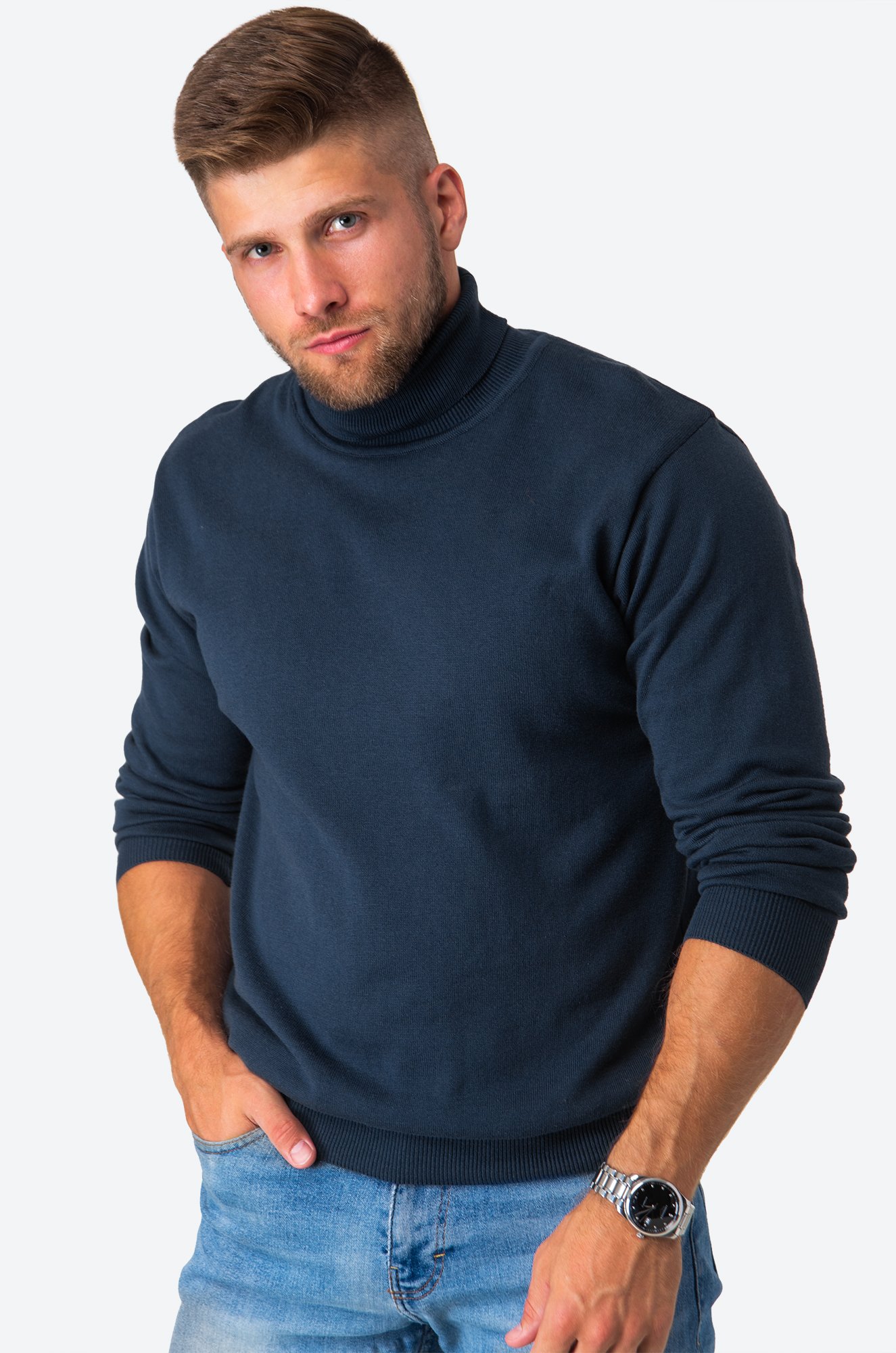Мужская водолазка оттенка индиго — отличный базовый вариант для стильных образов! Вязаный свитер с высоким воротом и длинным рукавом выглядит современно и аккуратно. Прилегающий, но не стесняющий крой создает отличную посадку, делая джемпер универсальной основой гардероба.