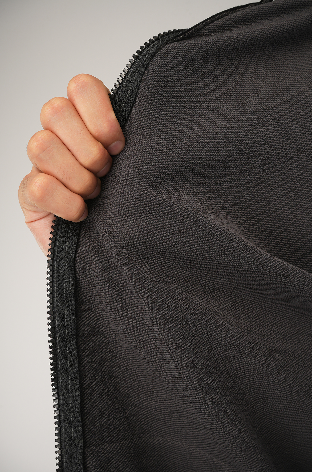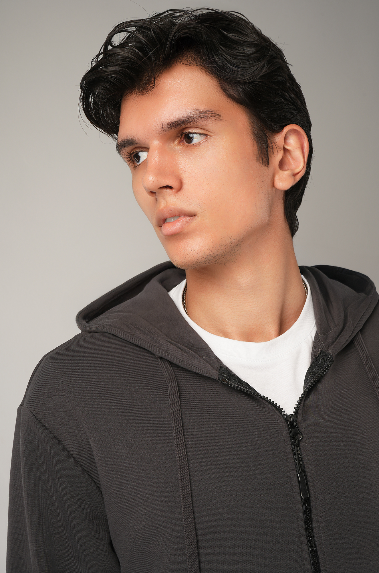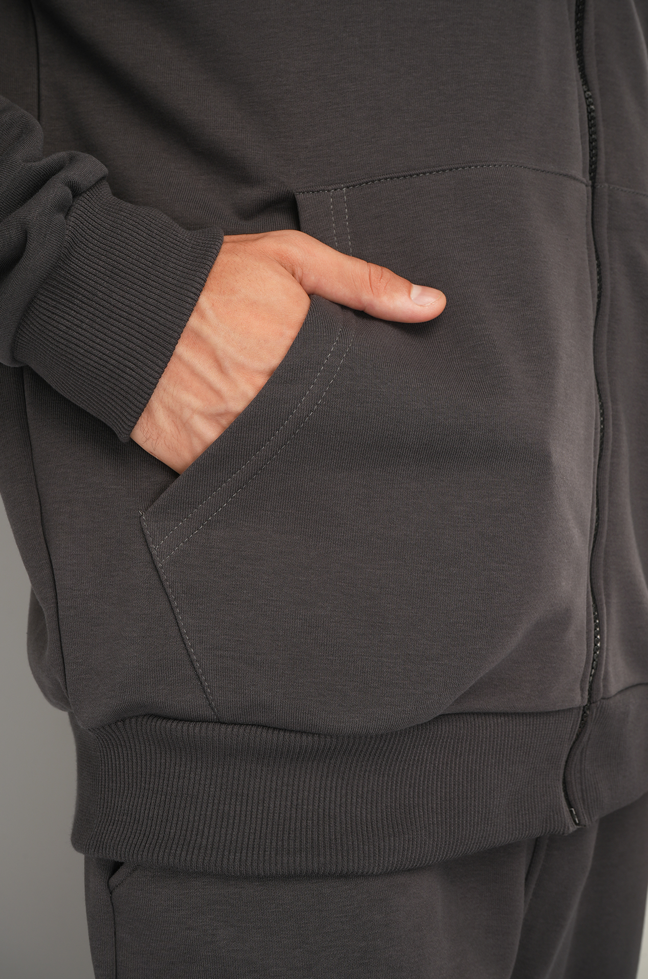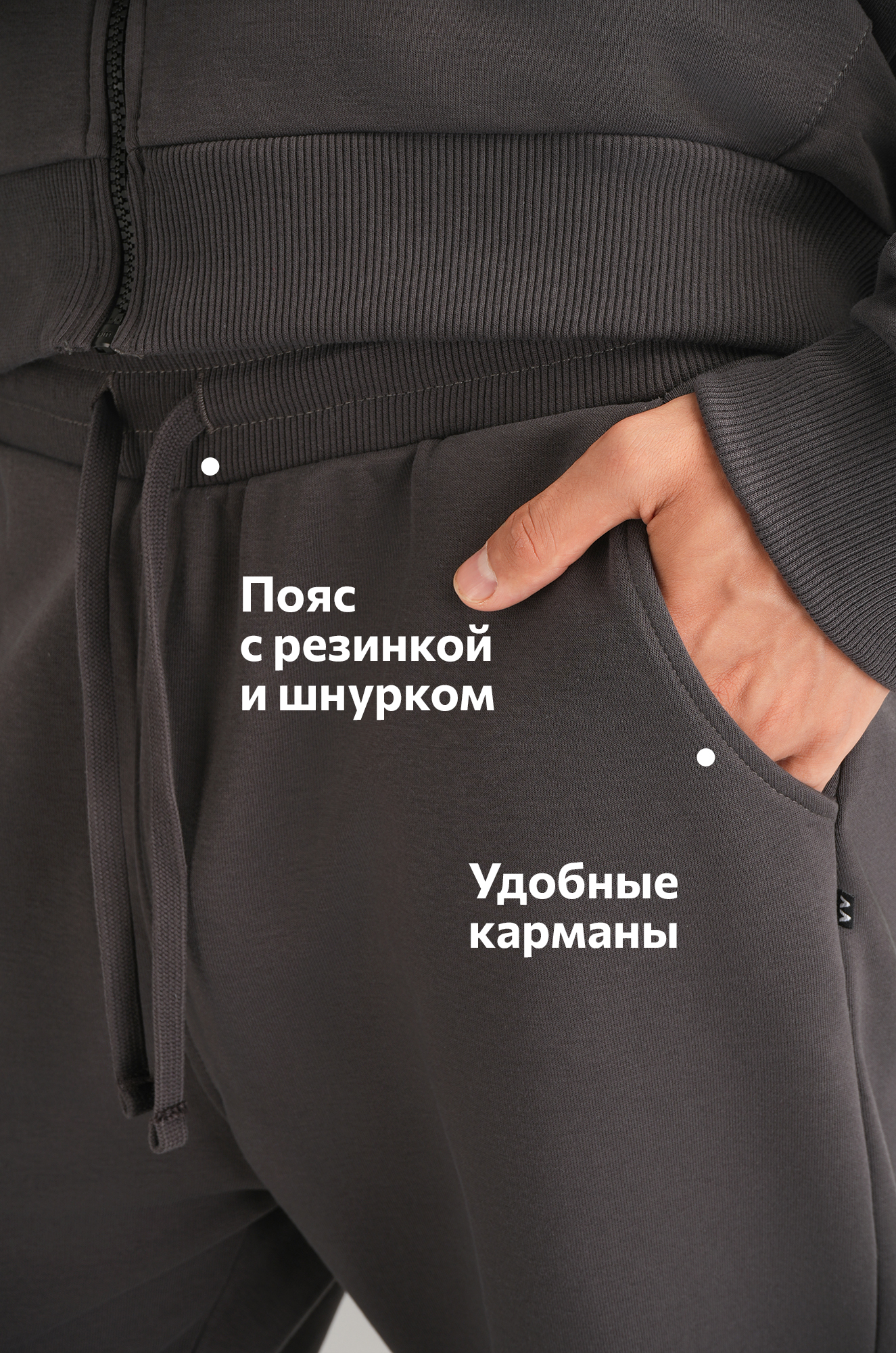 — однотонный темно-серый костюм со штанами выполнен из плотного футера трехнитки;