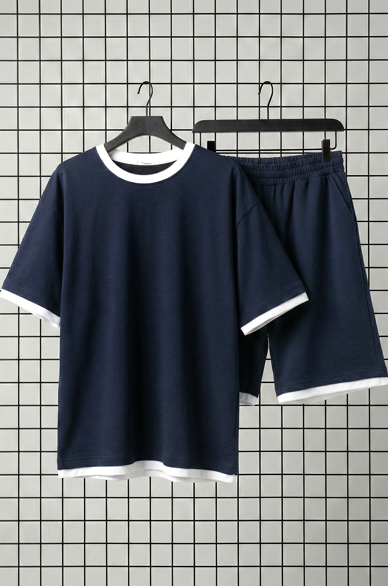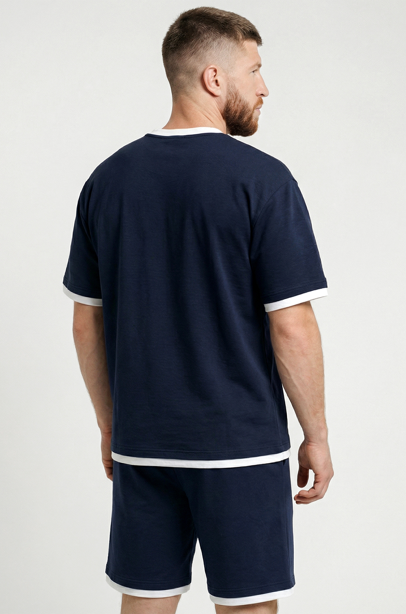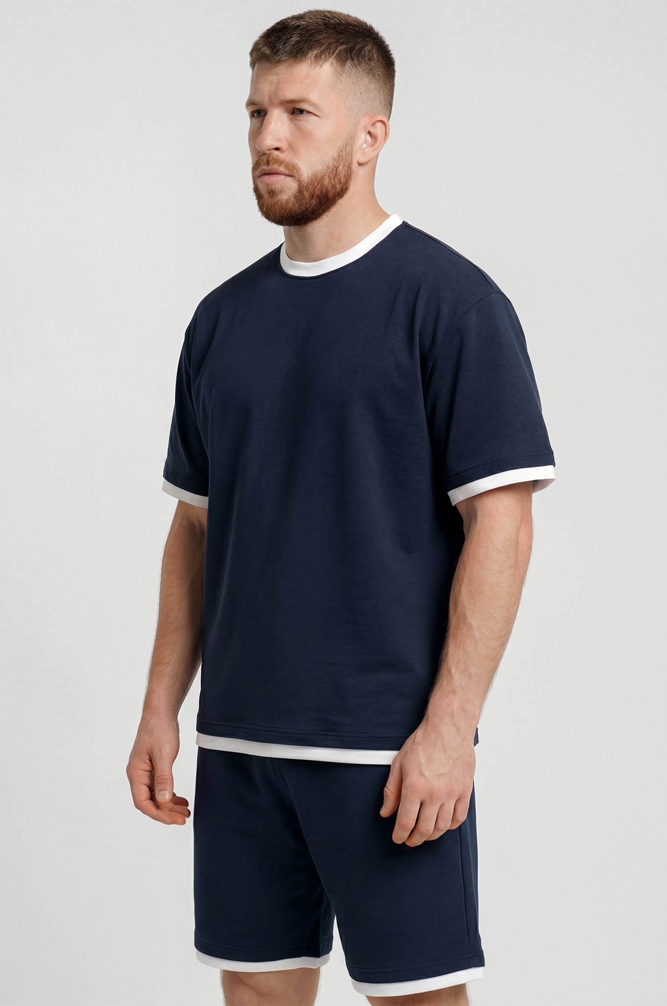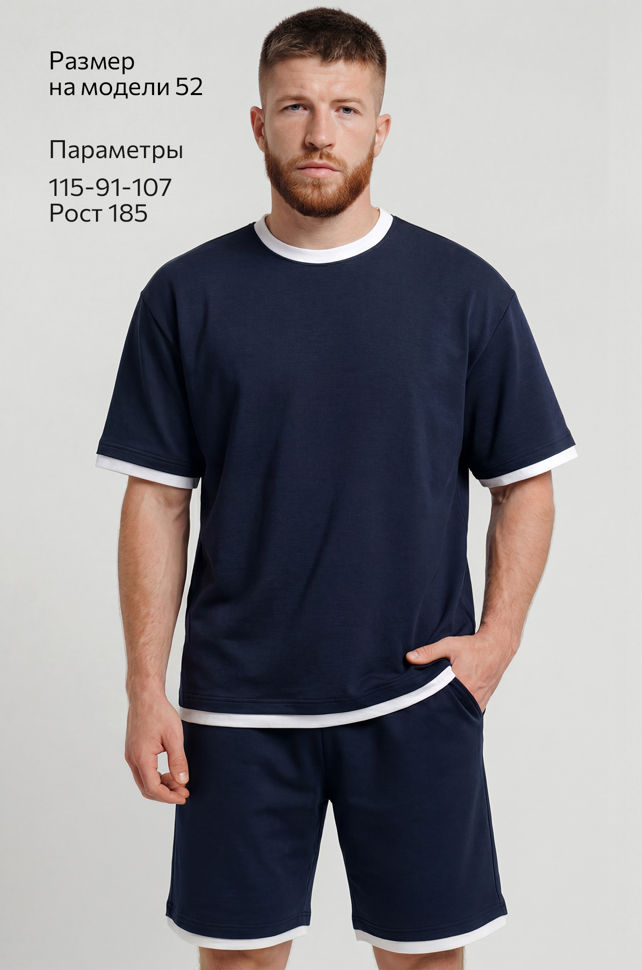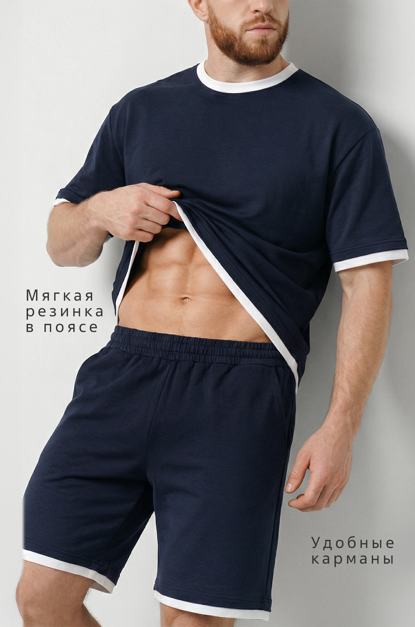 Мужской костюм с шортами создан для тех, кто ценит свободу движений и практичность. Хлопковый спортивный костюм двойка темно-синего цвета отлично подойдёт для тренировок, активного отдыха и как домашний костюм для удобства в повседневной жизни.