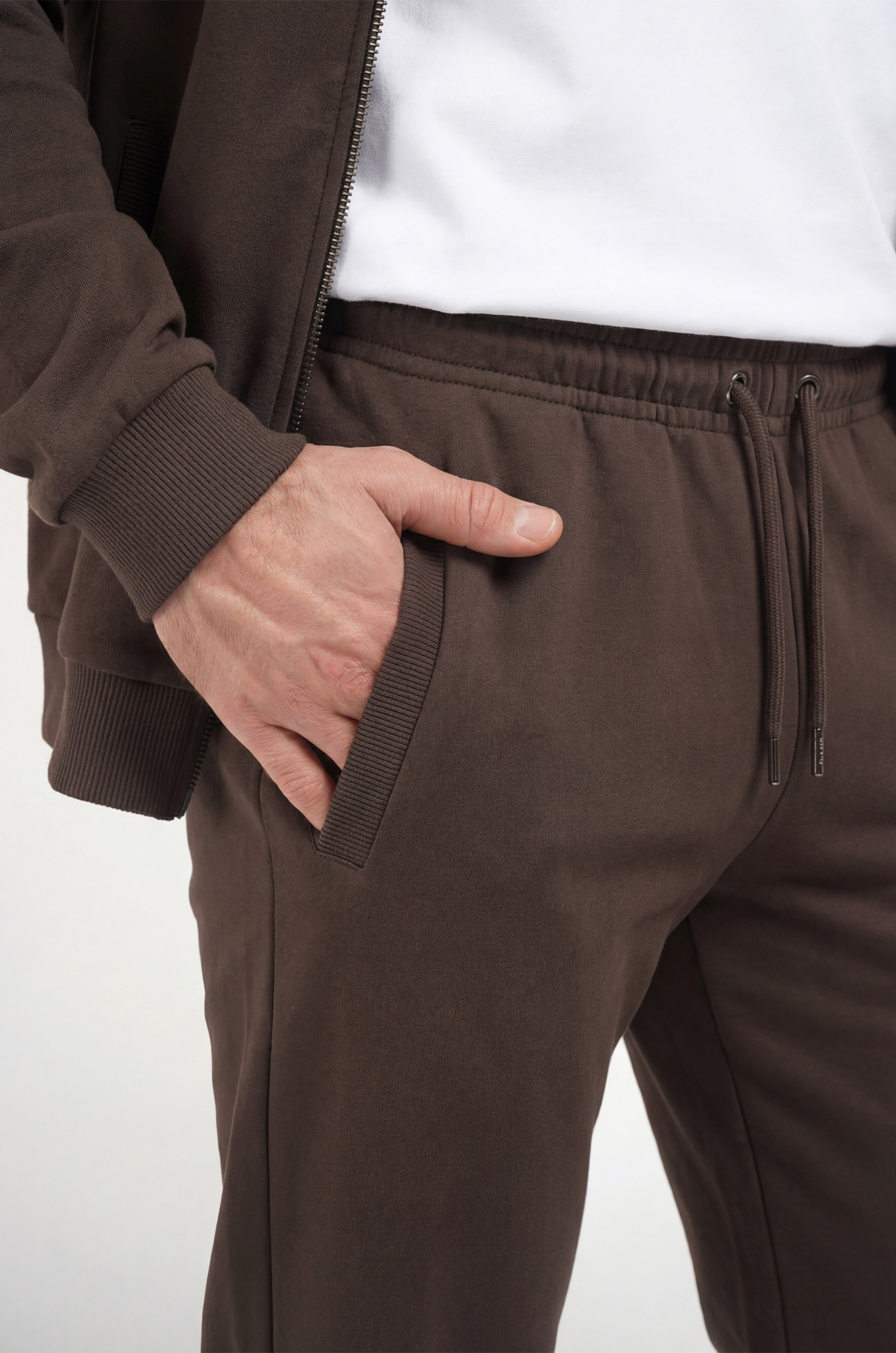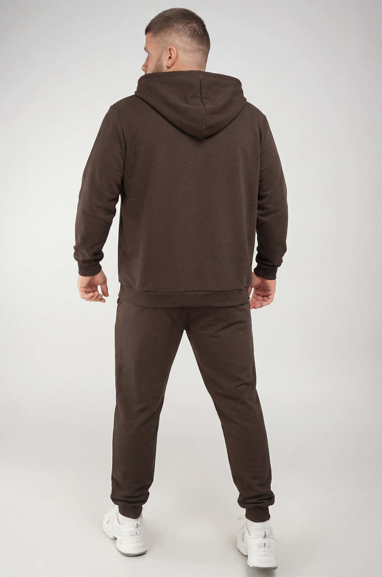 Мужской спортивный костюм из футера трехнитки создан для комфорта и свободы движений. Однотонный коричневый костюм смотрится стильно и современно, а натуральный хлопковый трикотаж делает его удобным и практичным.