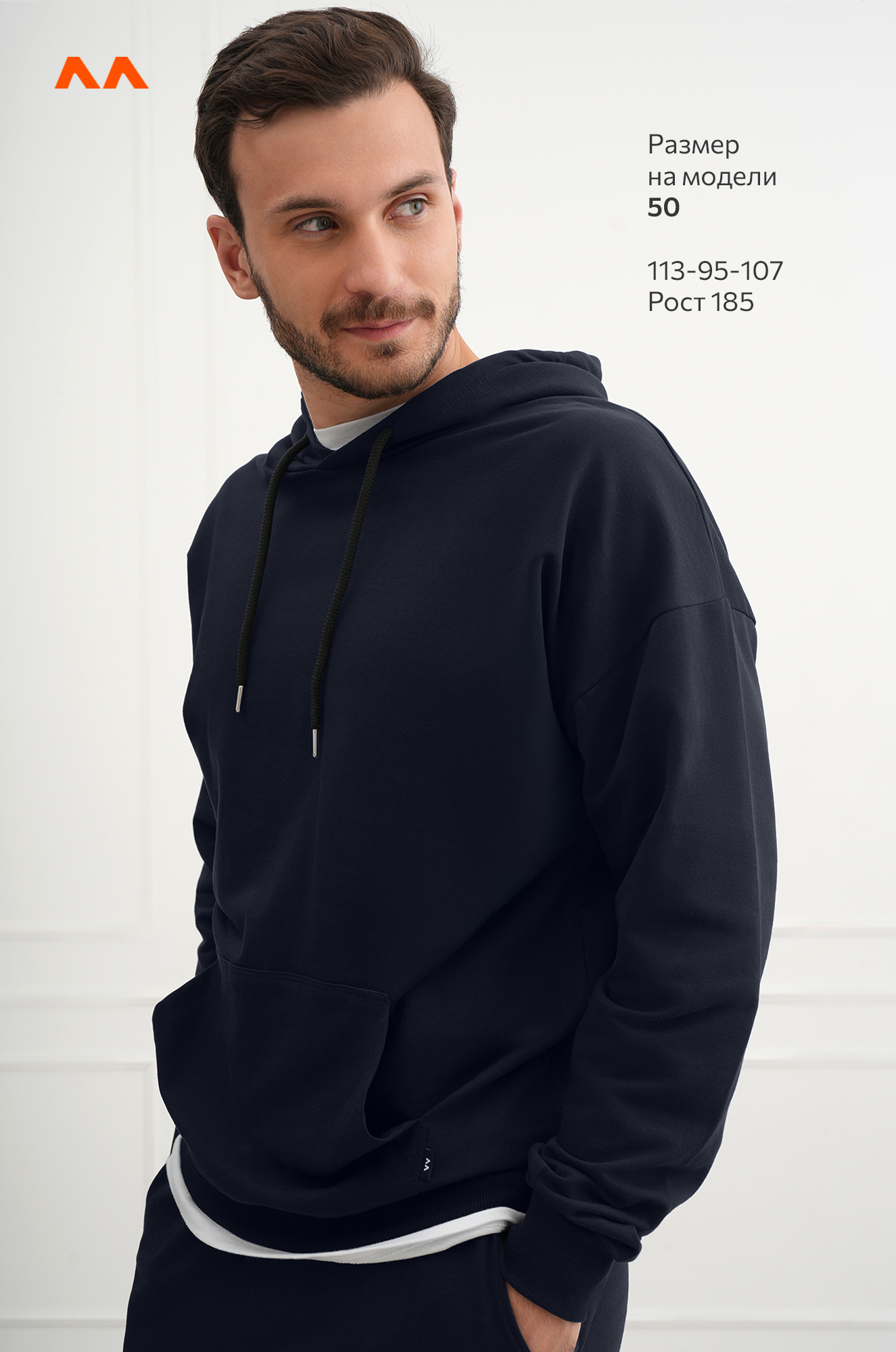 Рост модели 185, параметры: объем груди 113, объем талии 95, объем бедер 107. На нем размер 50.