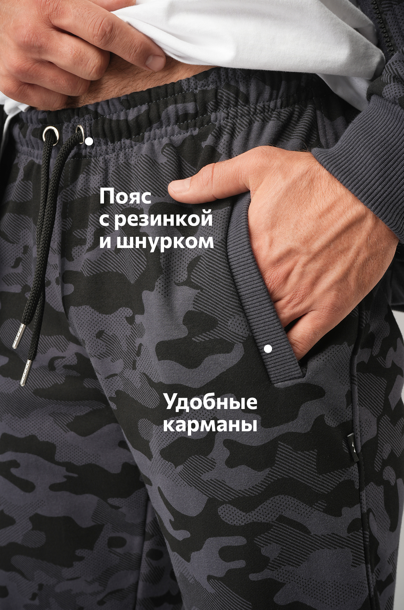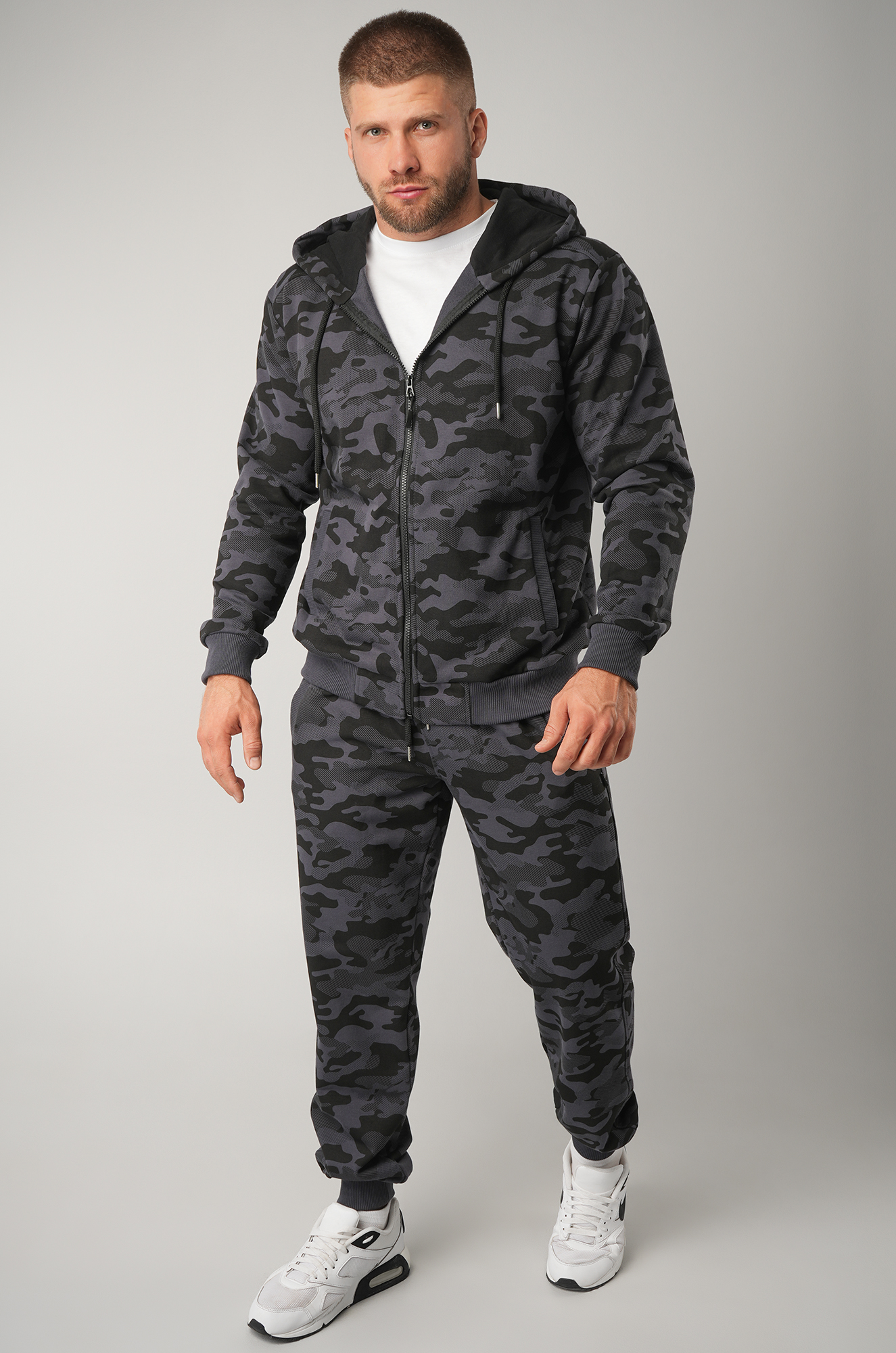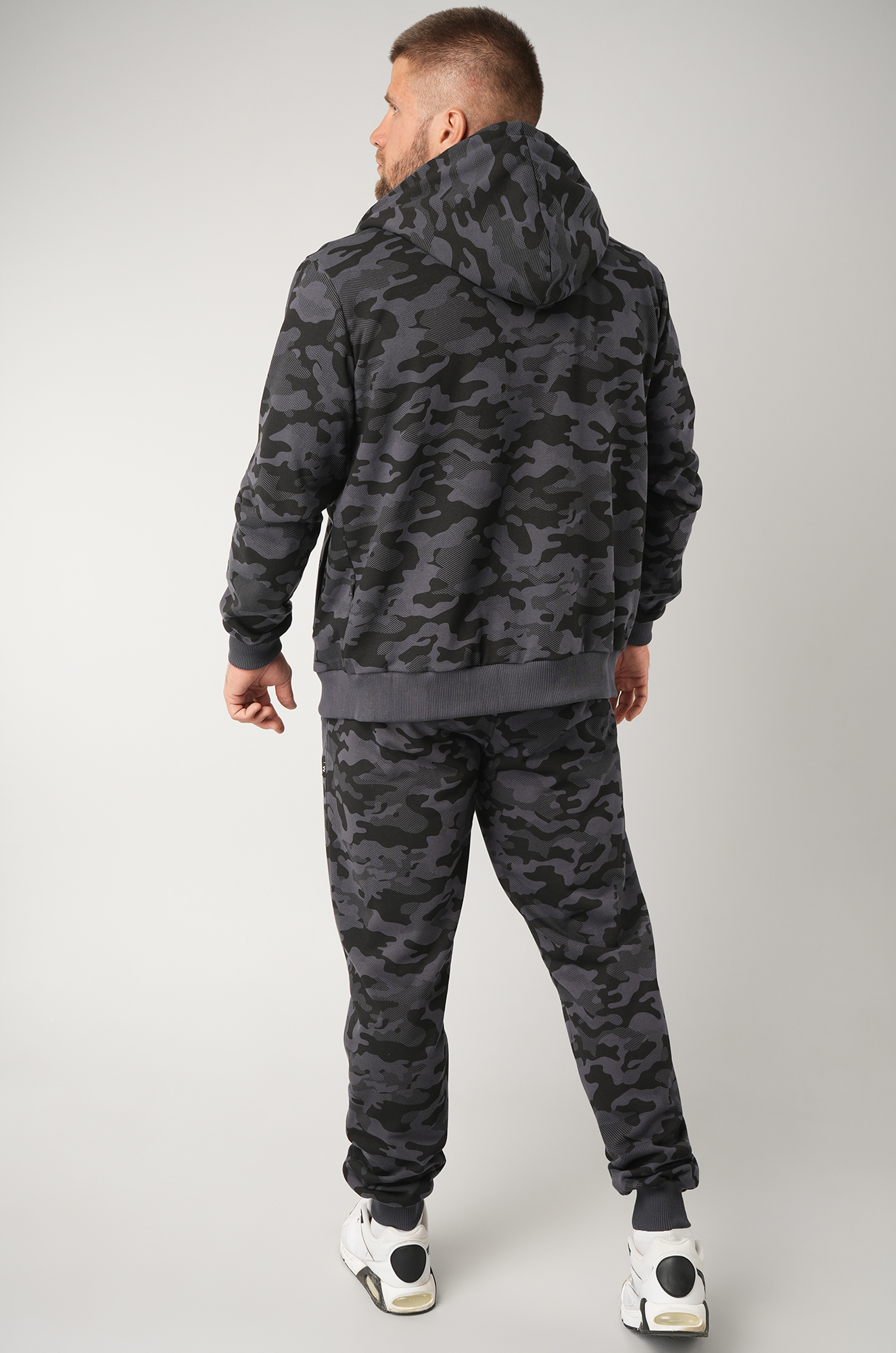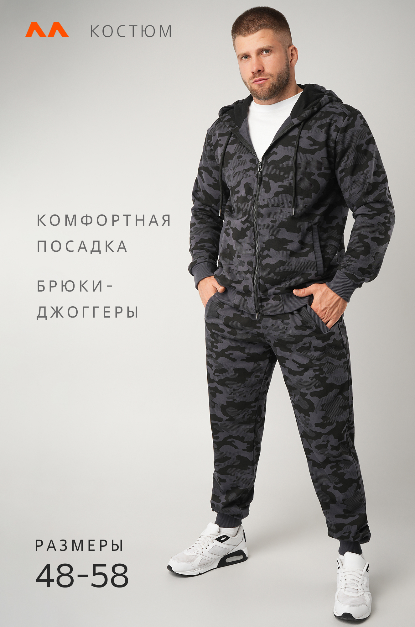 Мужской спортивный костюм выполнен из 100% хлопка, плотного футера трехнитки. Демисезонный камуфляжный костюм состоит из толстовки с капюшоном и брюк джоггеров. Мастерка с застежкой на молнию и карманами, капюшон регулируется по объему. Штаны дополнены карманами, пояс утягивается шнуром, по низу расположены эластичные манжеты.