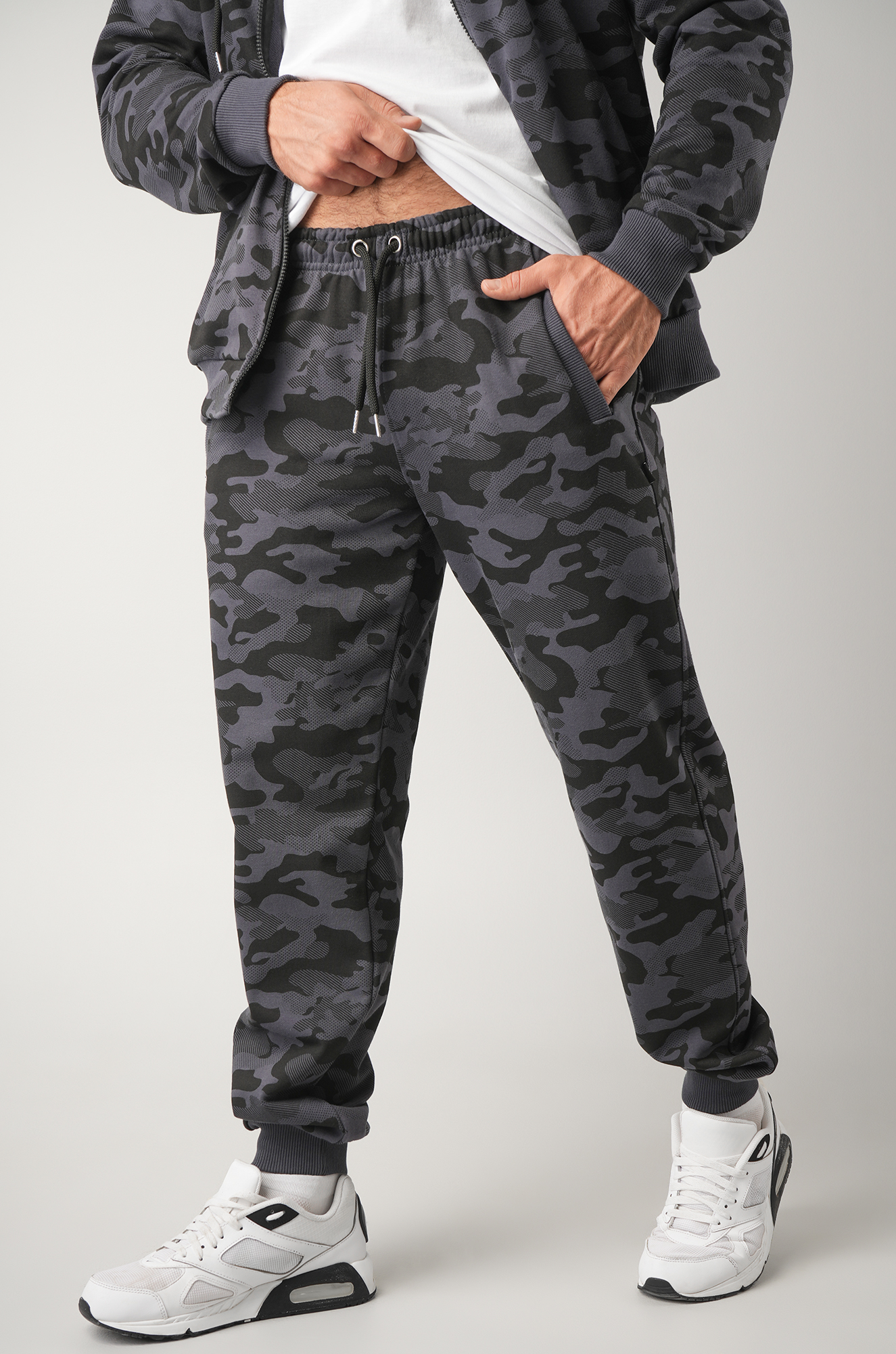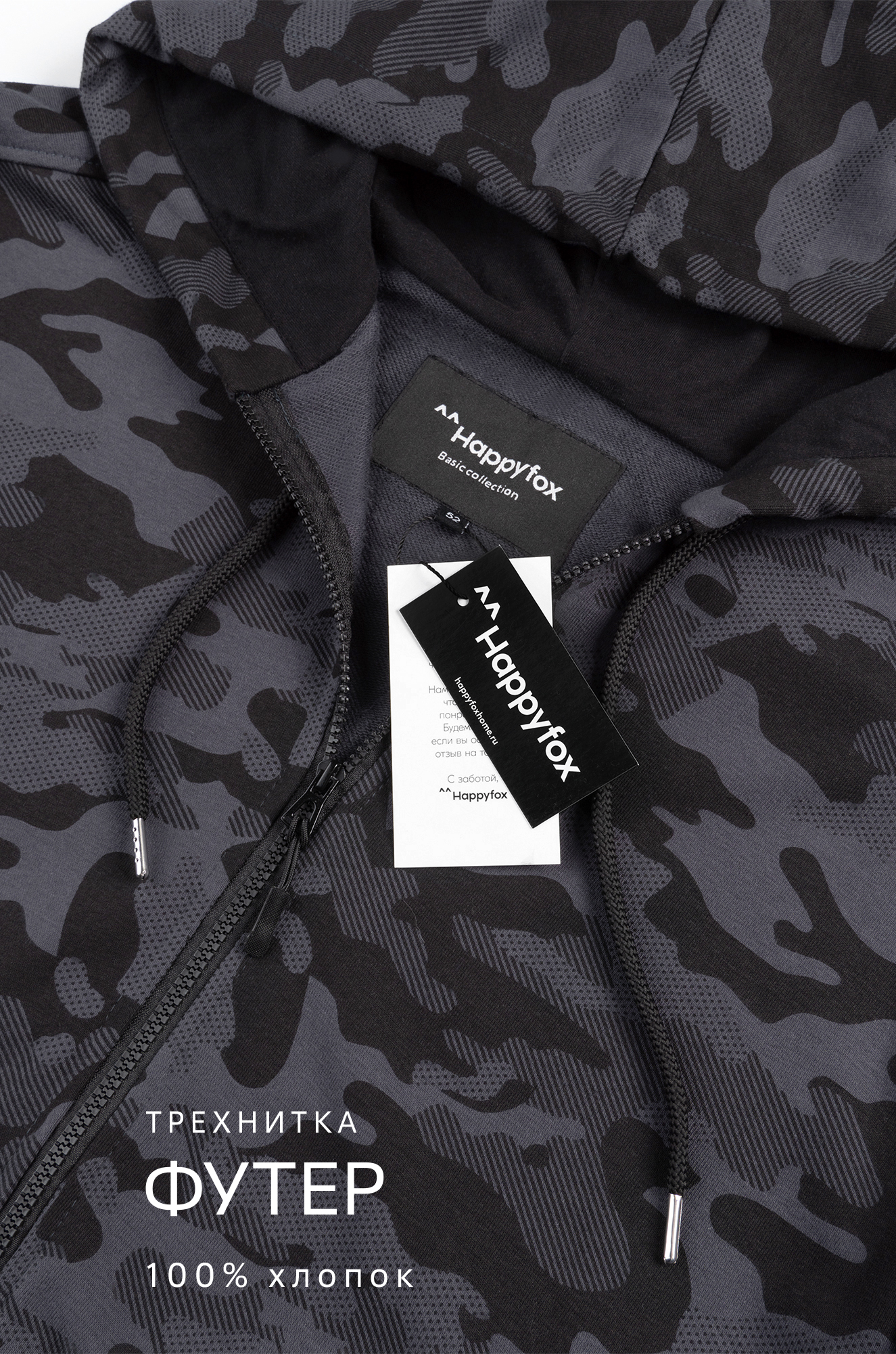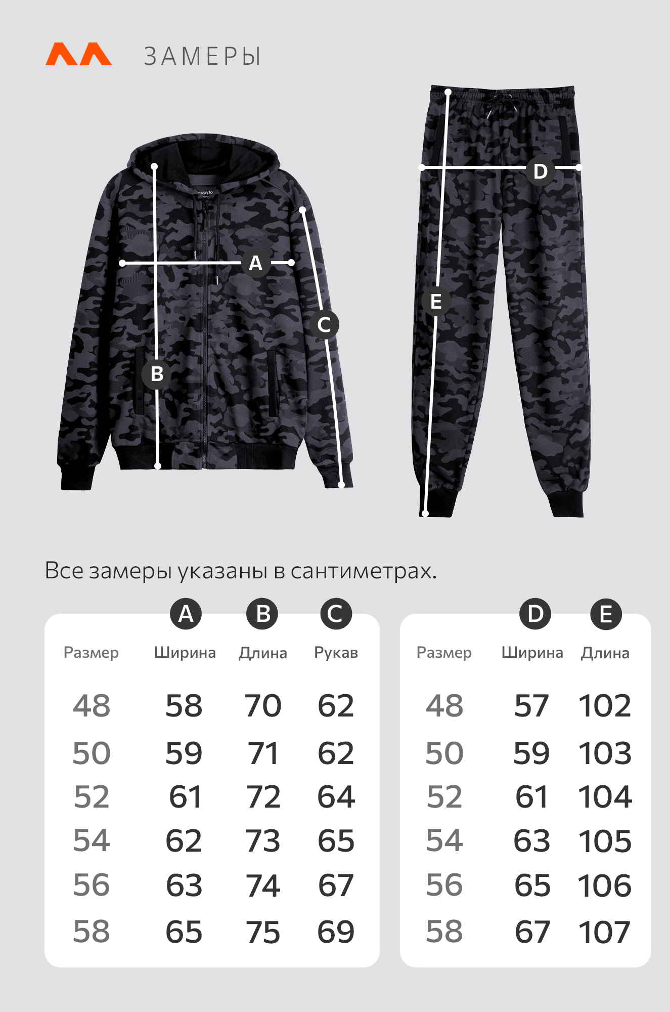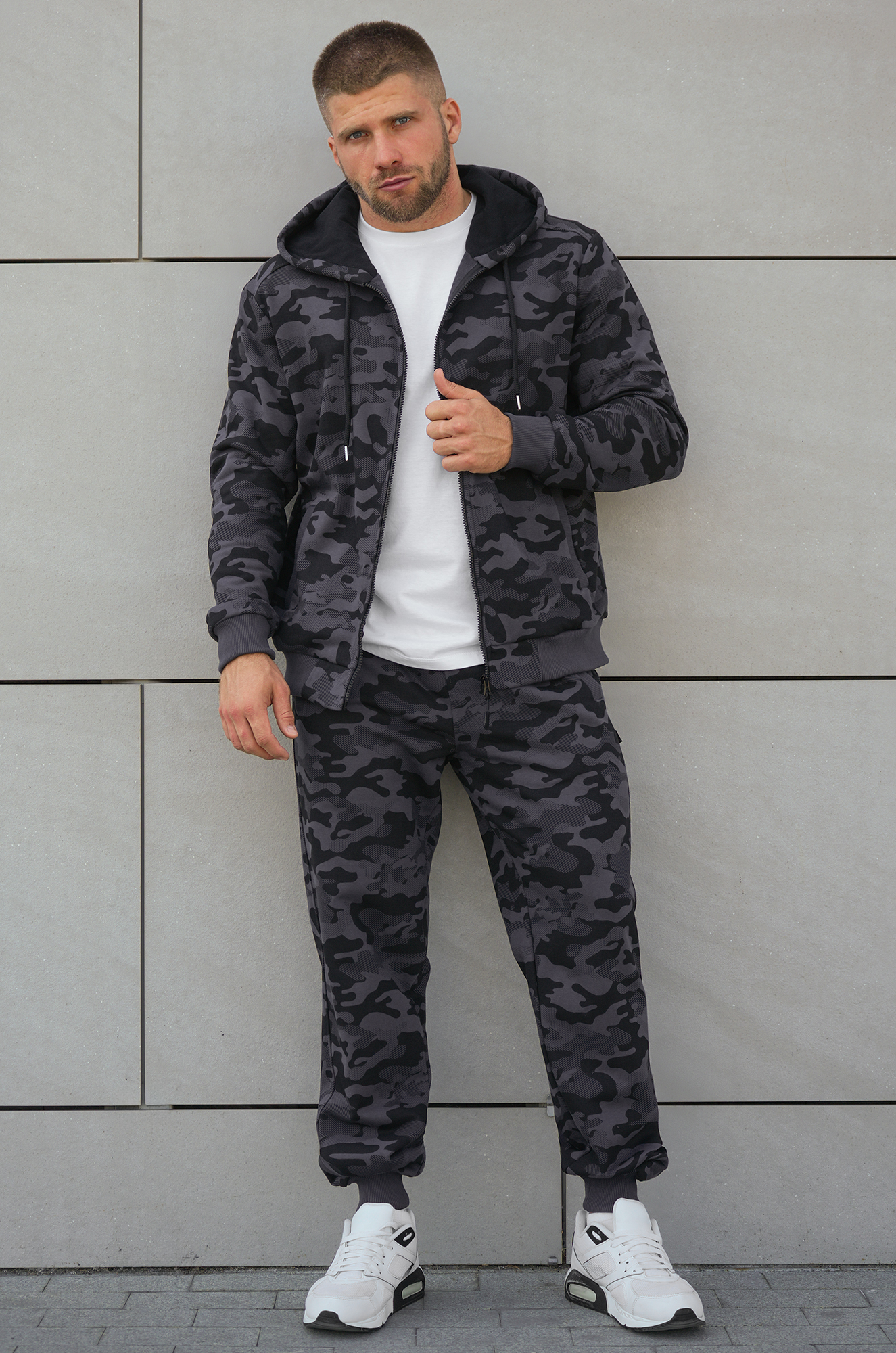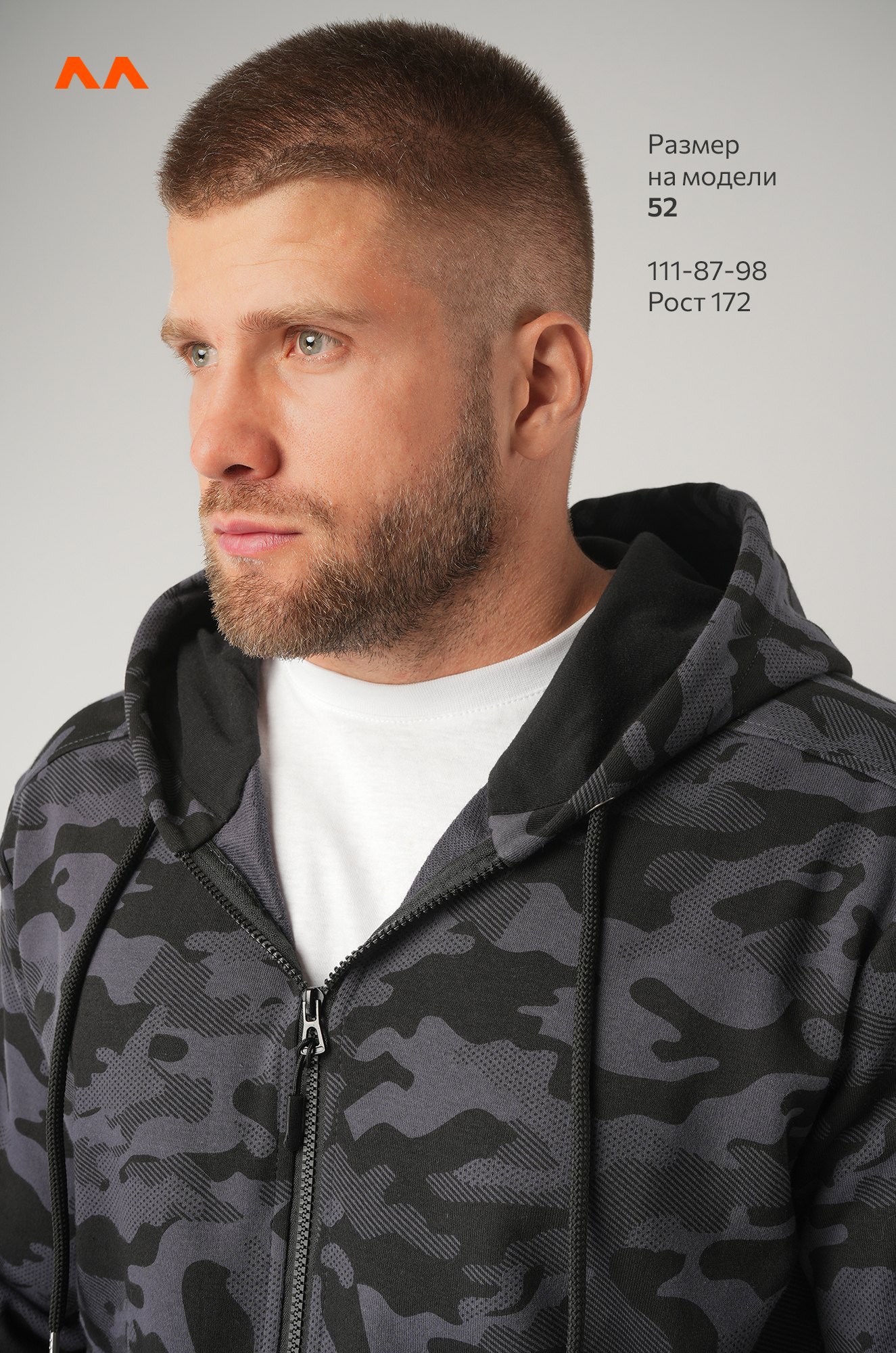 Мужской спортивный костюм выполнен из 100% хлопка, плотного футера трехнитки. Демисезонный камуфляжный костюм состоит из толстовки с капюшоном и брюк джоггеров. Мастерка с застежкой на молнию и карманами, капюшон регулируется по объему. Штаны дополнены карманами, пояс утягивается шнуром, по низу расположены эластичные манжеты.
