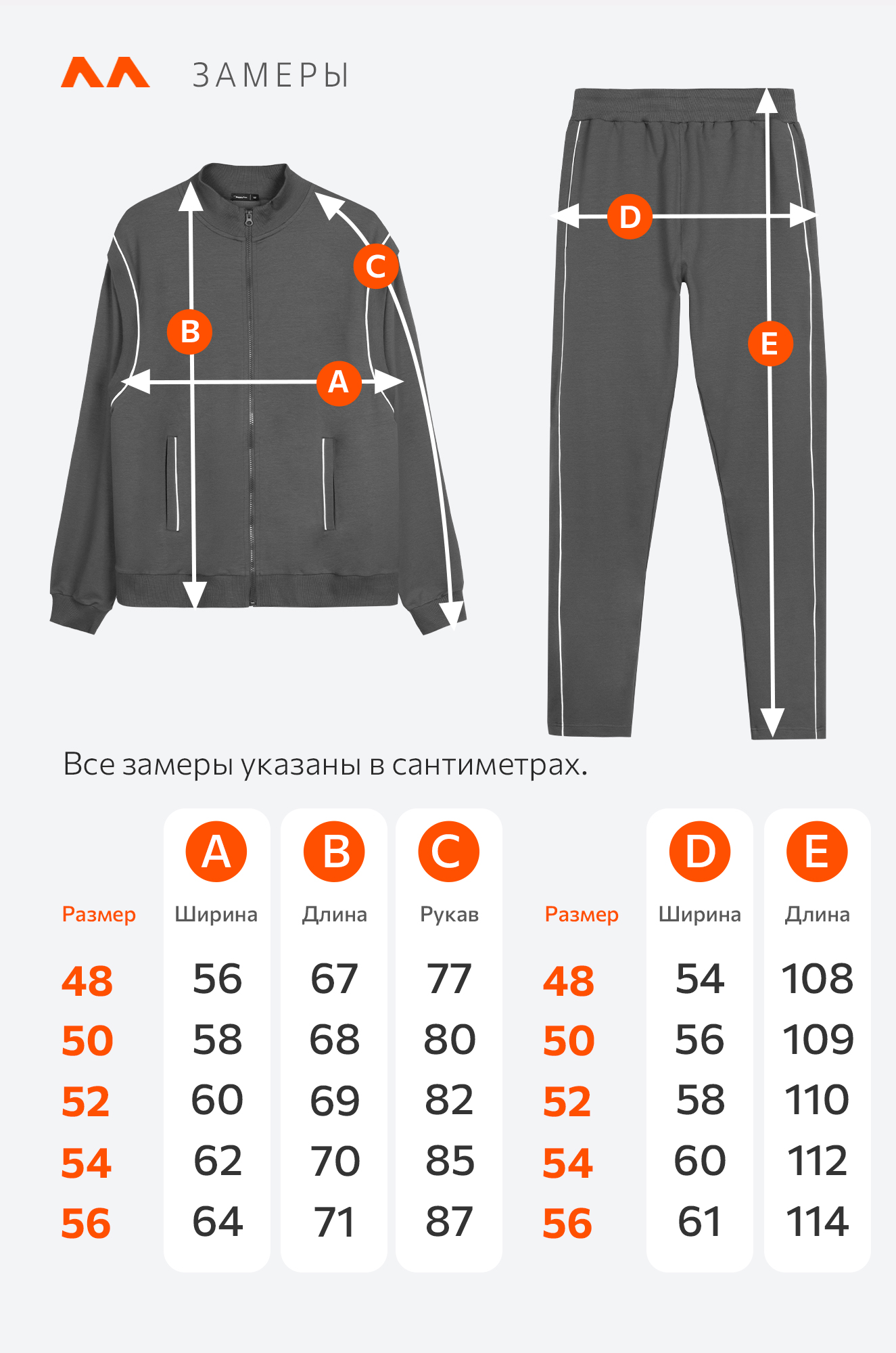 — в комплекте мастерка на молнии с воротником-стойкой, карманами и манжетами и спортивные штаны прямого кроя с поясом на резинке и утягивающим шнурком для максимального комфорта;