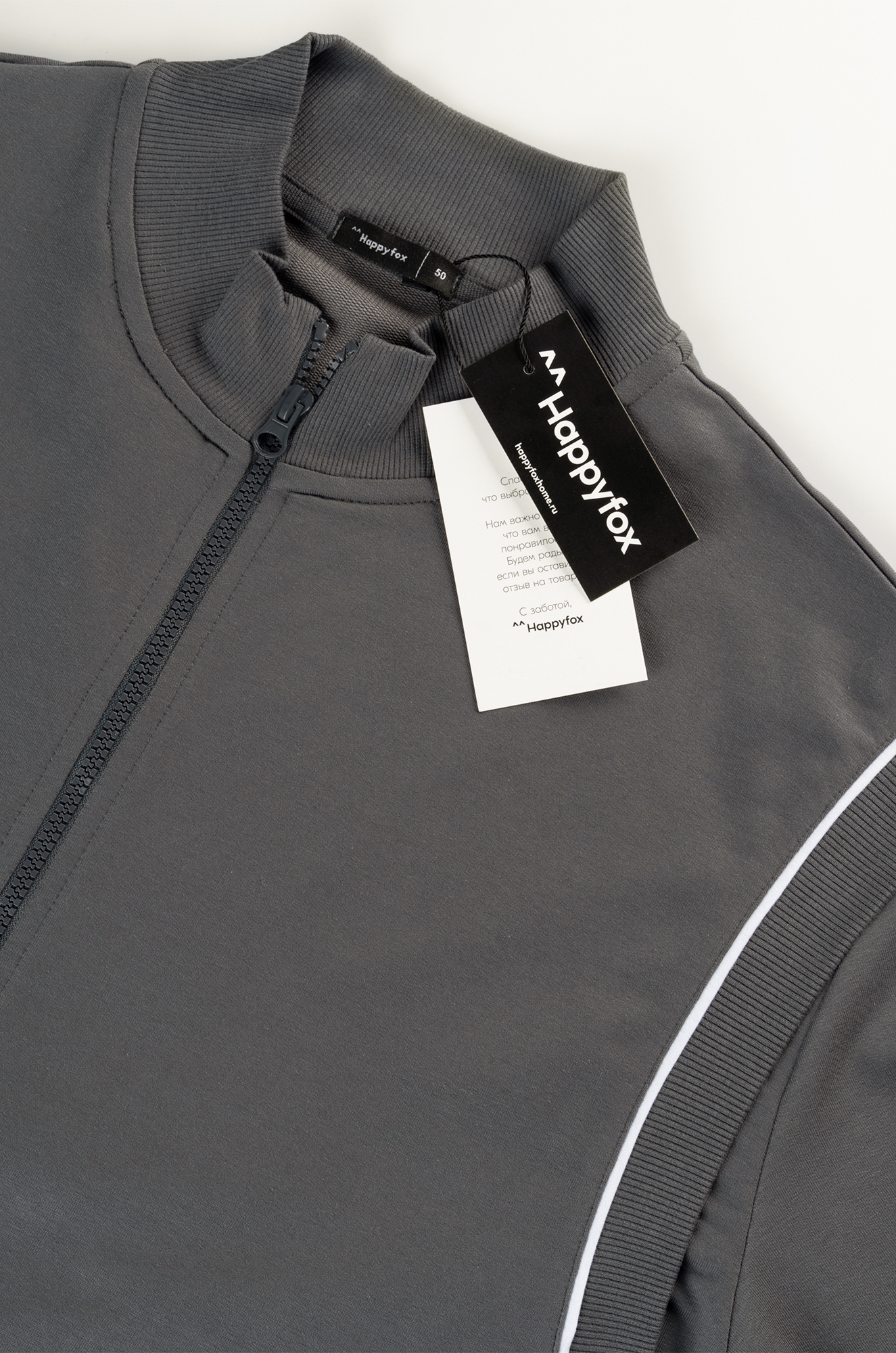 — базовый графитовый цвет, тонкие белые лампасы на брюках и декоративный кант на плечах создают актуальный образ;