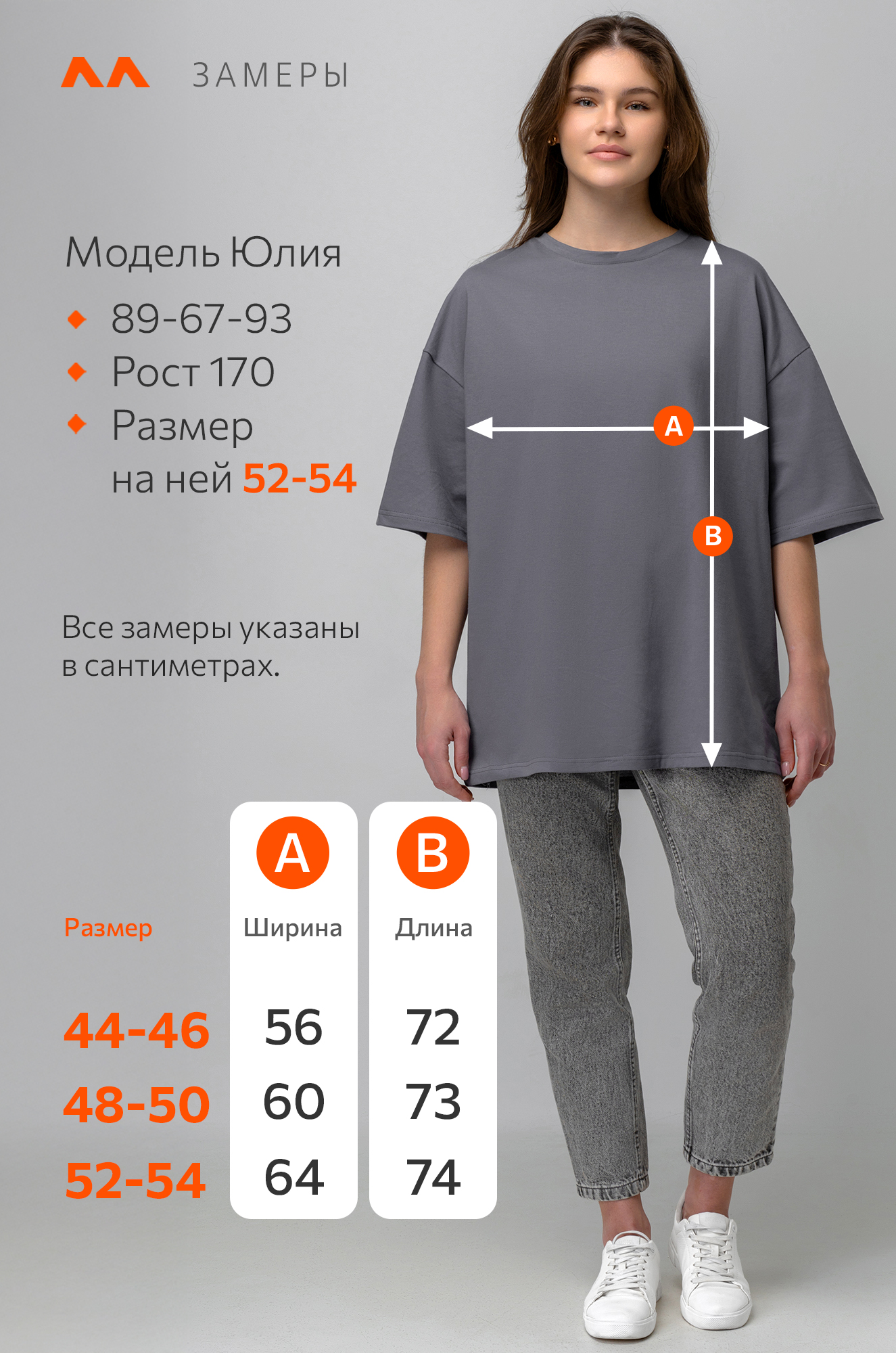 Модель Юлия, ее рост 170, параметры: 89-67-93. На ней размер 52-54.