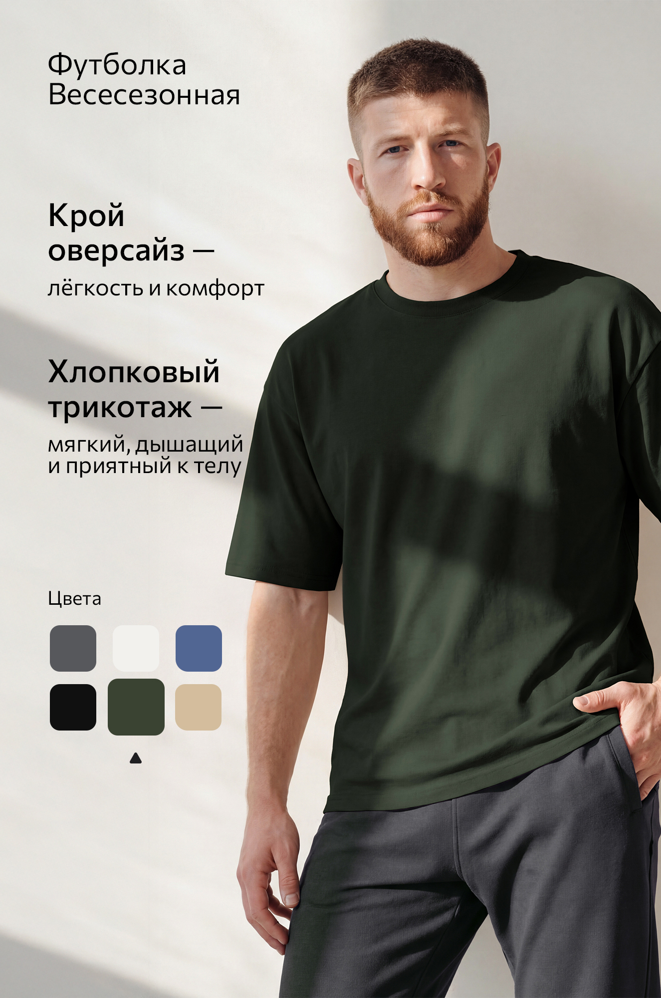 Мужская футболка оверсайз – комфорт и стиль каждый день. Плотная футболка из хлопка станет основой многослойных образов. Лаконичная футболка оттенка хаки — идеальный выбор для тех, кто ценит универсальность и классический дизайн. Плотный трикотаж (310 г/м²) и свободный силуэт делают футболку незаменимой для стильных образов.