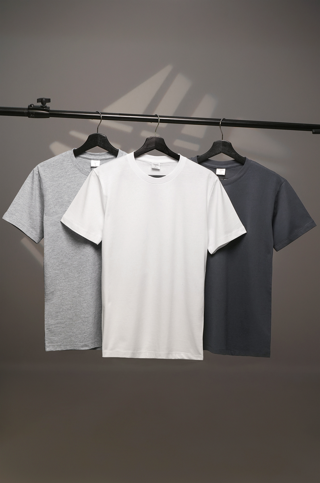 Чистый хлопок, чёткий силуэт и практичные цвета — три базовых футболки для комфортного и стильного дня. Набор из 3 мужских футболок представлен в разных цветах: белый, тёмно-серый и светло-серый.