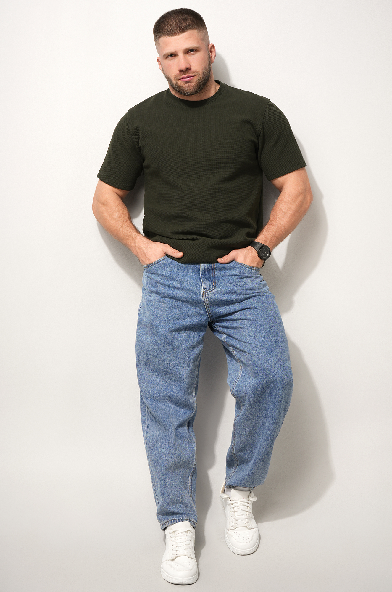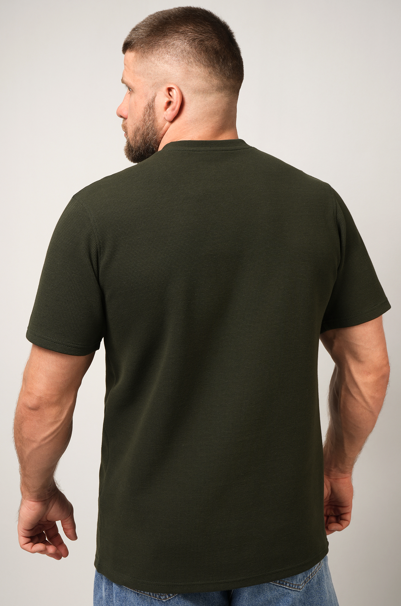 Мужская базовая футболка — идеальная основа гардероба. Вафельная футболка выглядит стильно за счёт фактурного трикотажа и отлично вписывается в кэжуал образы. Футболка цвета хаки для мужчин сочетает комфорт, практичность и минимализм.