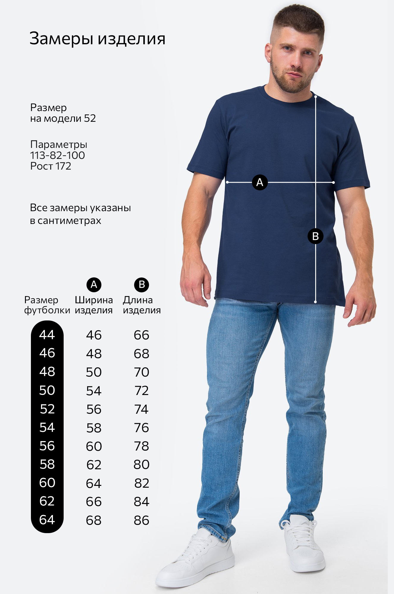 Модель Артем, его рост 172 см, параметры: 113-82-100 см. На нем футболка 52 размера.