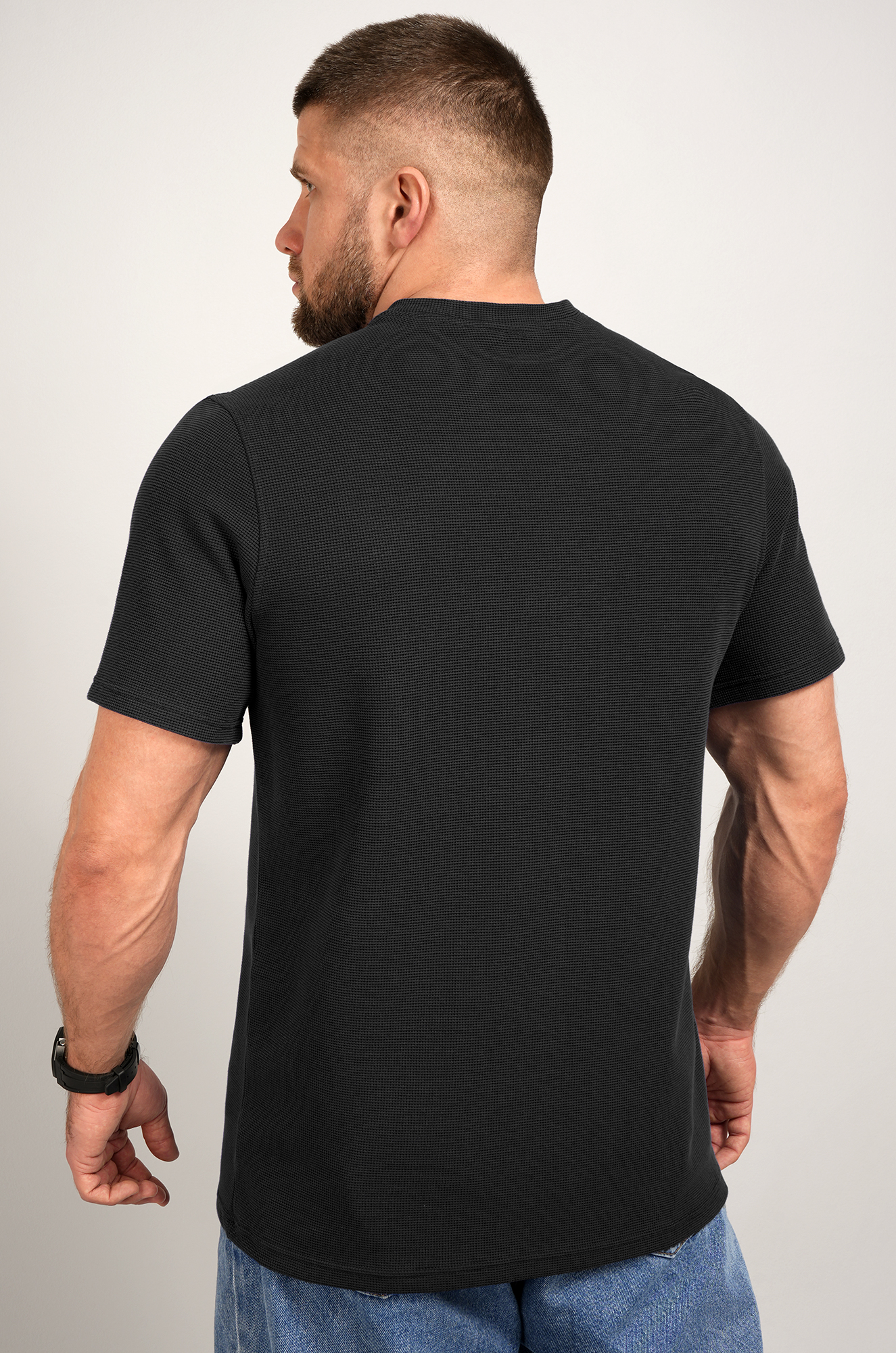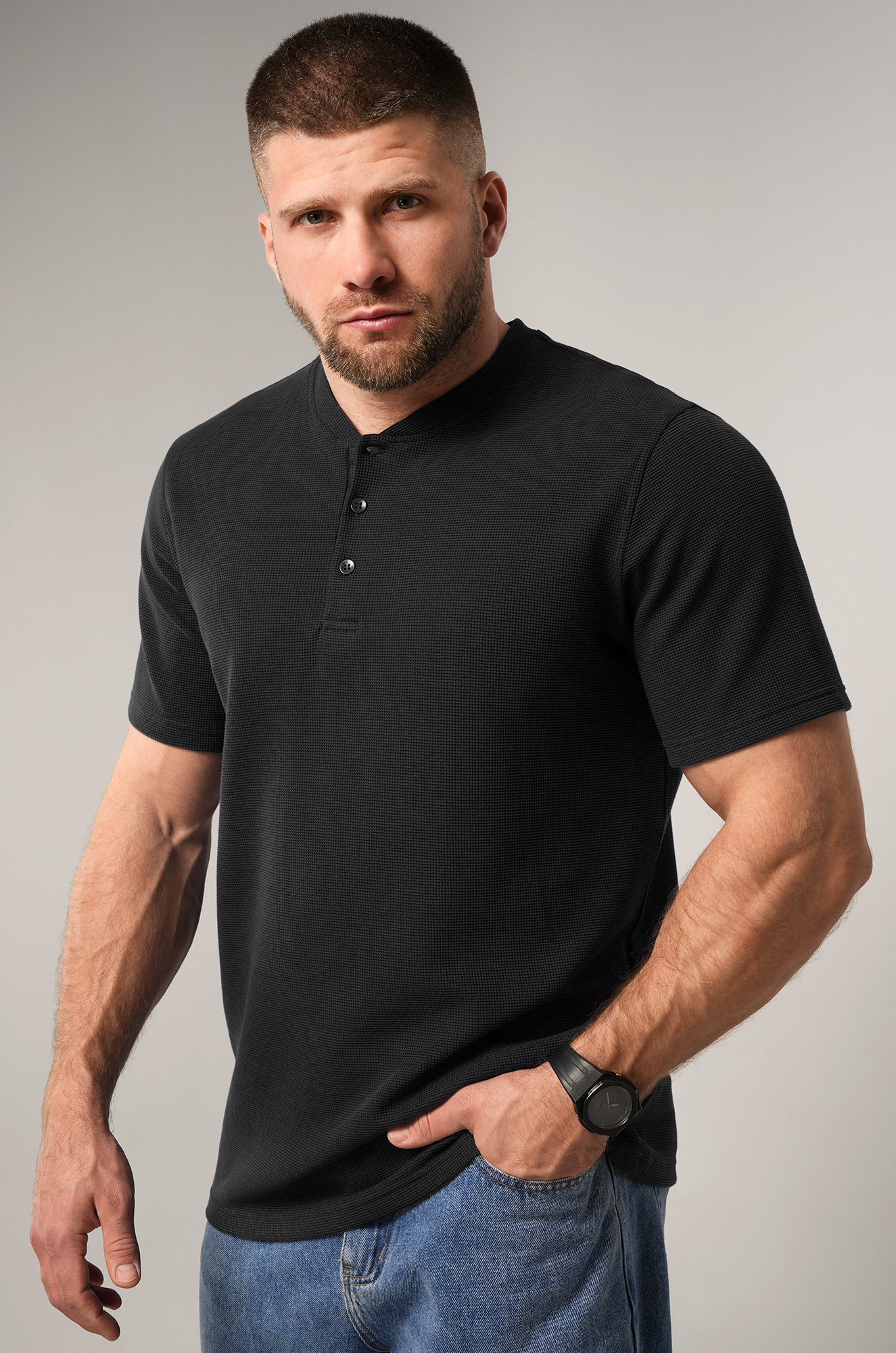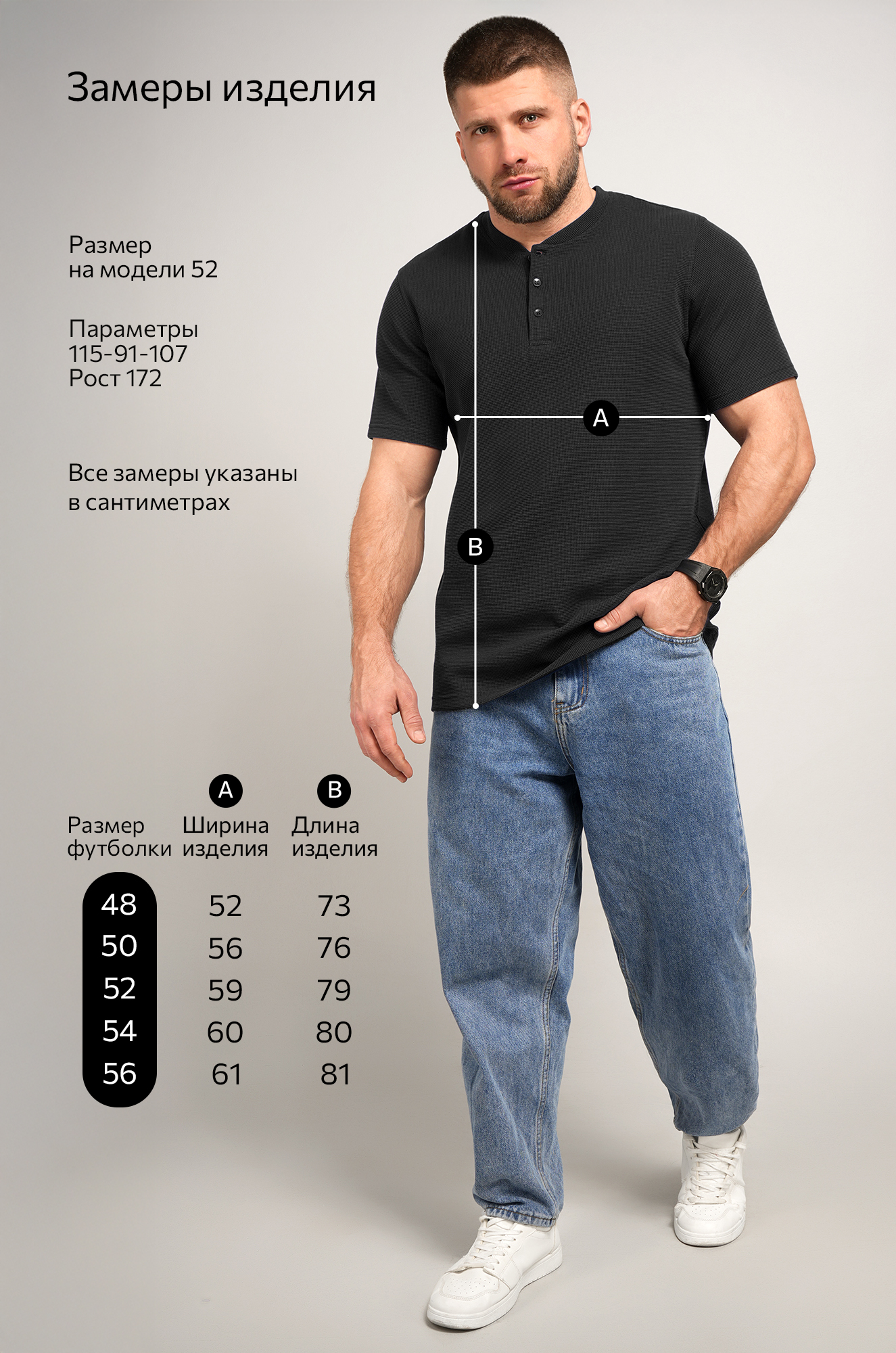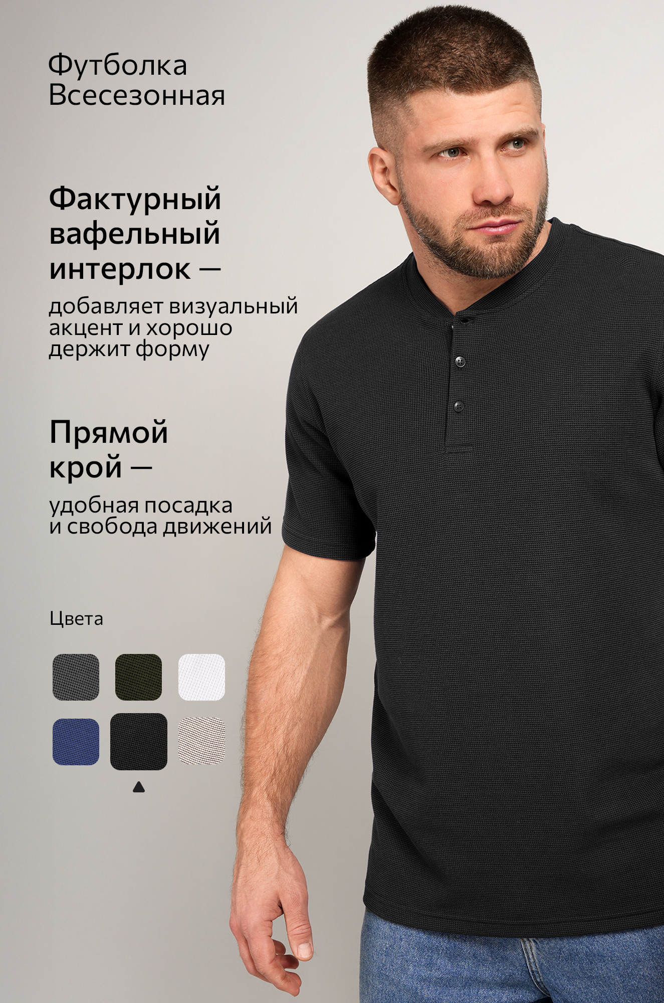 Мужская футболка поло — удобная базовая классика! Стильная модель с оригинальным вырезом хенли легко впишется в повседневный гардероб. Черный цвет и универсальный крой делают футболку идеальной для офиса и на каждый день.