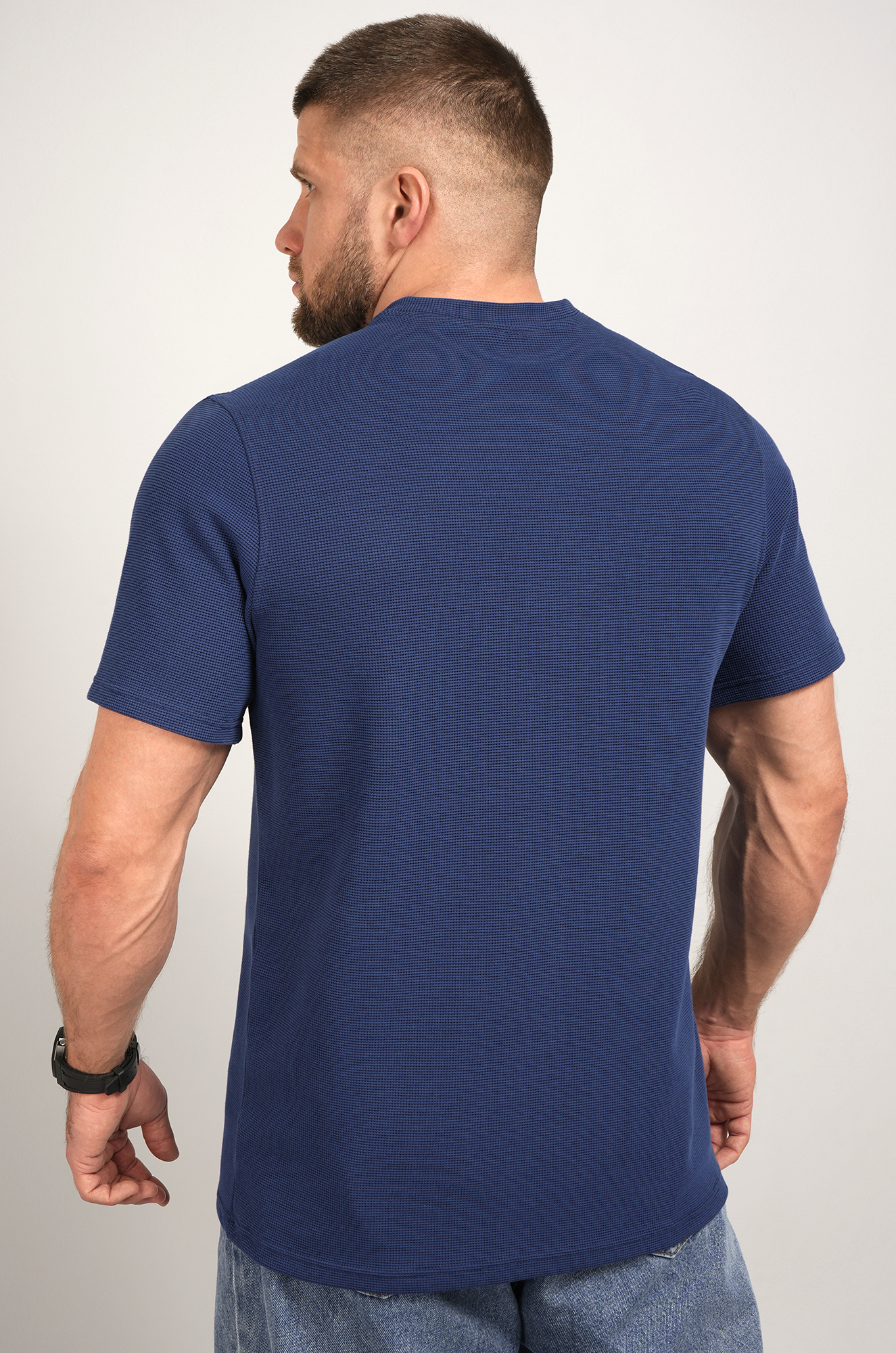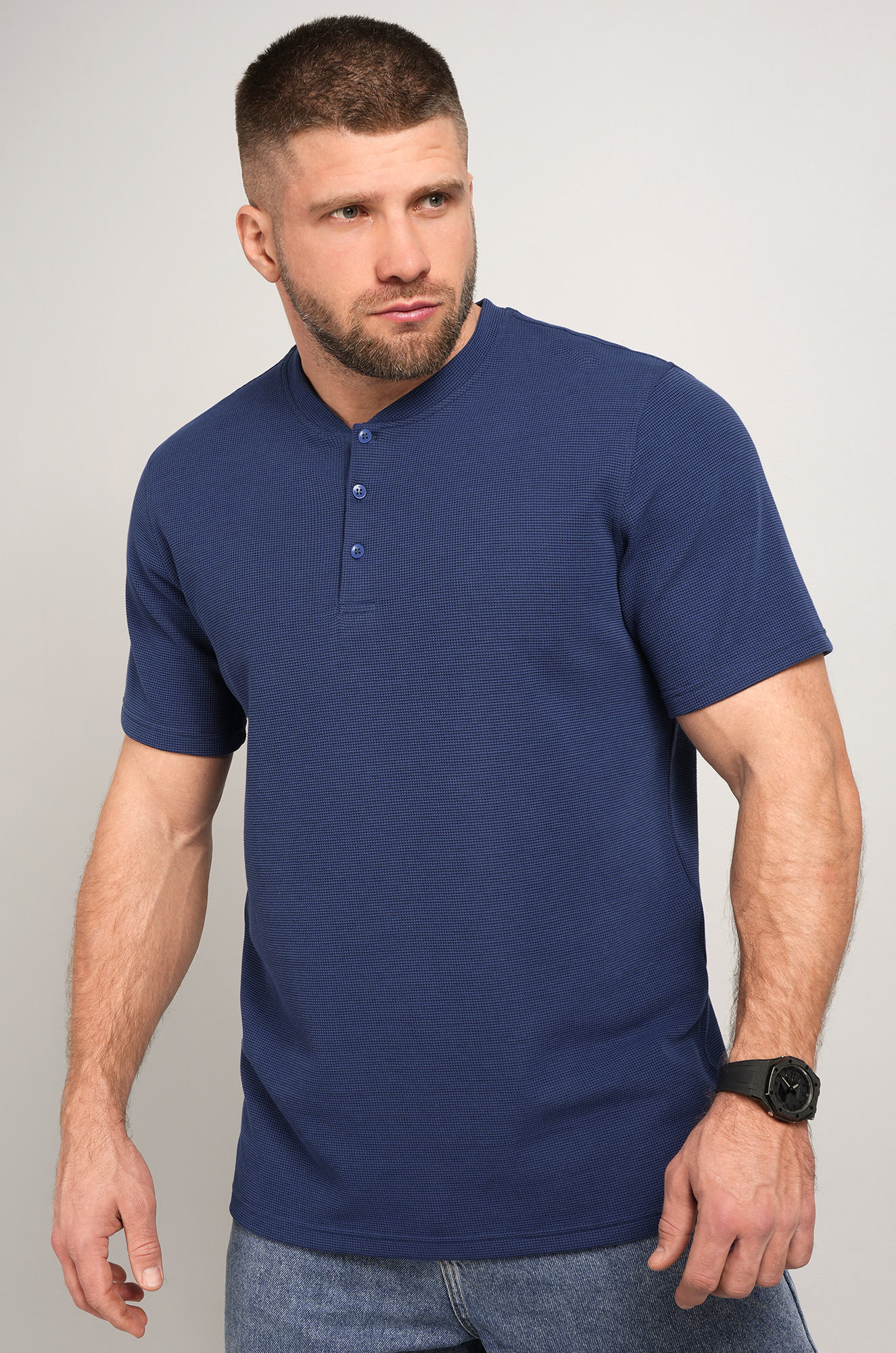 Мужская футболка поло — удобная базовая классика! Стильная модель с оригинальным вырезом хенли легко впишется в повседневный гардероб. Синий цвет и универсальный крой делают футболку идеальной для офиса и на каждый день.